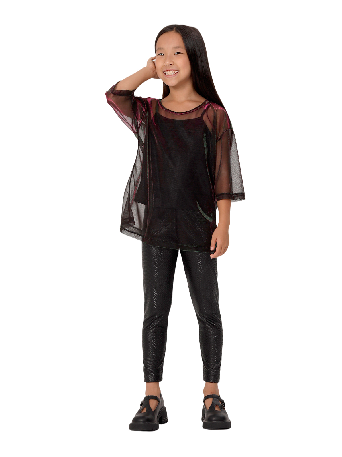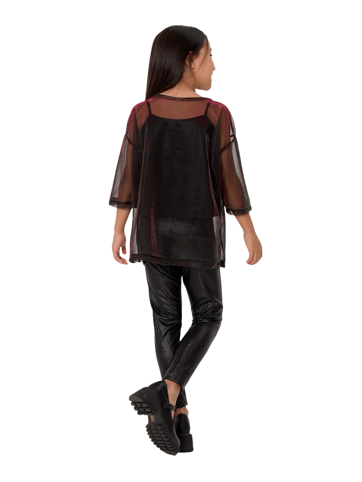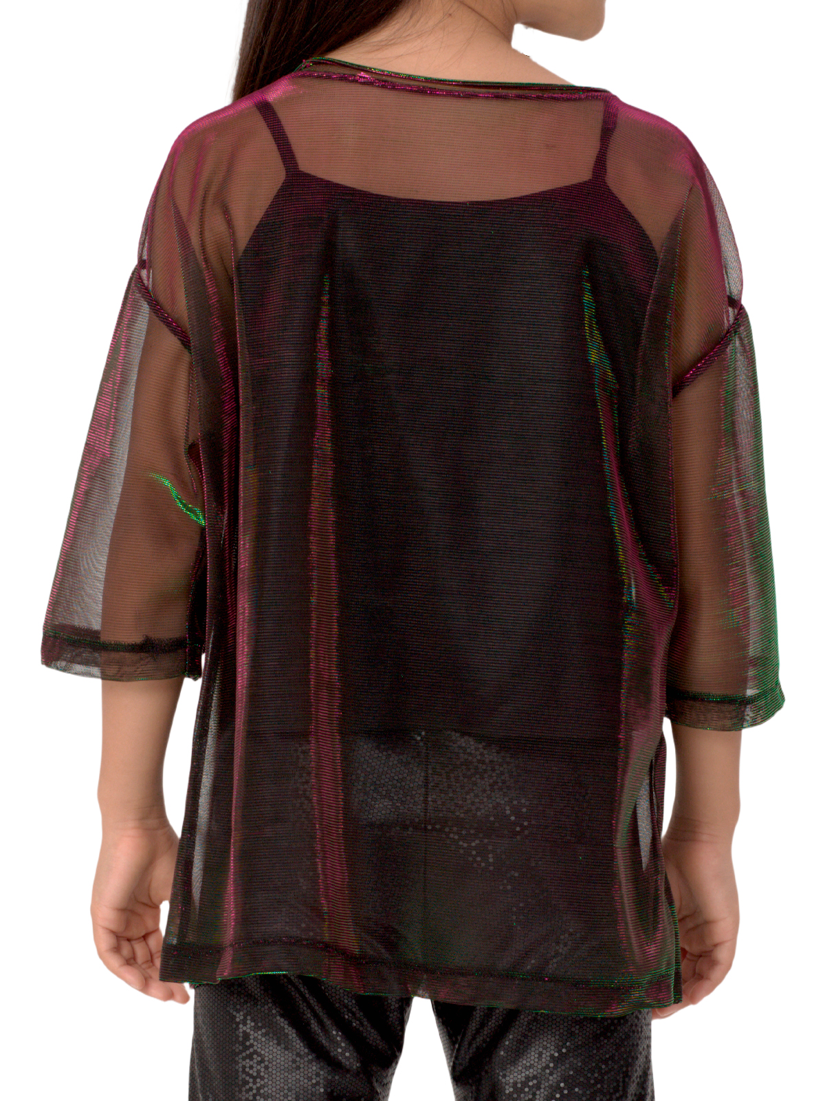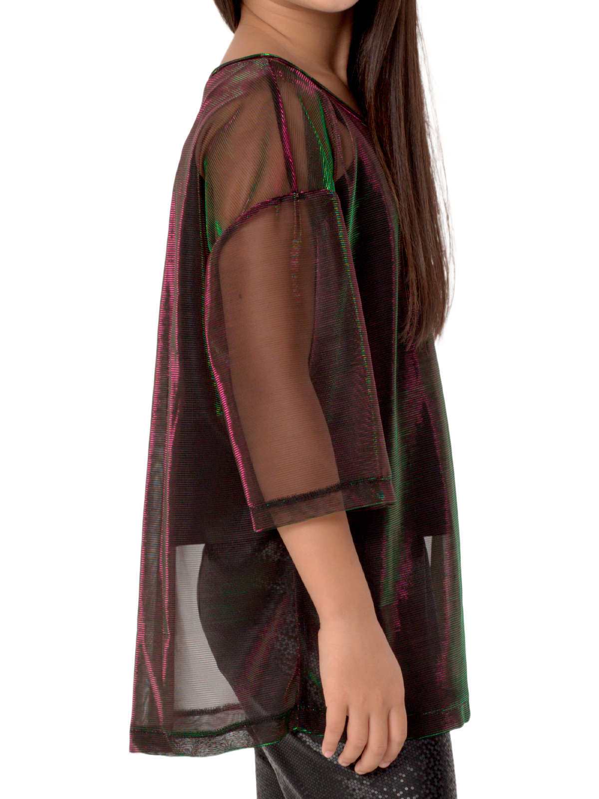 Нарядный джемпер из переливающейся ткани и трикотажного топа; верхний джемпер оверсайз с притачной бейкой по горловине. Состав нижнего топа 95% хлопок, 5% ПУ.