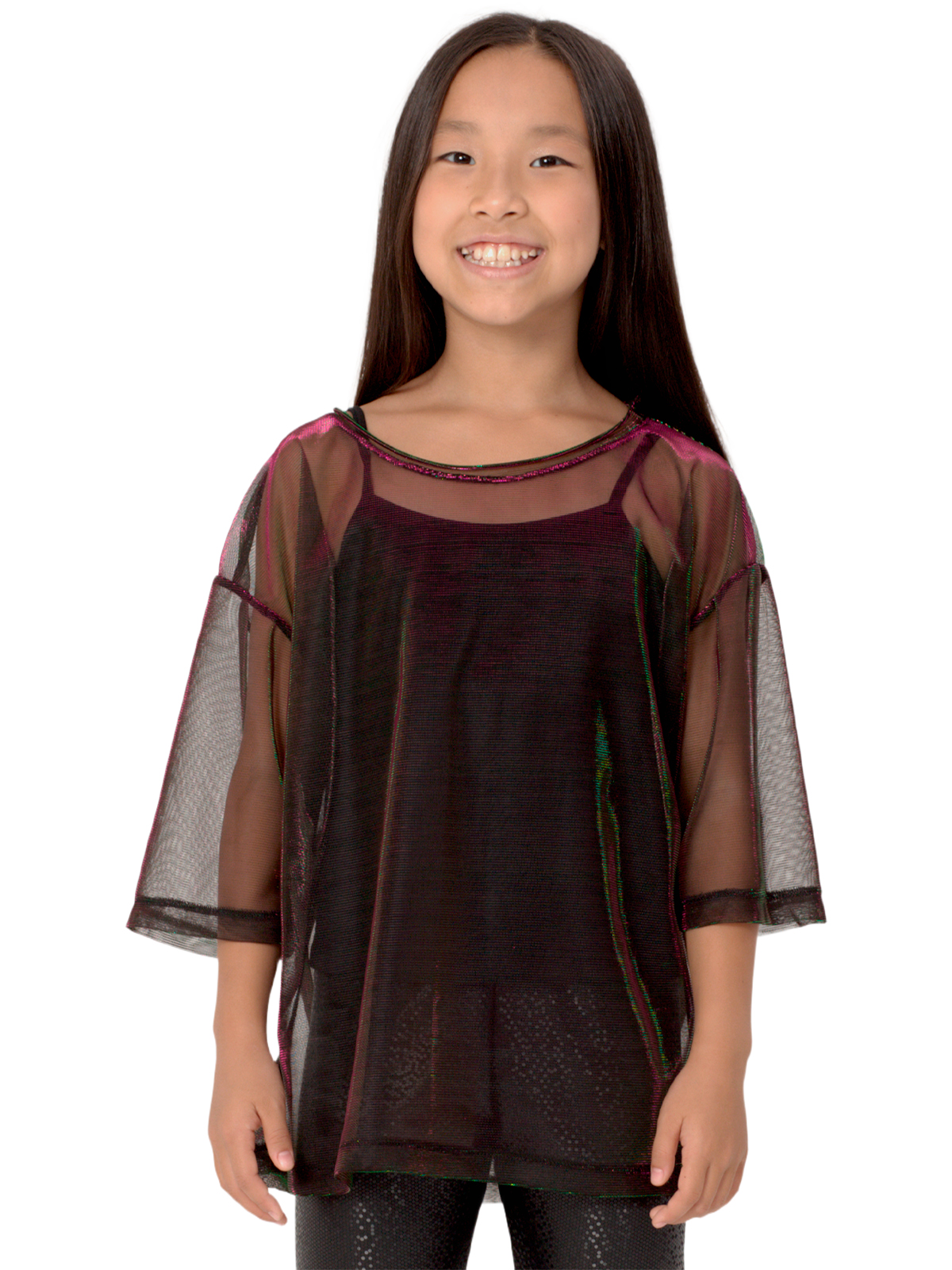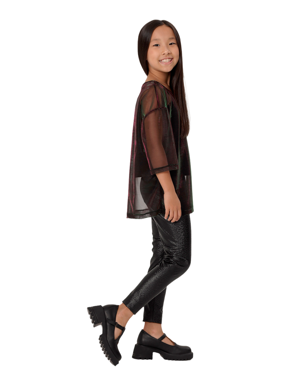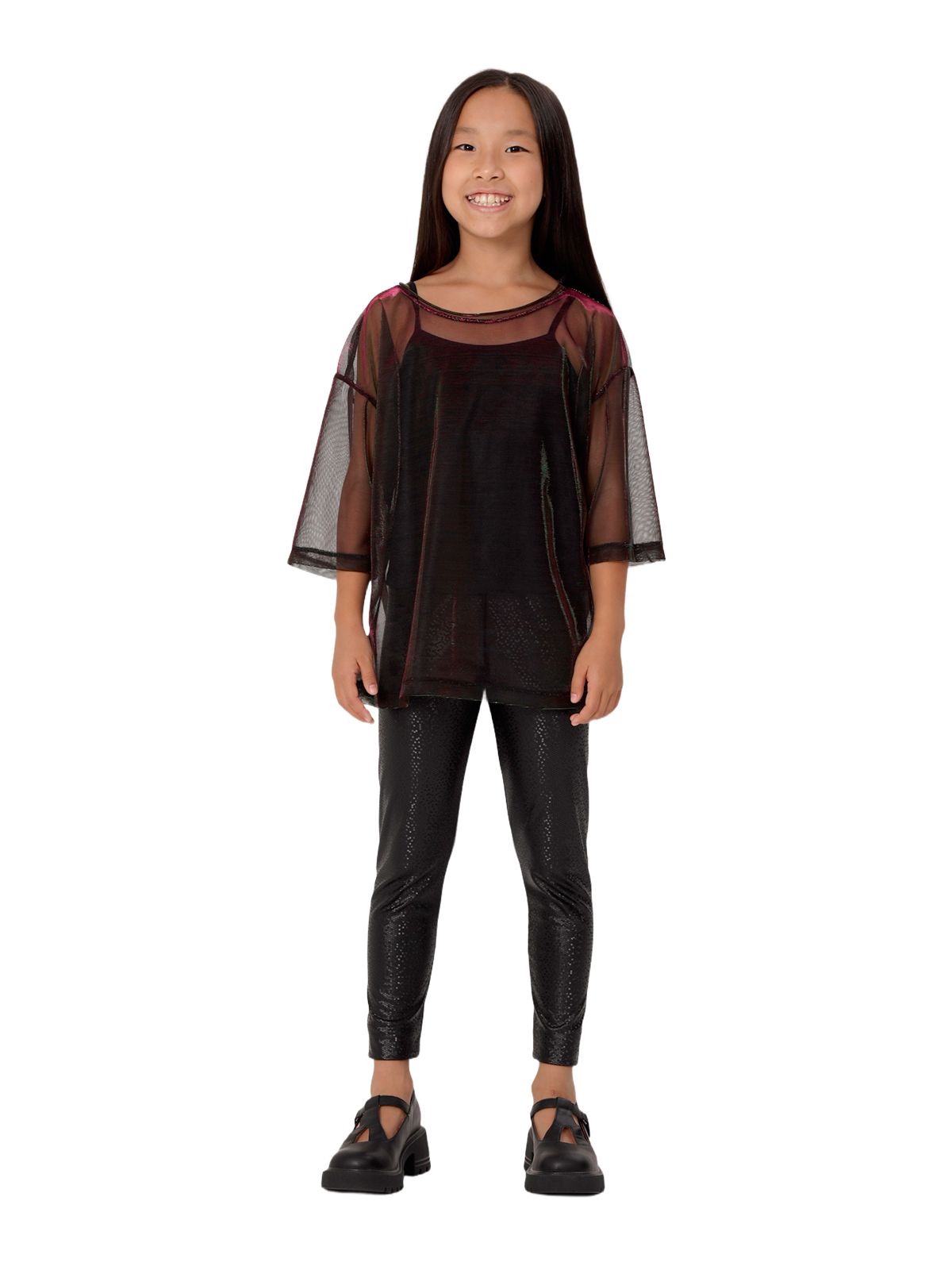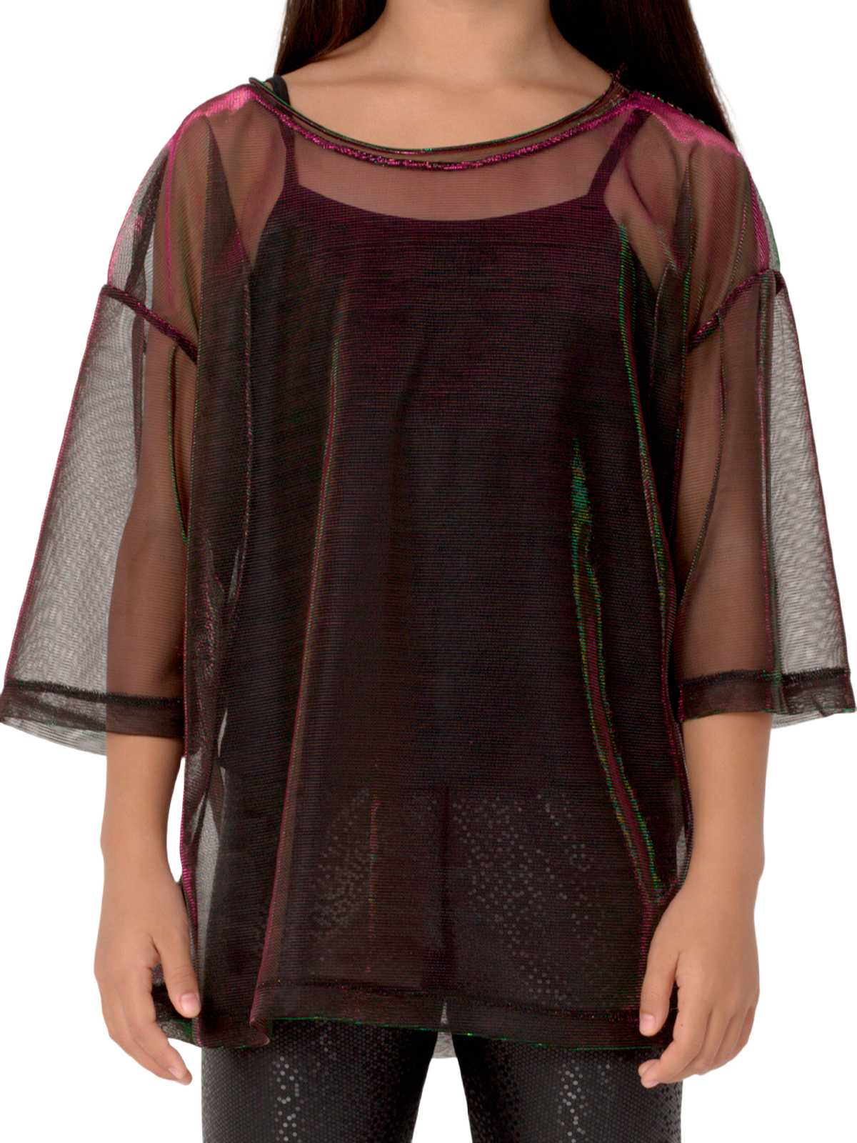Нарядный джемпер из переливающейся ткани и трикотажного топа; верхний джемпер оверсайз с притачной бейкой по горловине. Состав нижнего топа 95% хлопок, 5% ПУ.