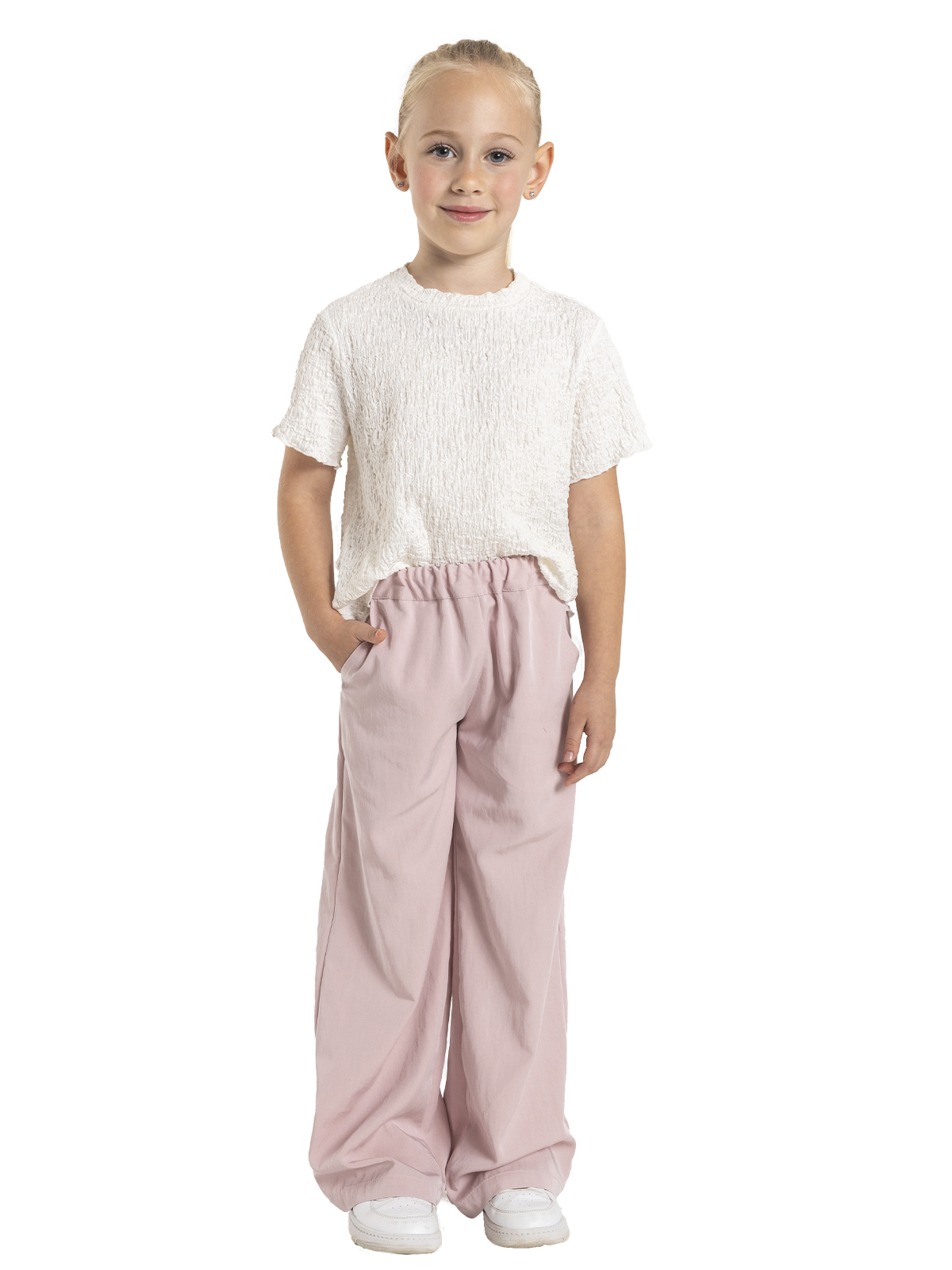 Широкие брюки из смесовой ткани, притачной пояс с регулировкой размера с помощью эластичной ленты на пуговицах, на передних половинках карманы с отрезными деталями.