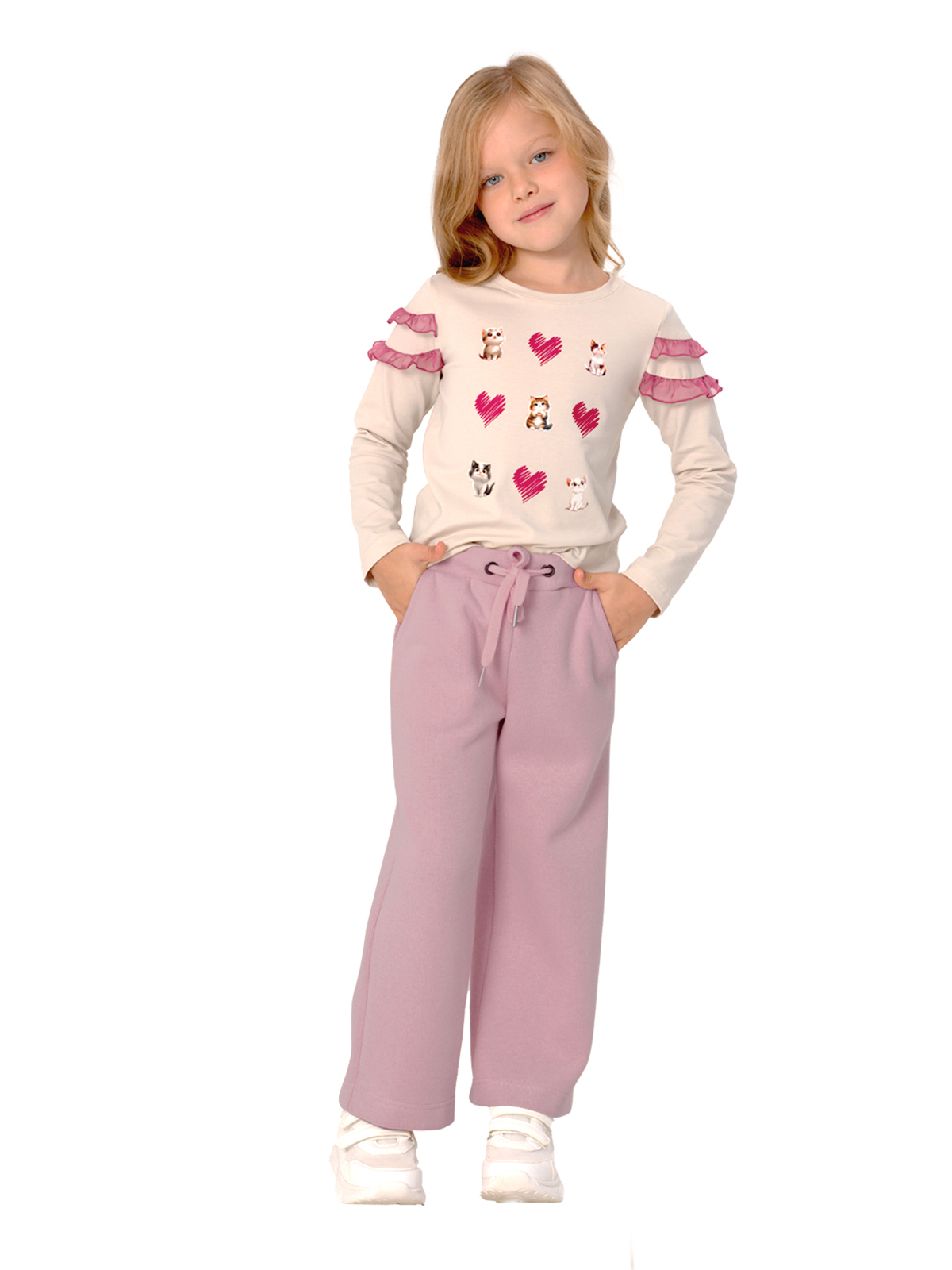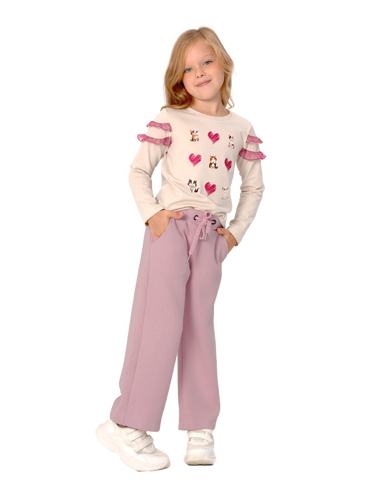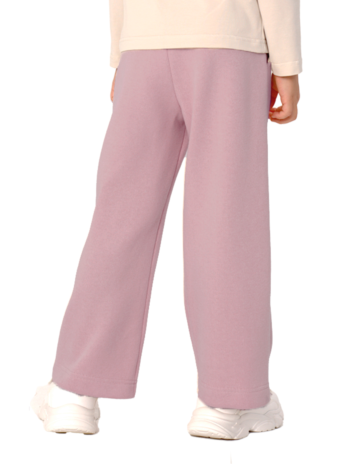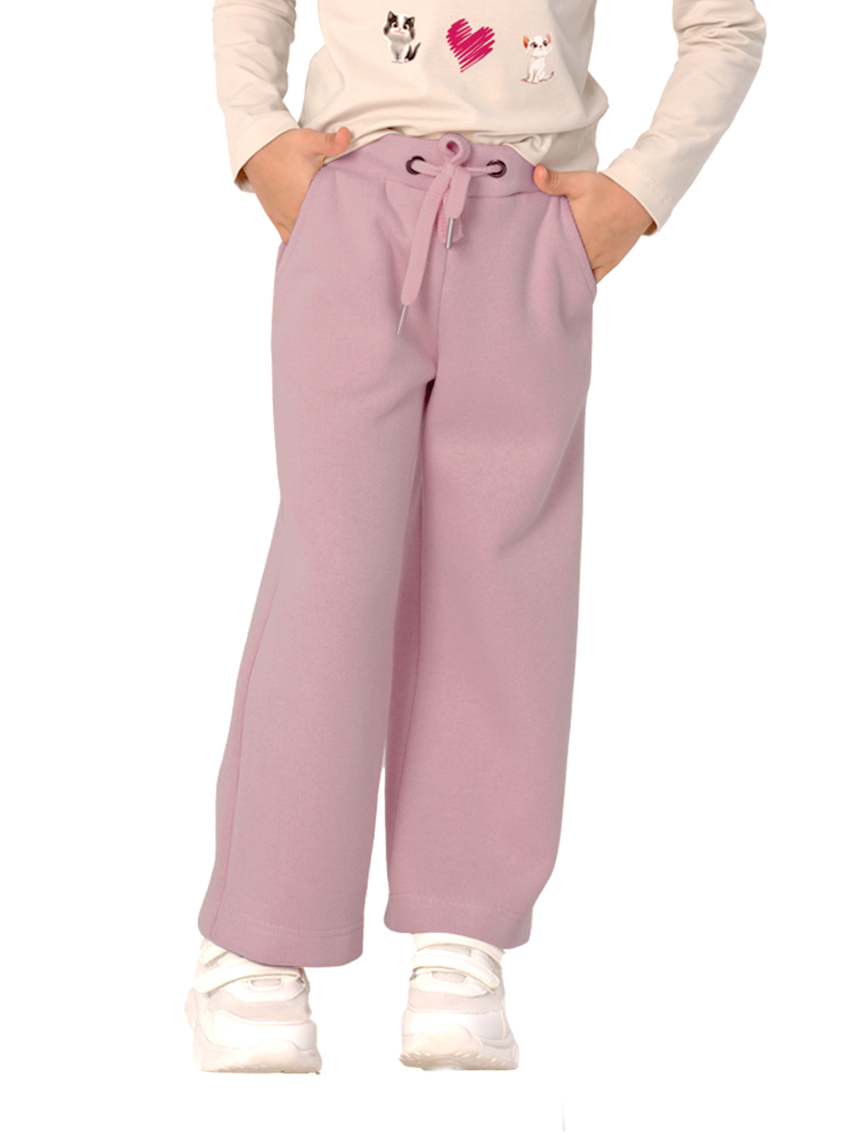 Широкие брюки из плотного, фактурного трикотажа, притачной пояс с эластичной лентой внутри и шнурком, на передних половинках карманы с отрезными деталями.