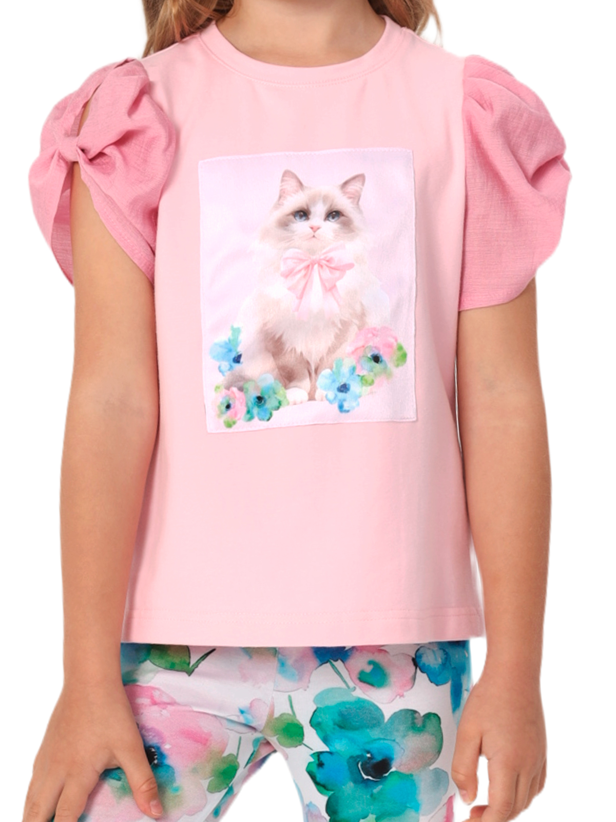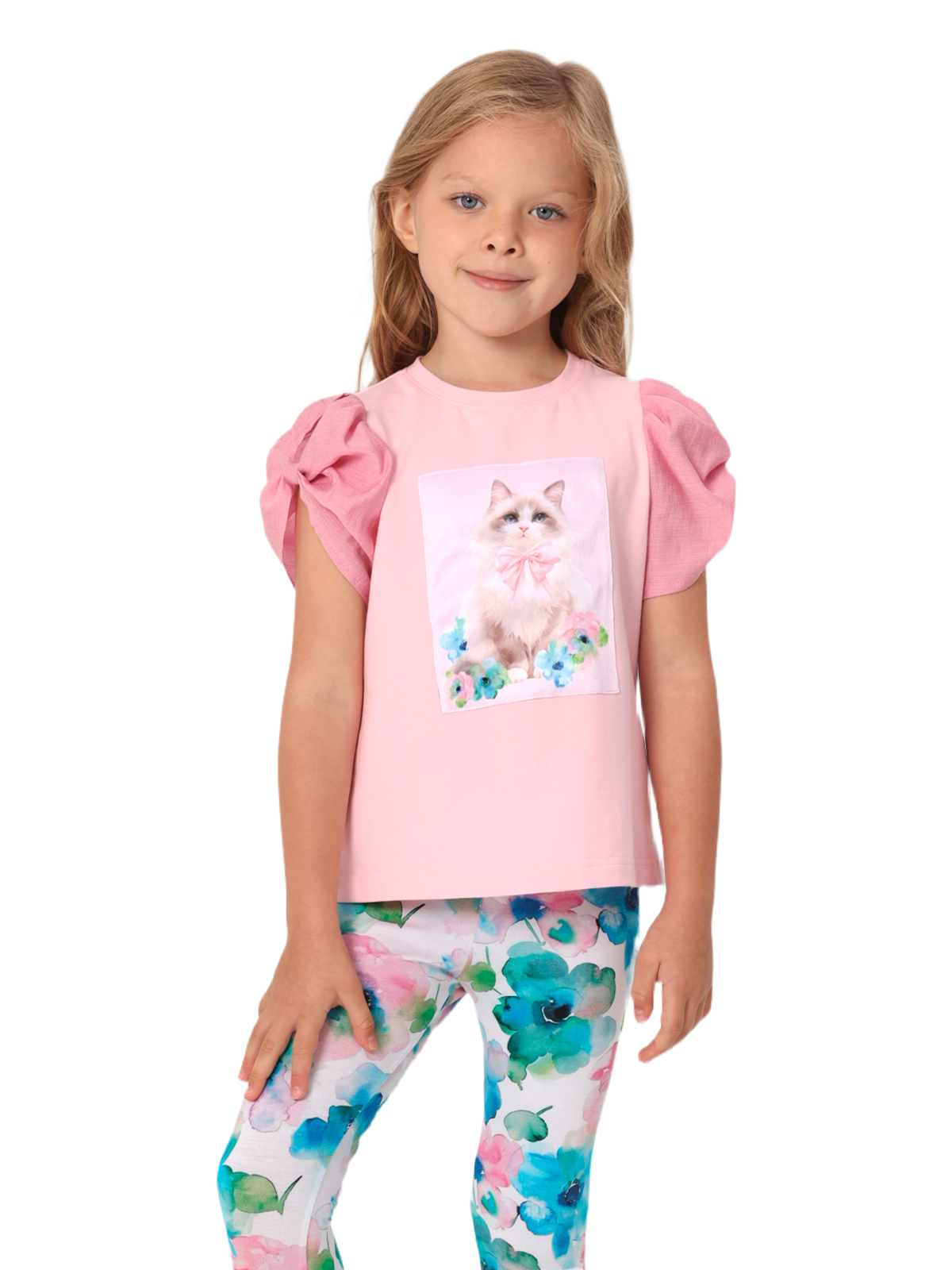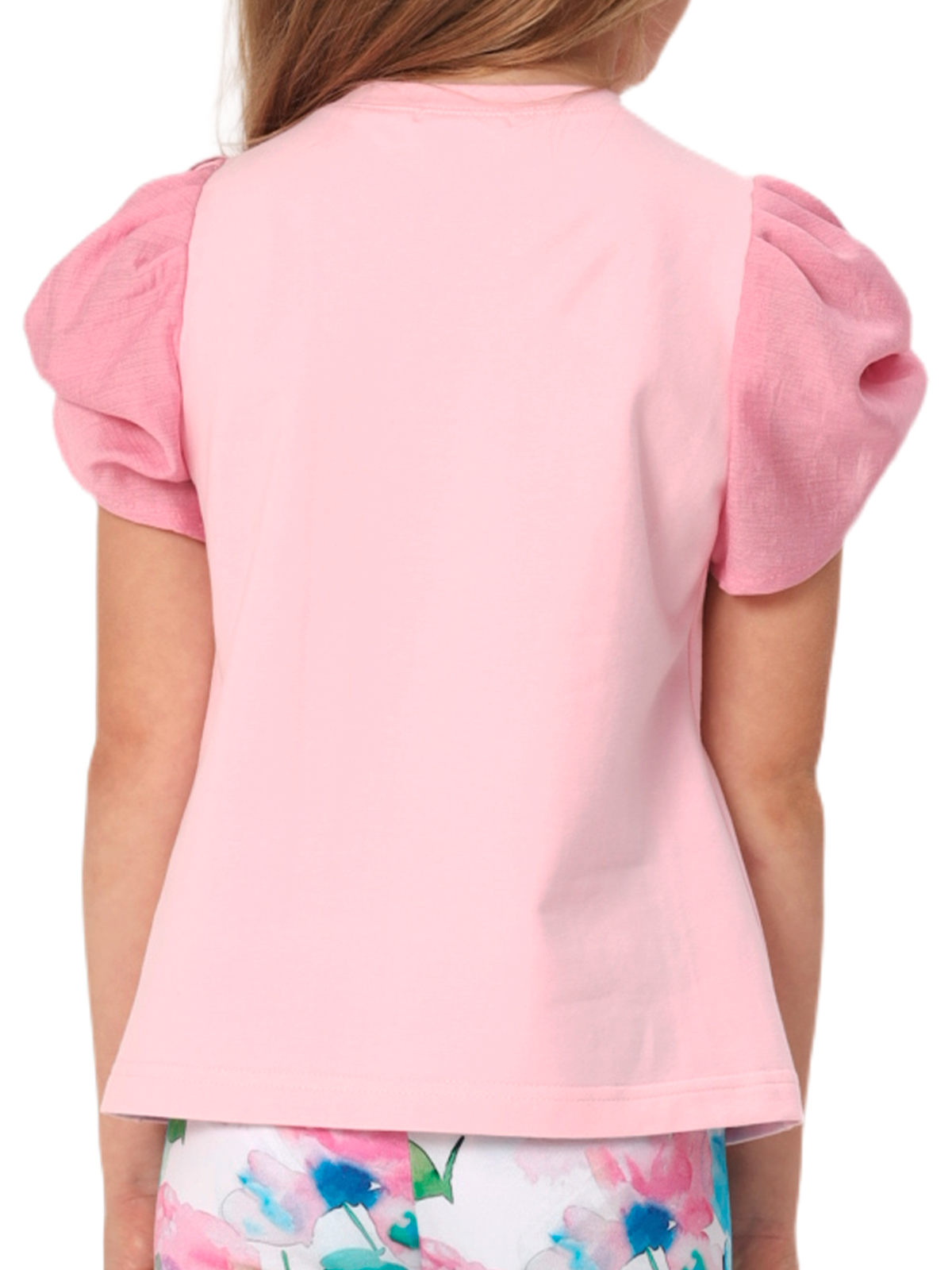 Джемпер из тонкого трикотажа, короткие рукава из легкой ткани со сборкой, имитация банта, по горловине притачивается бейка, на полочке нашивка.