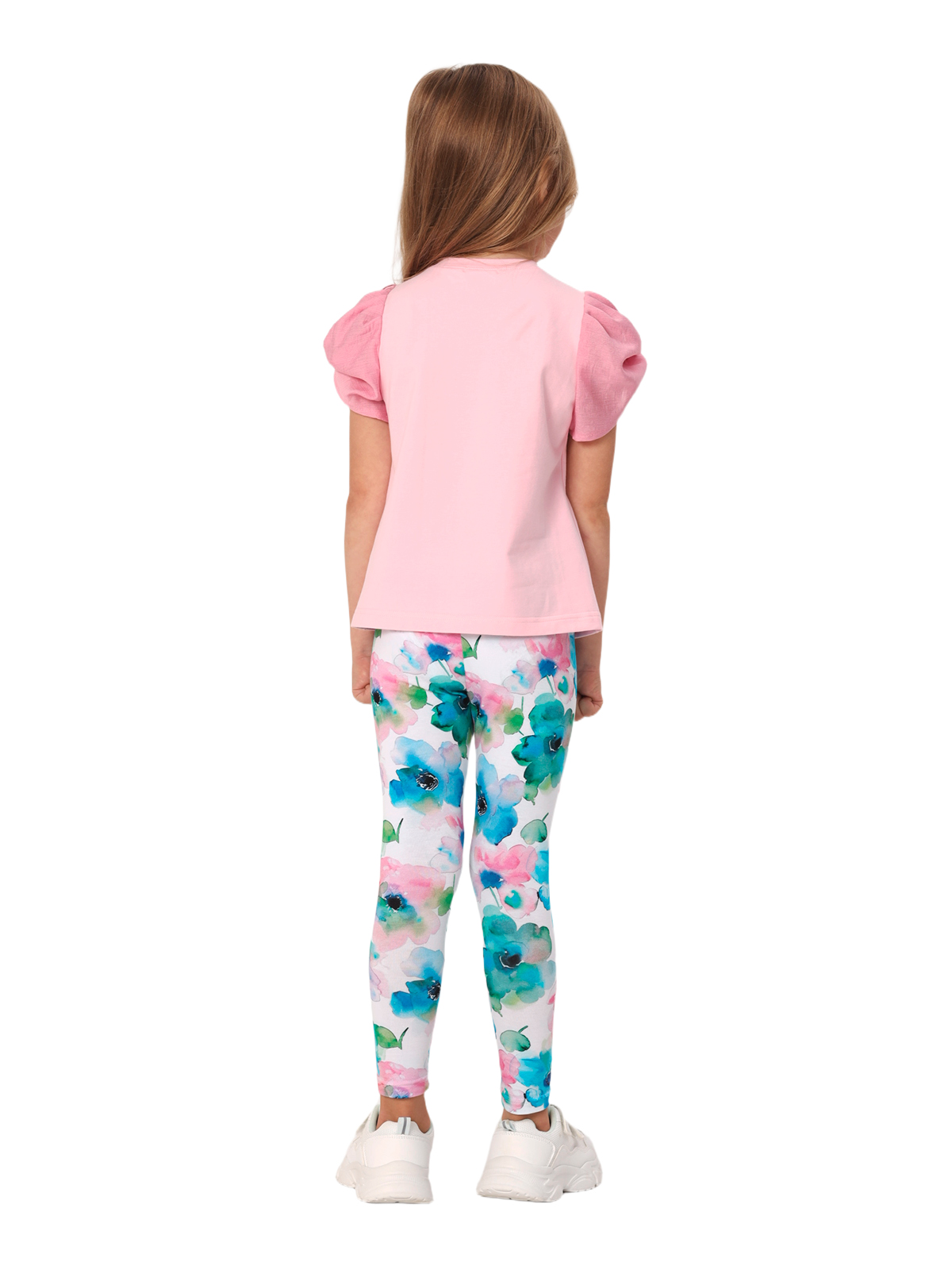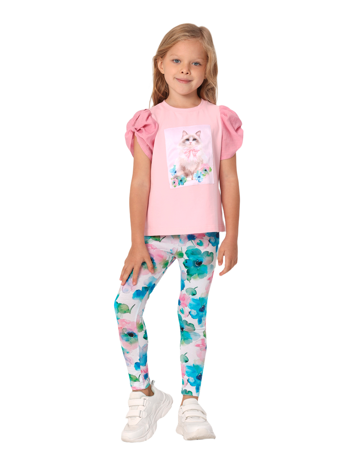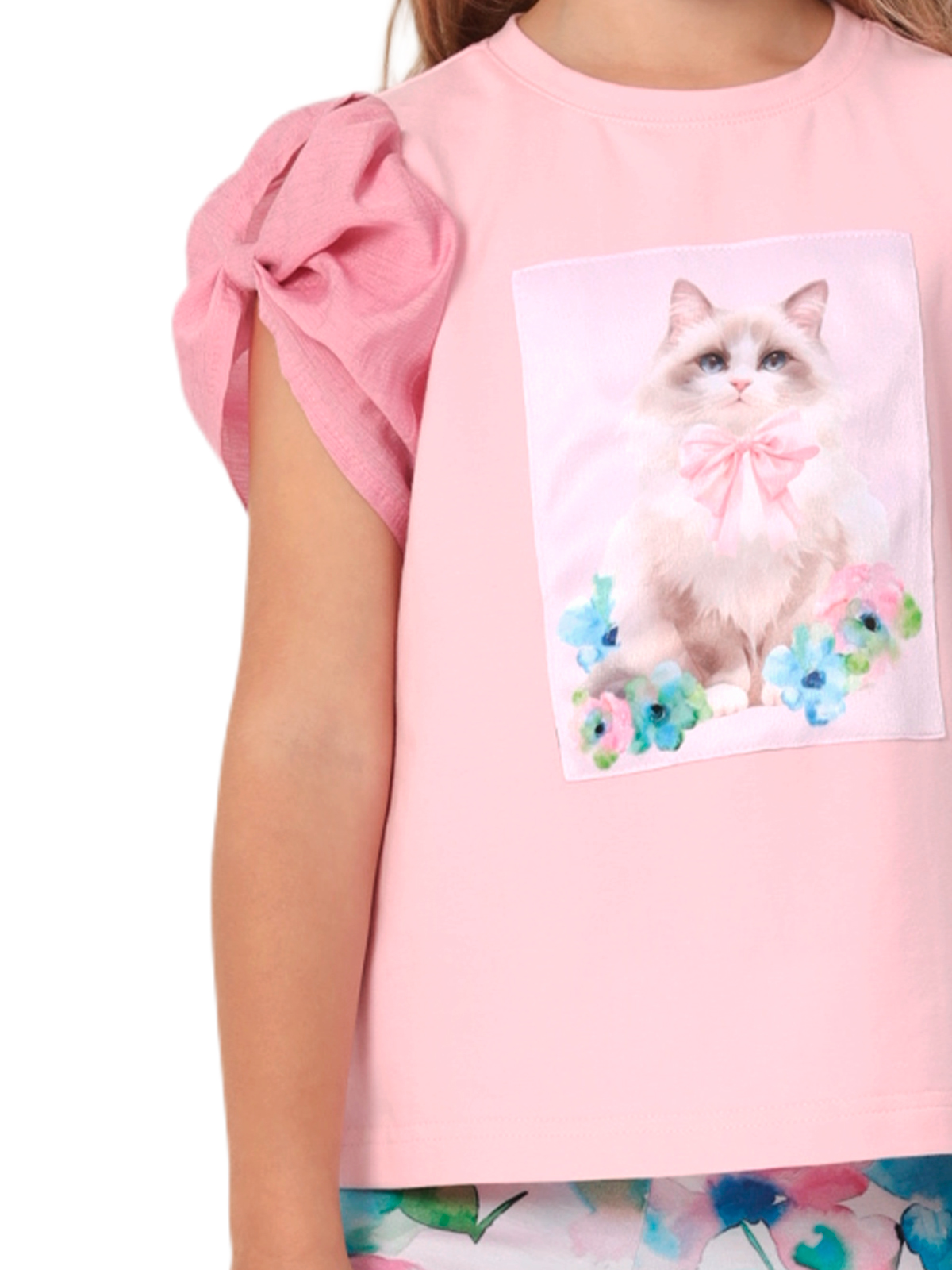 Джемпер из тонкого трикотажа, короткие рукава из легкой ткани со сборкой, имитация банта, по горловине притачивается бейка, на полочке нашивка.