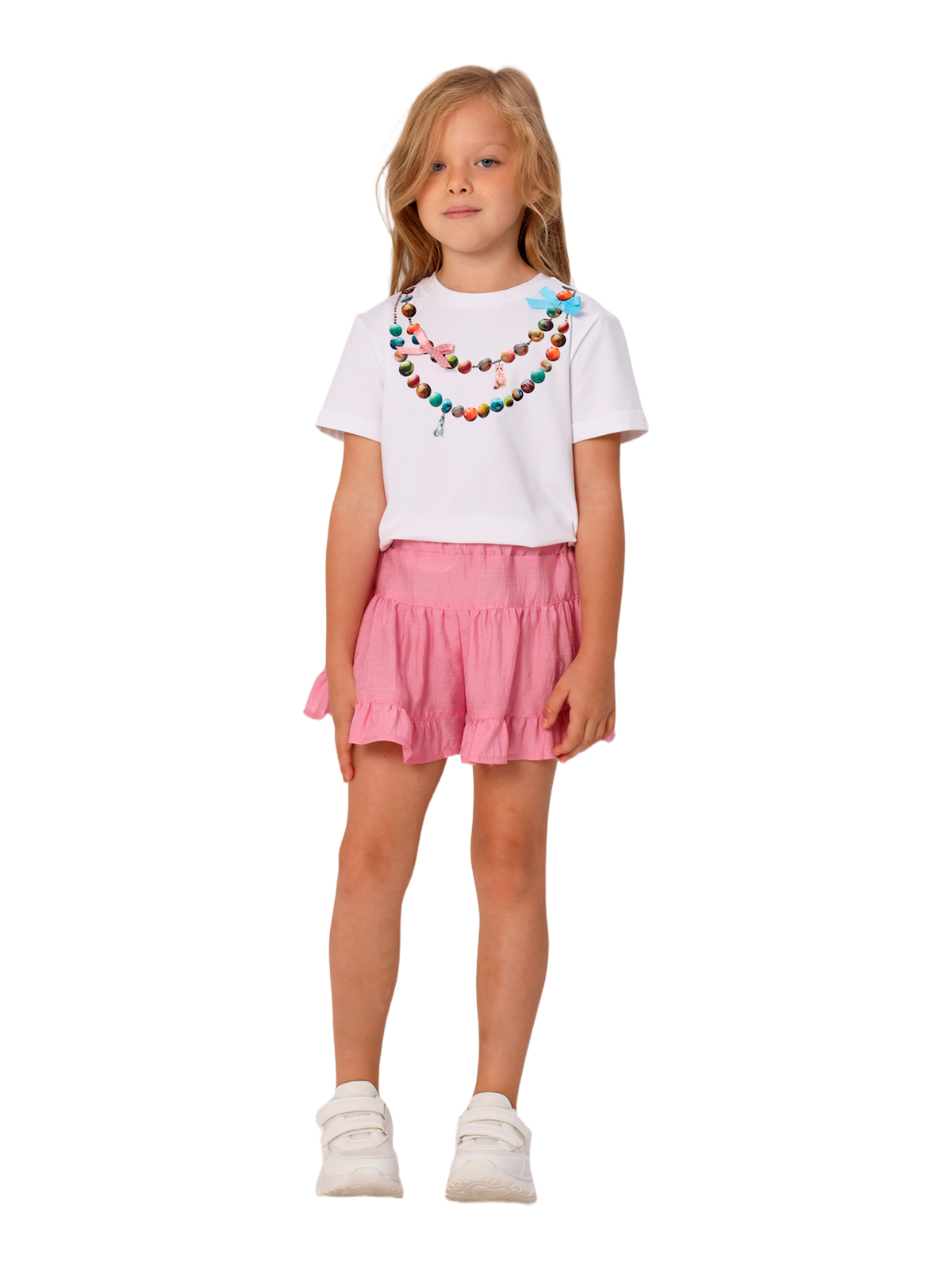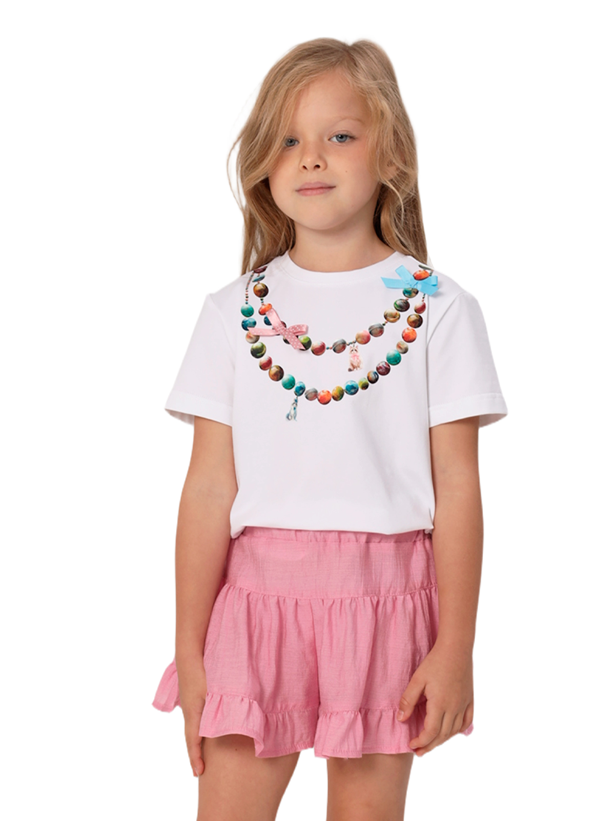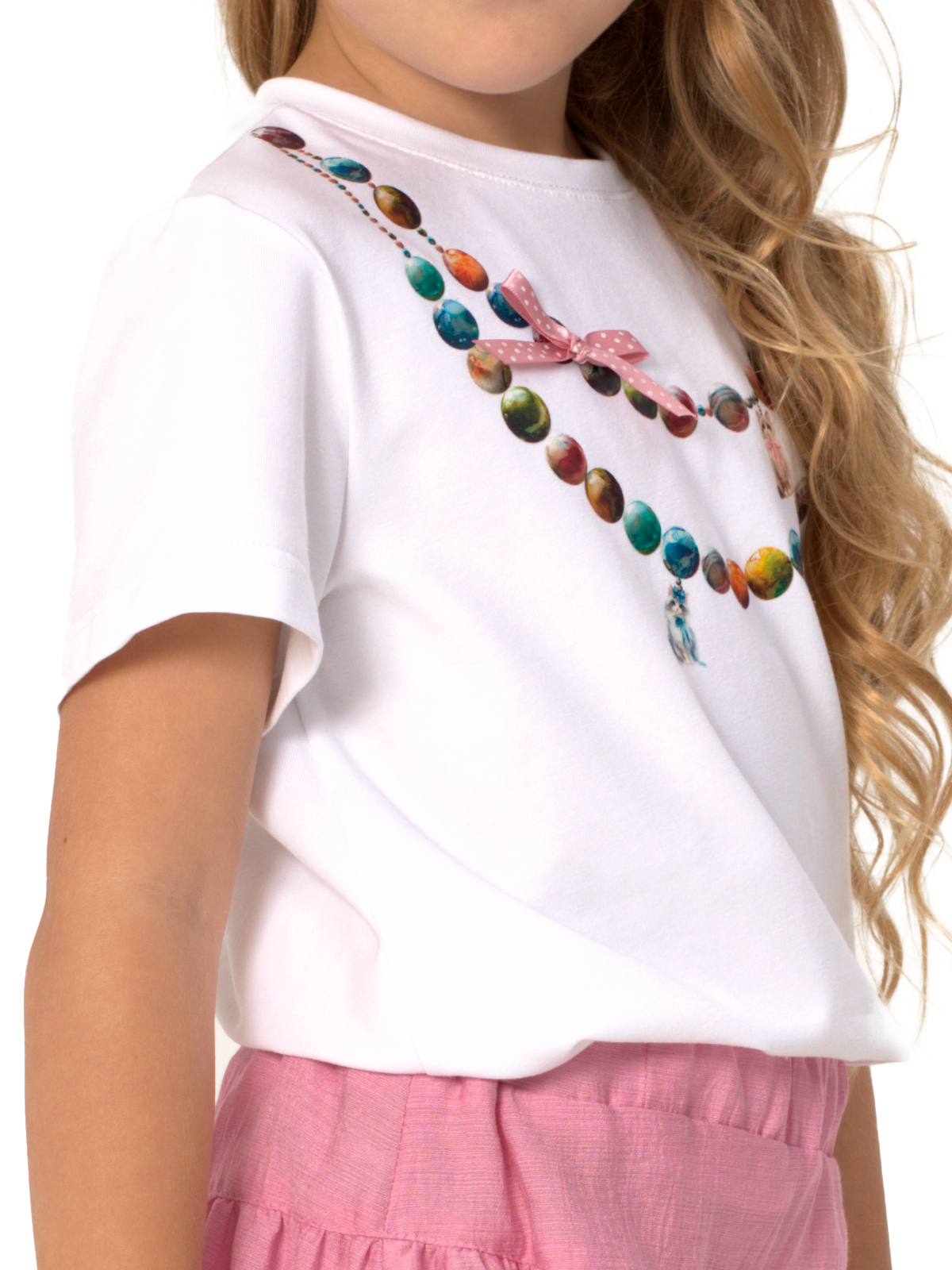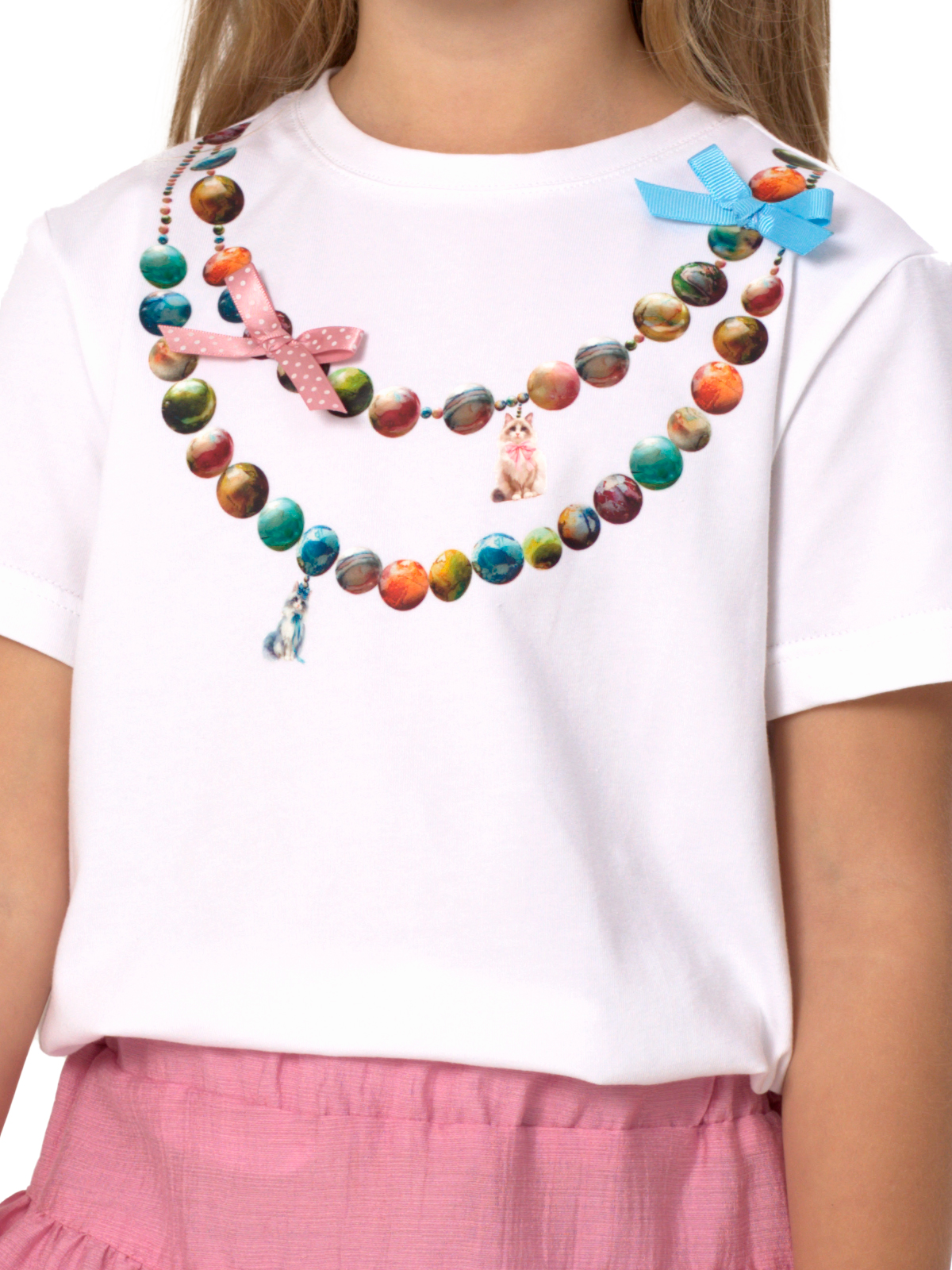 Джемпер из тонкого трикотажа, спущенное плечо, короткие рукава, по горловине притачивается бейка, на полочке принт и декоративные бантики.