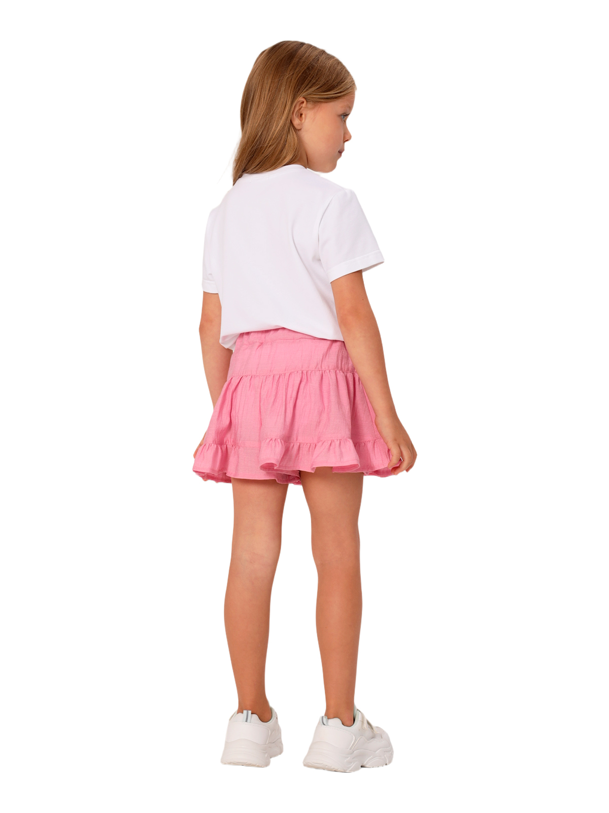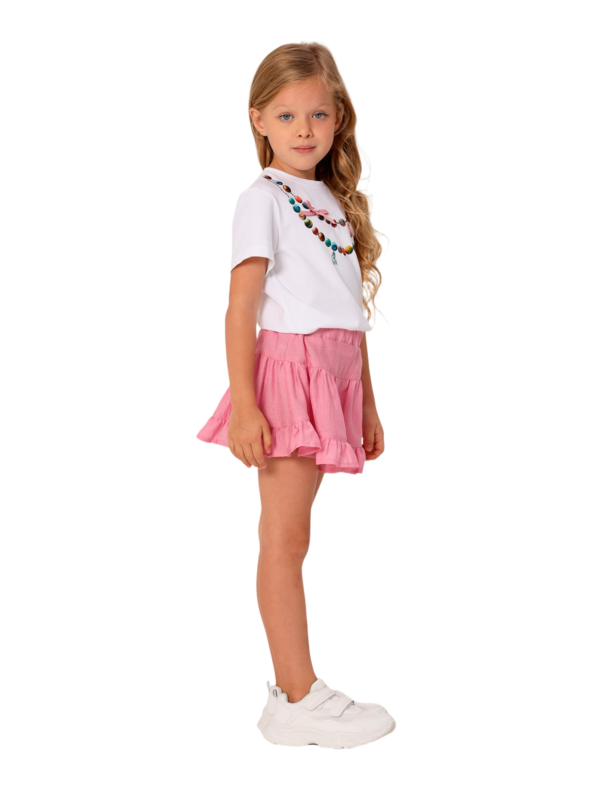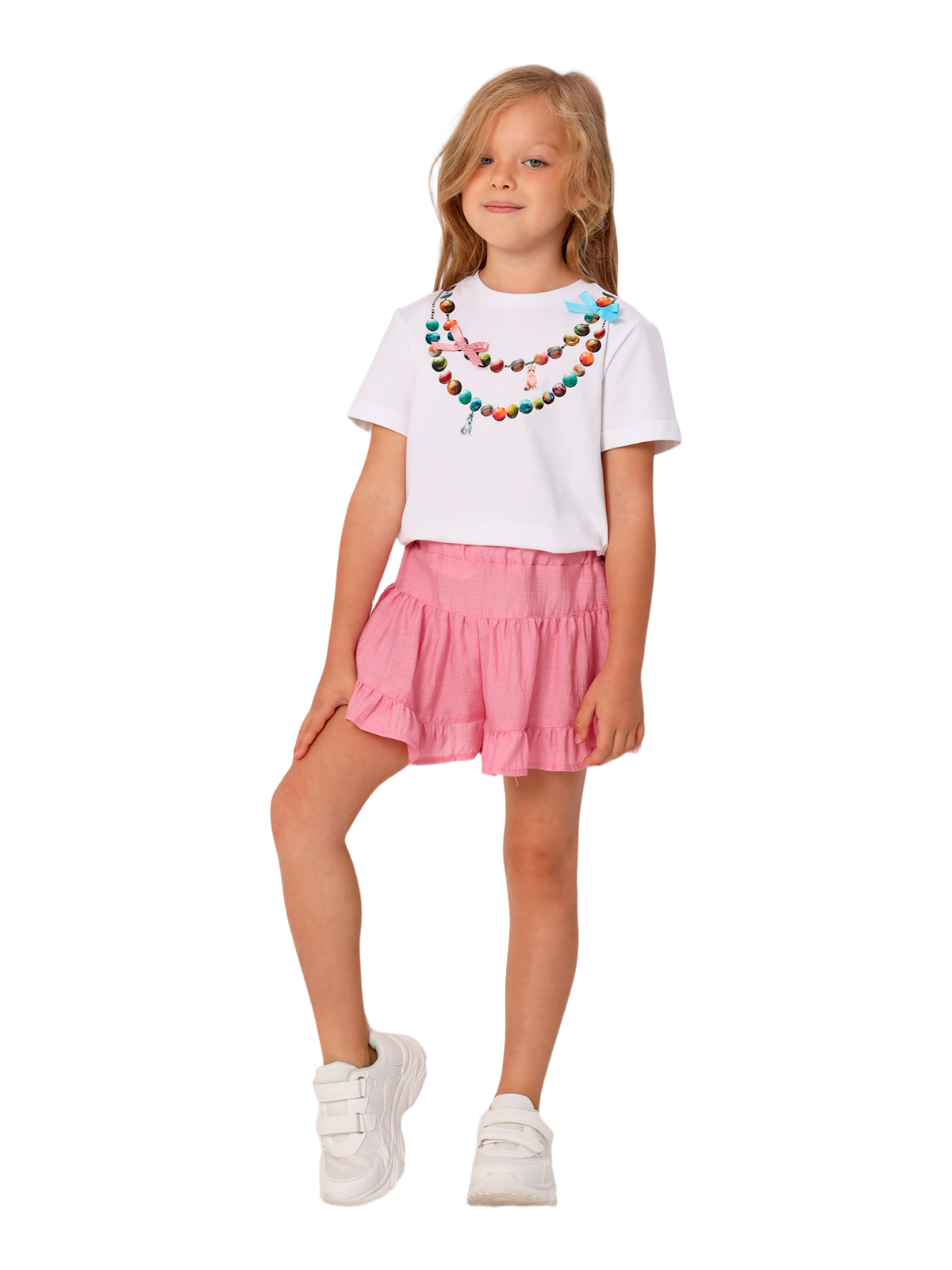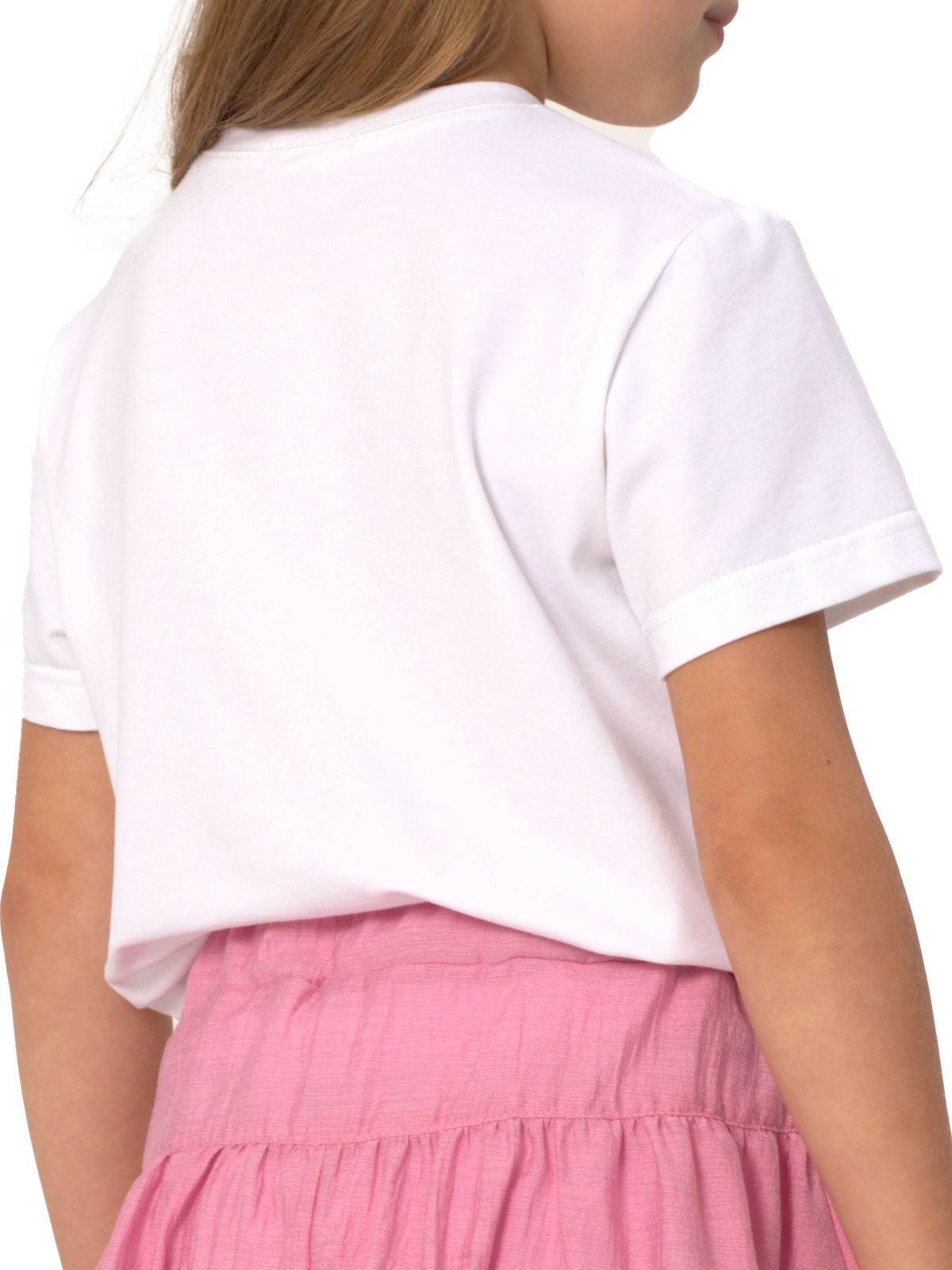 Джемпер из тонкого трикотажа, спущенное плечо, короткие рукава, по горловине притачивается бейка, на полочке принт и декоративные бантики.