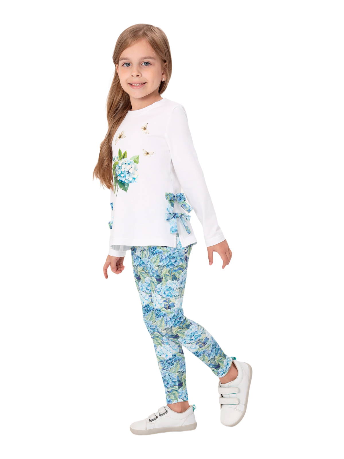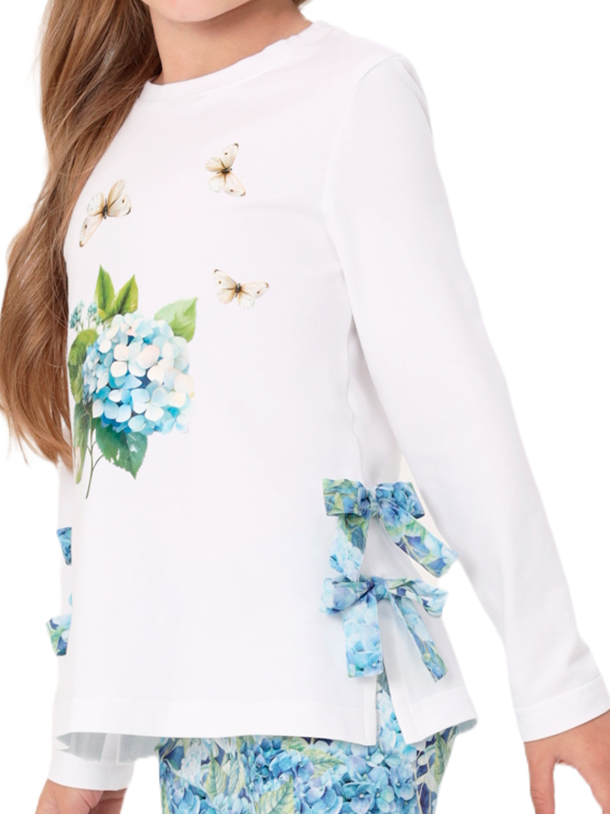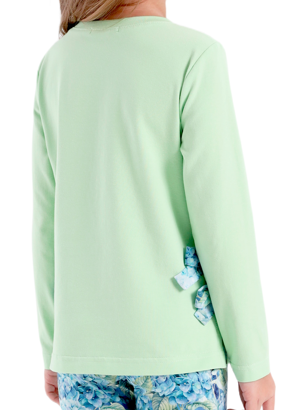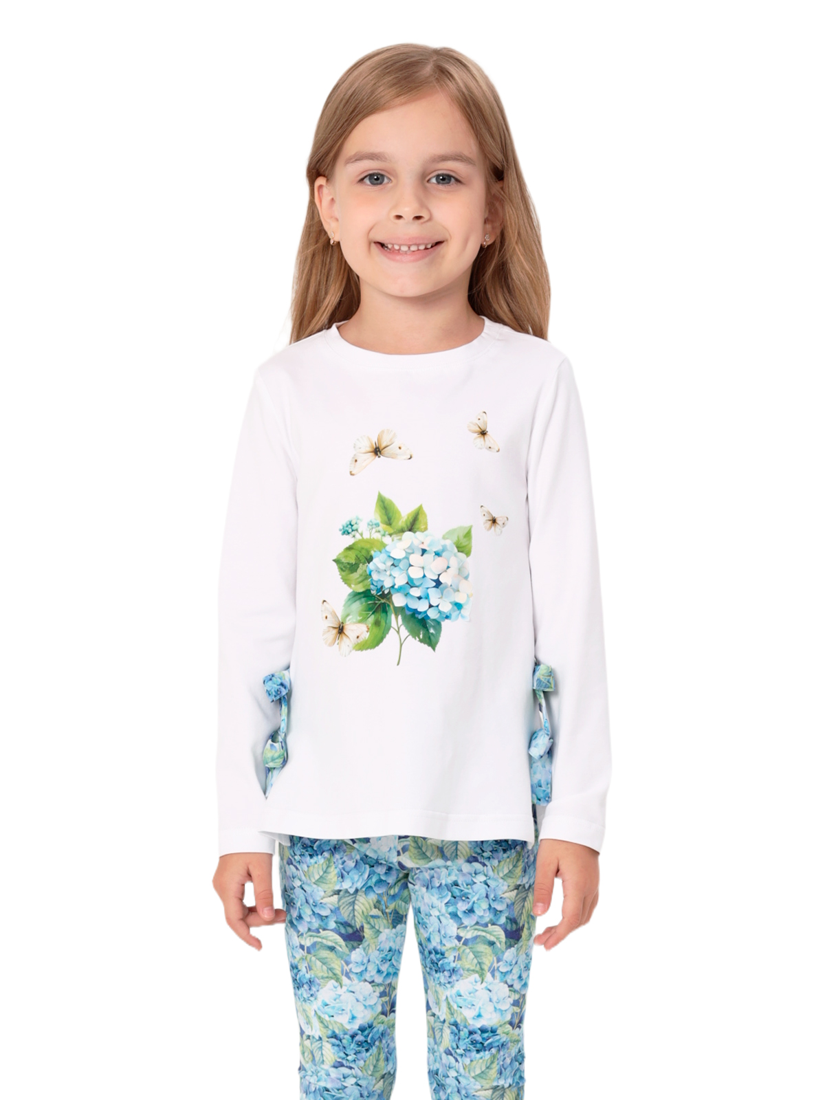 Джемпер из тонкого трикотажа с длинными рукавами, по горловине притачивается бейка, на полочке принт, в боковых швах разрезы и обтачные банты из шифона с дизайнерским рисунком.