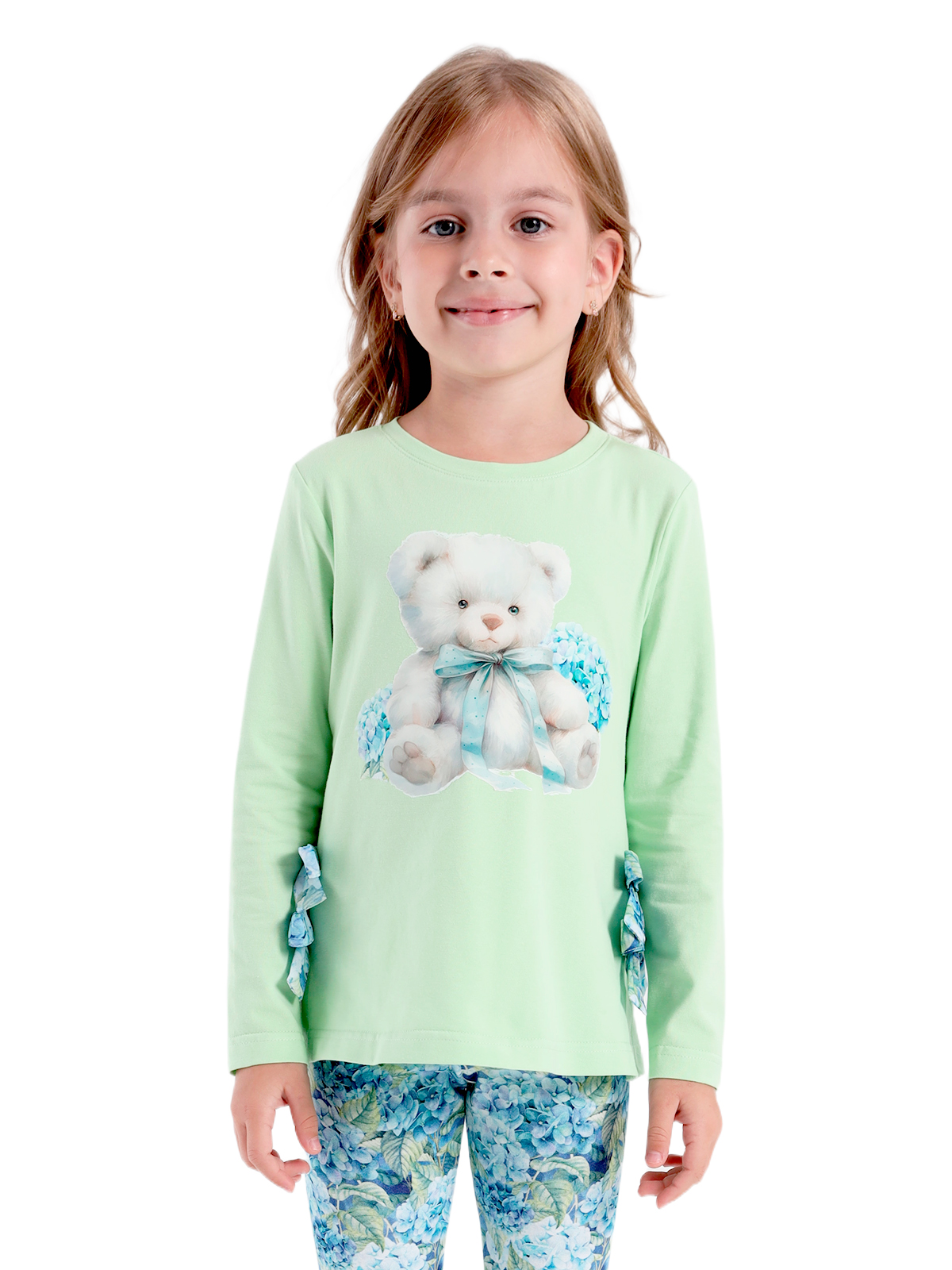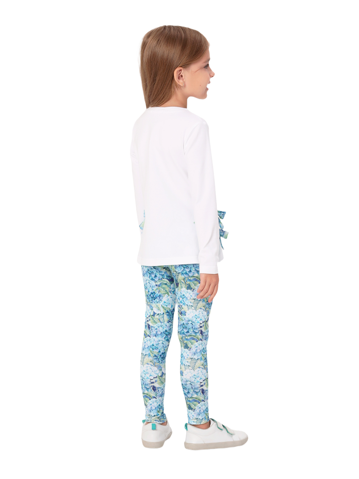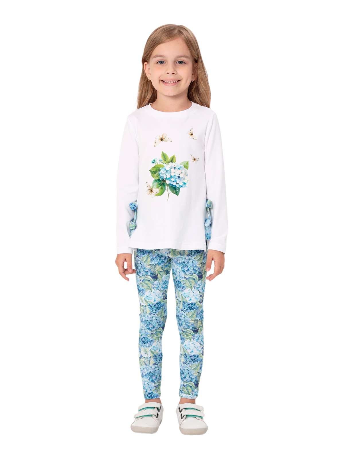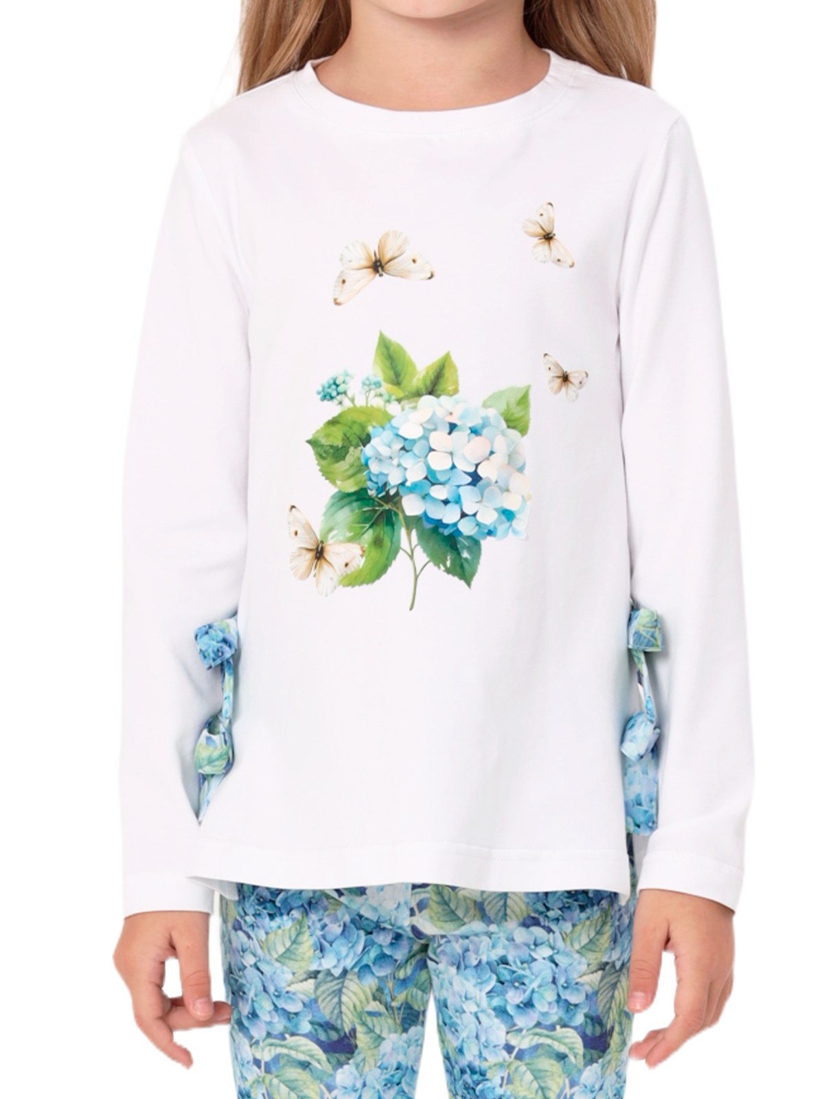 Джемпер из тонкого трикотажа с длинными рукавами, по горловине притачивается бейка, на полочке принт, в боковых швах разрезы и обтачные банты из шифона с дизайнерским рисунком.