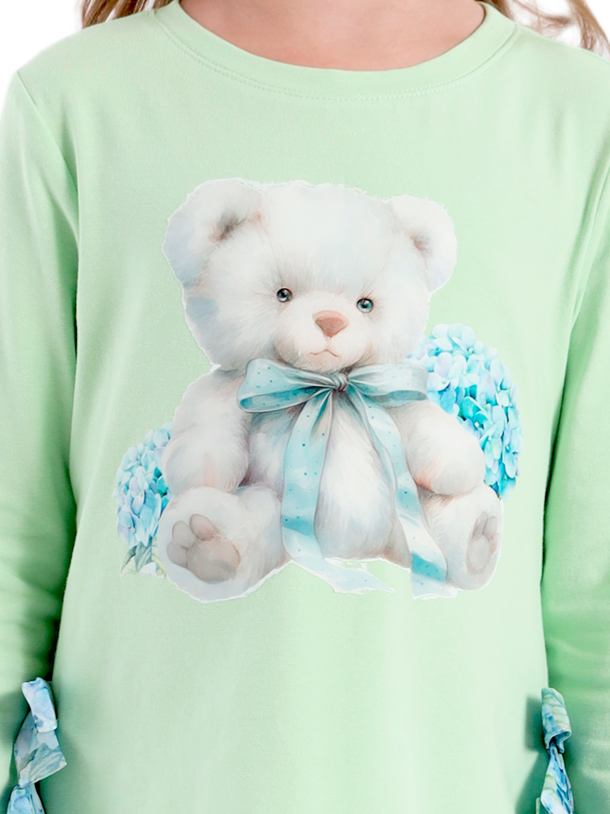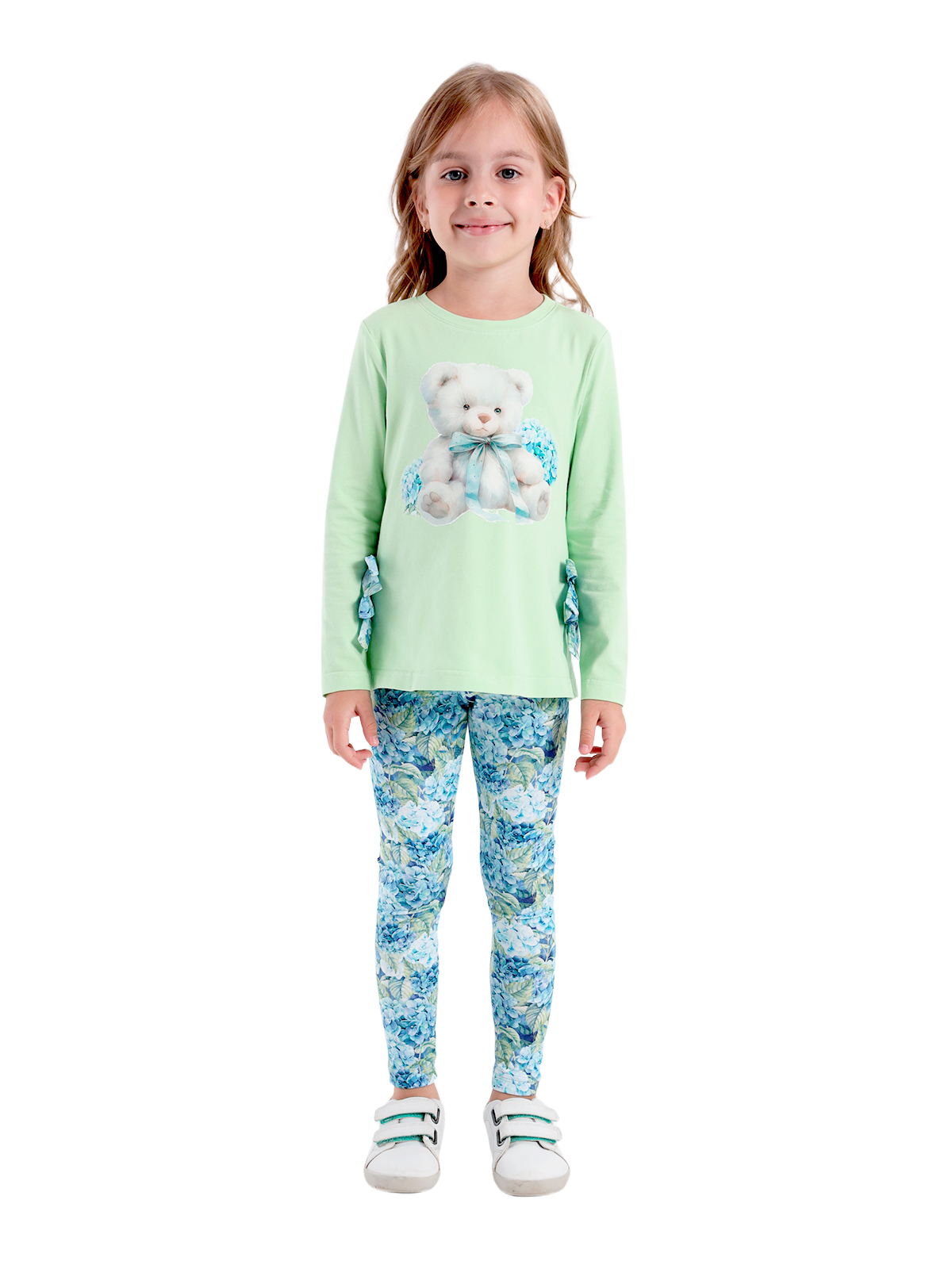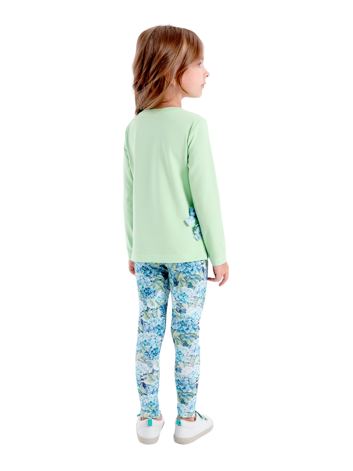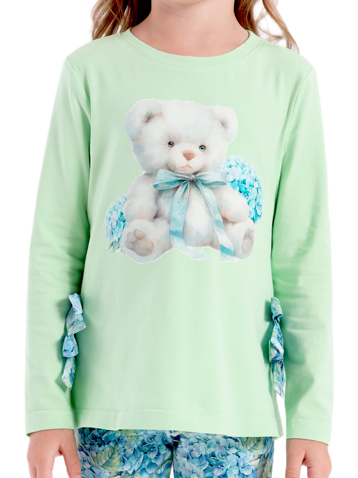 Джемпер из тонкого трикотажа с длинными рукавами, по горловине притачивается бейка, на полочке принт, в боковых швах разрезы и обтачные банты из шифона с дизайнерским рисунком.