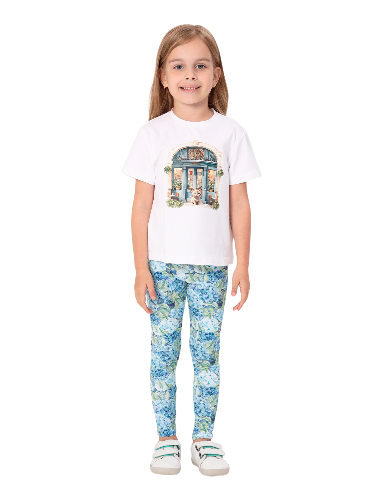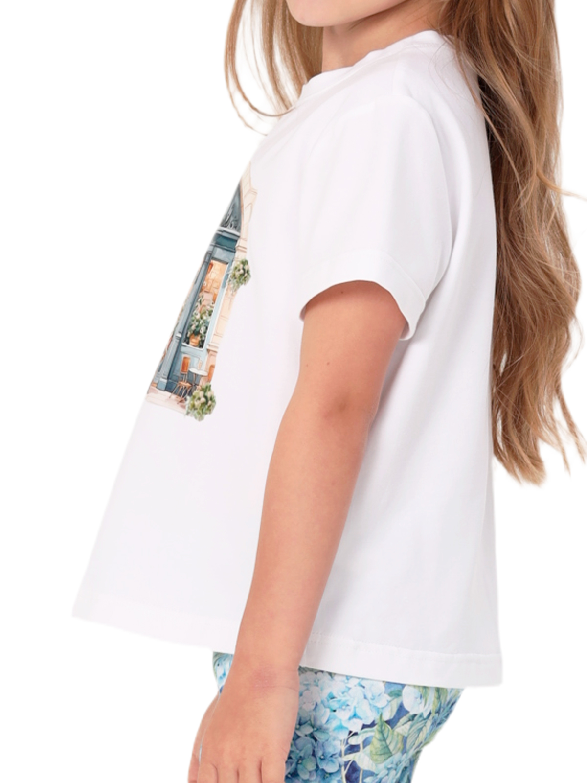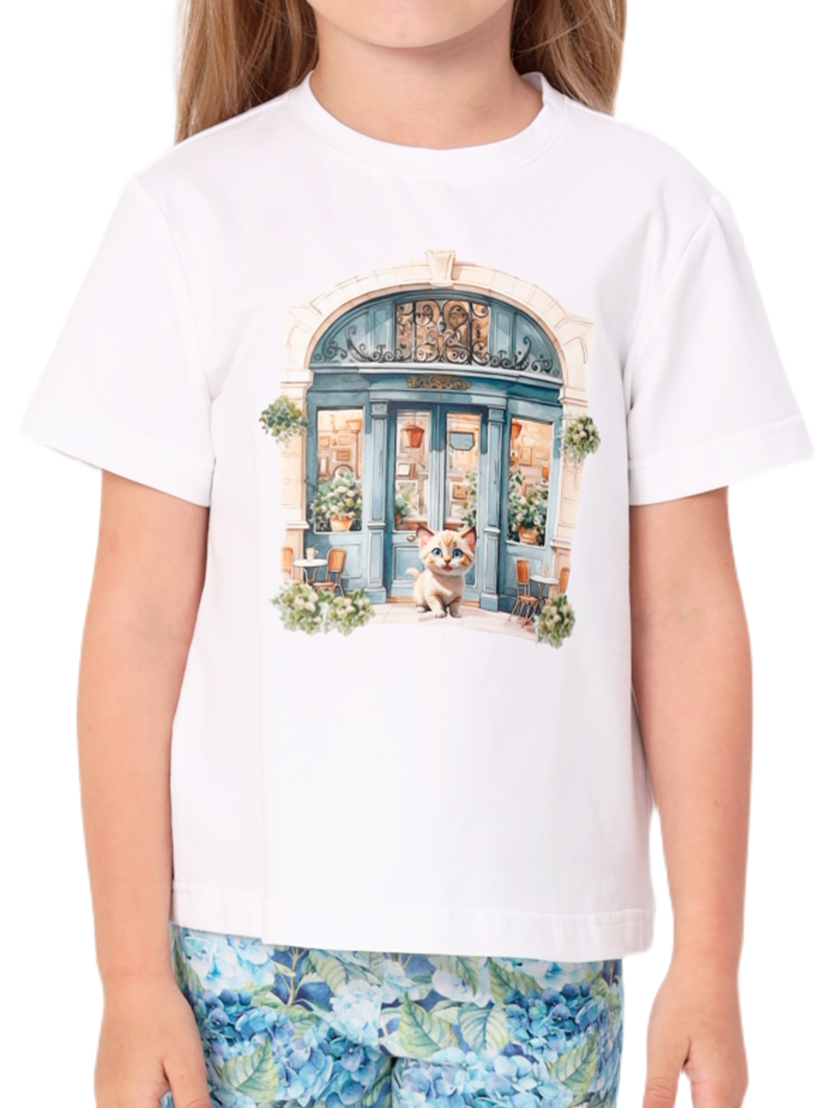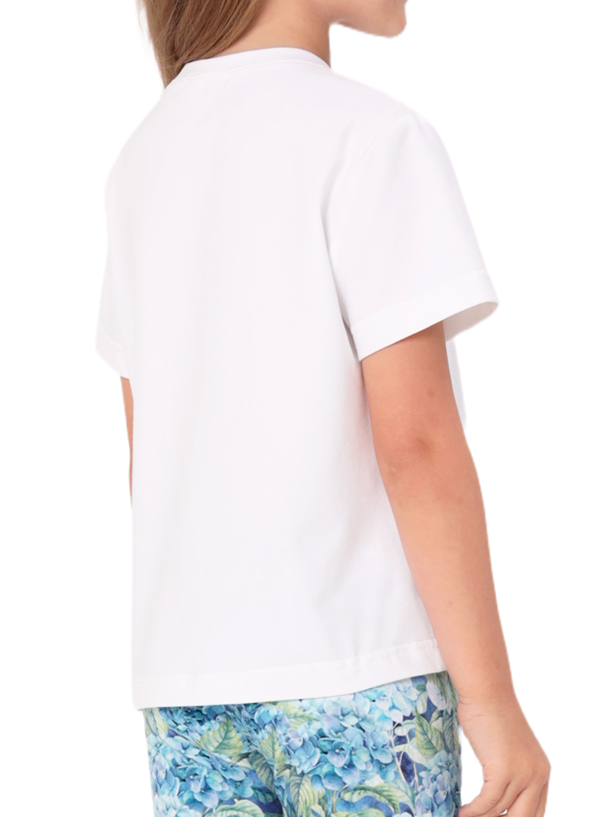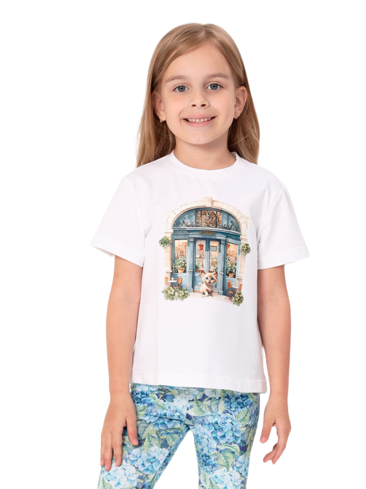 Джемпер из тонкого трикотажа с короткими рукавами, по горловине притачивается бейка, на полочке принт.