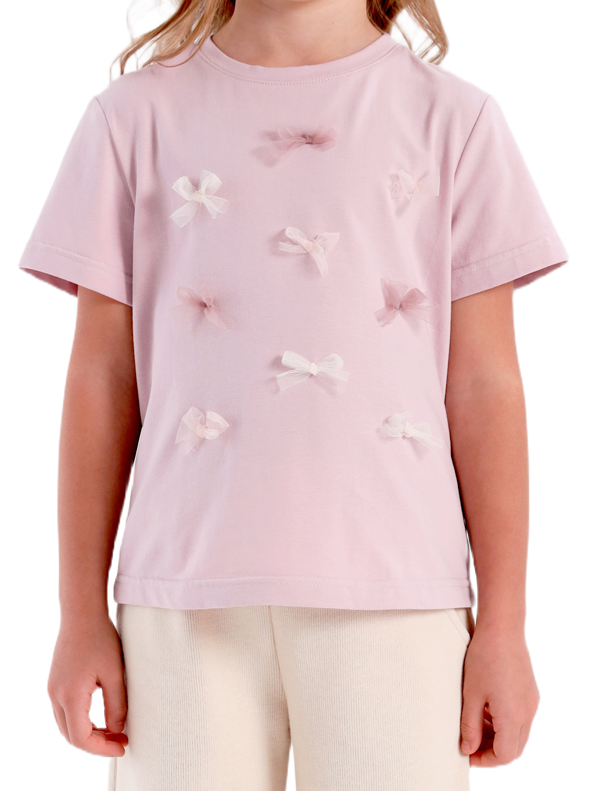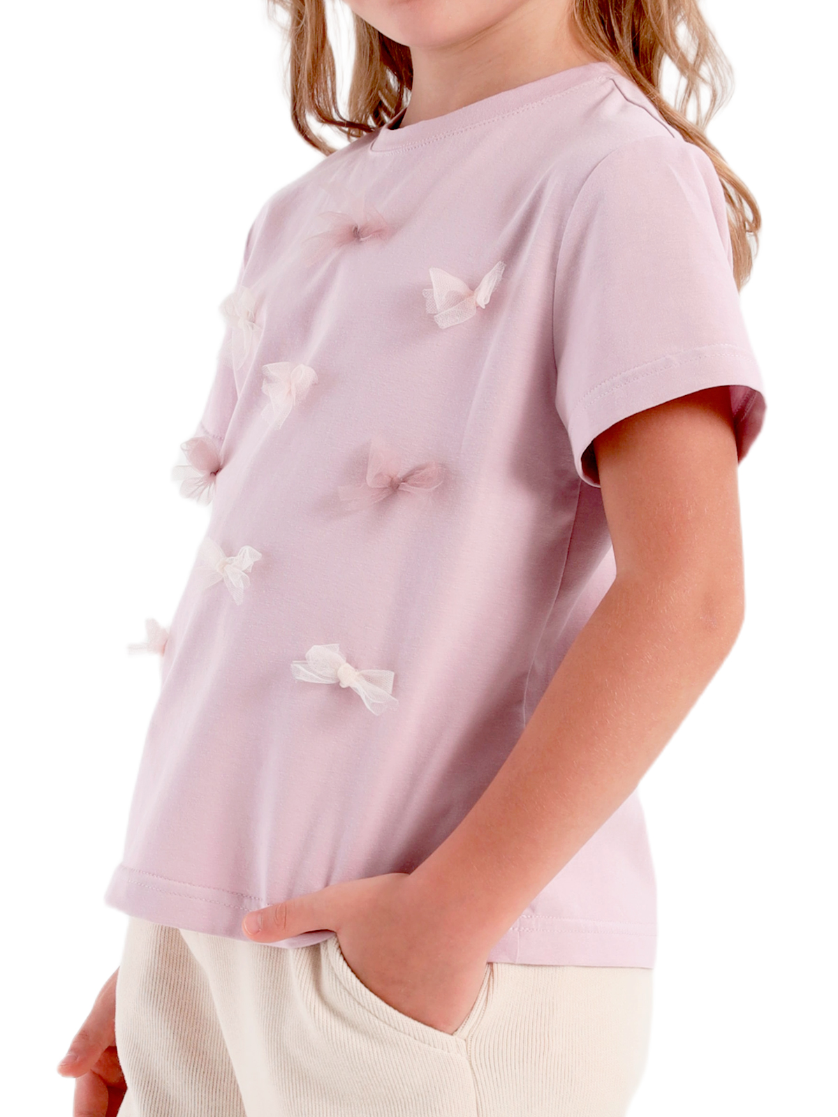 Джемпер из тонкого трикотажа, спущенное плечо, короткие рукава, по горловине притачивается бейка, на полочке девять декоративных бантика.