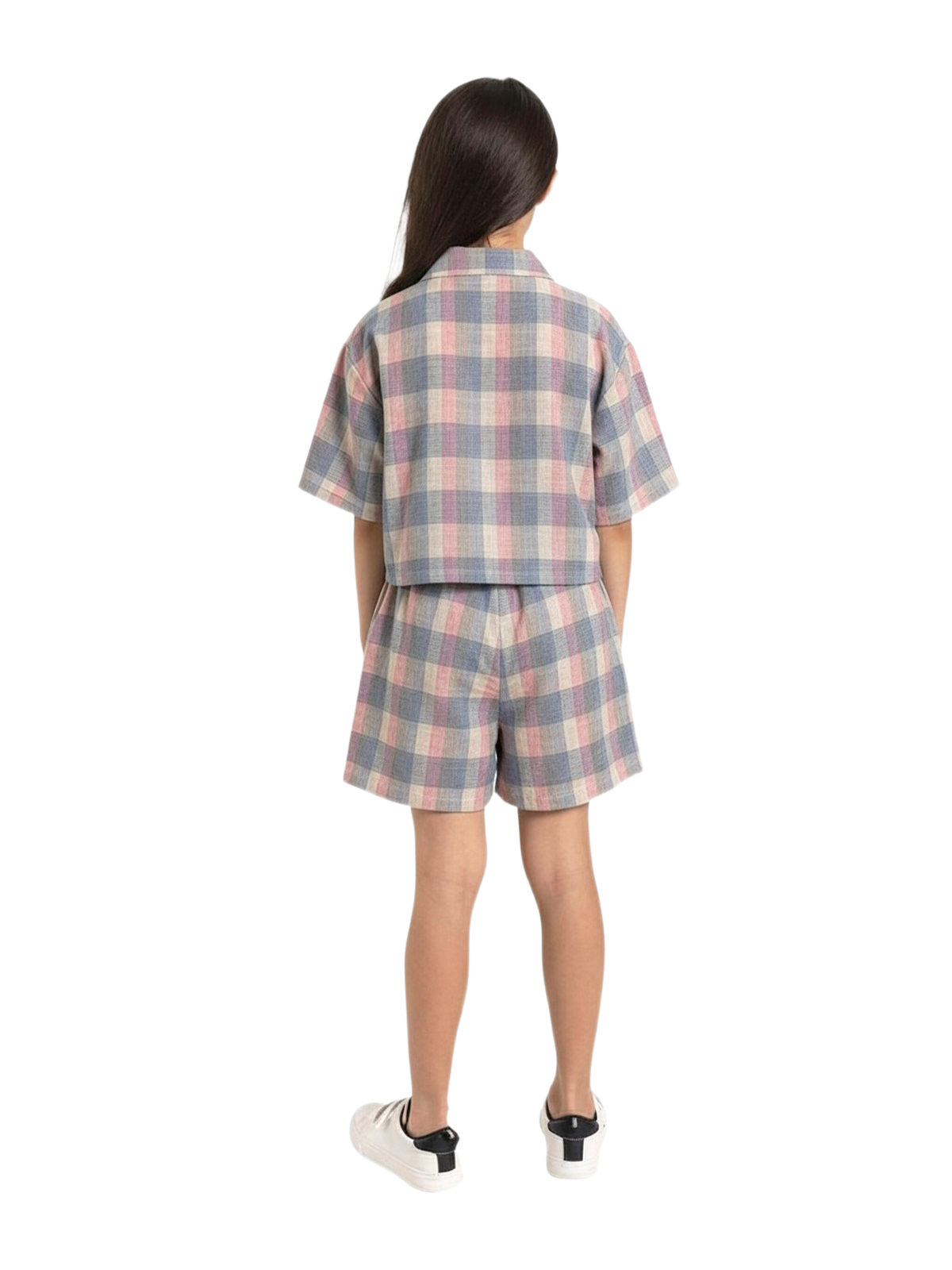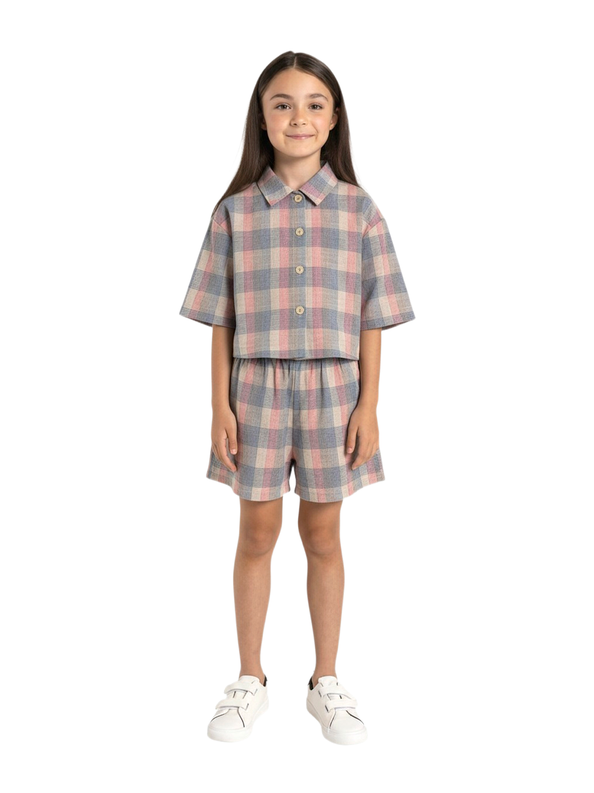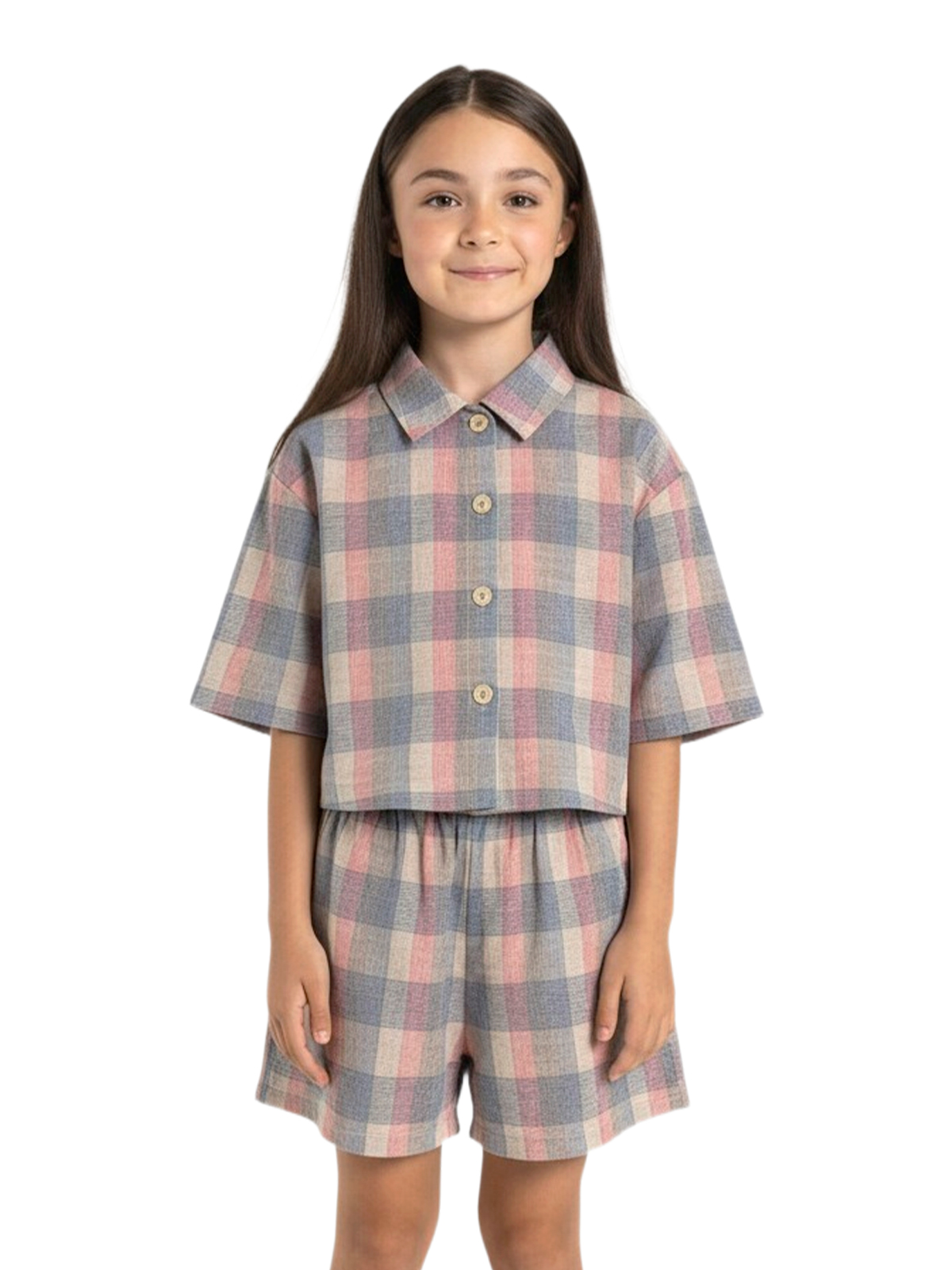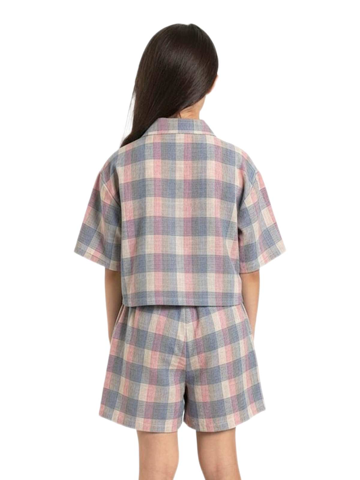 Комплект из рубашки и шорт выполнен из фактурного тонкого хлопка с рисунком. Укороченная рубашка в стиле оверсайз, застежка планка с пуговицами, спущенное плечо, воротник на стойке, короткие рукава. Свободные шорты с притачным поясом с эластичной лентой внутри, на передних половинках накладные карманы.