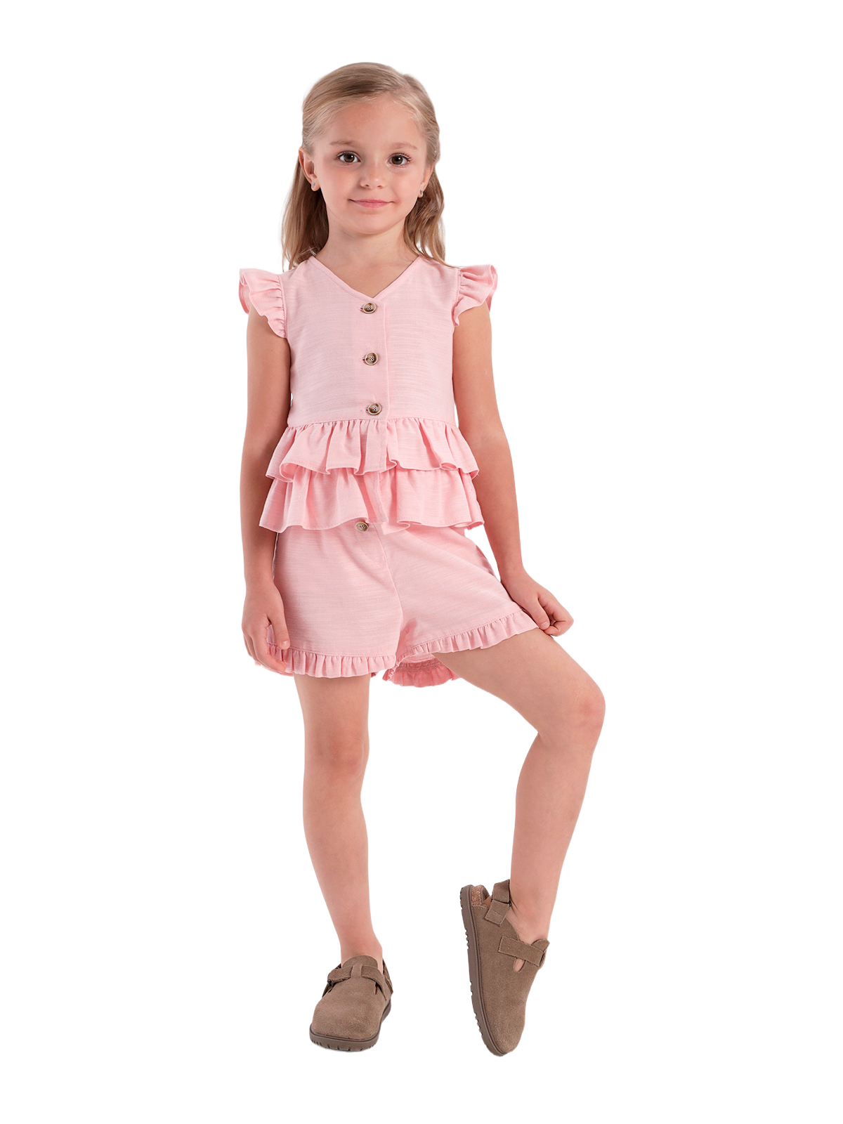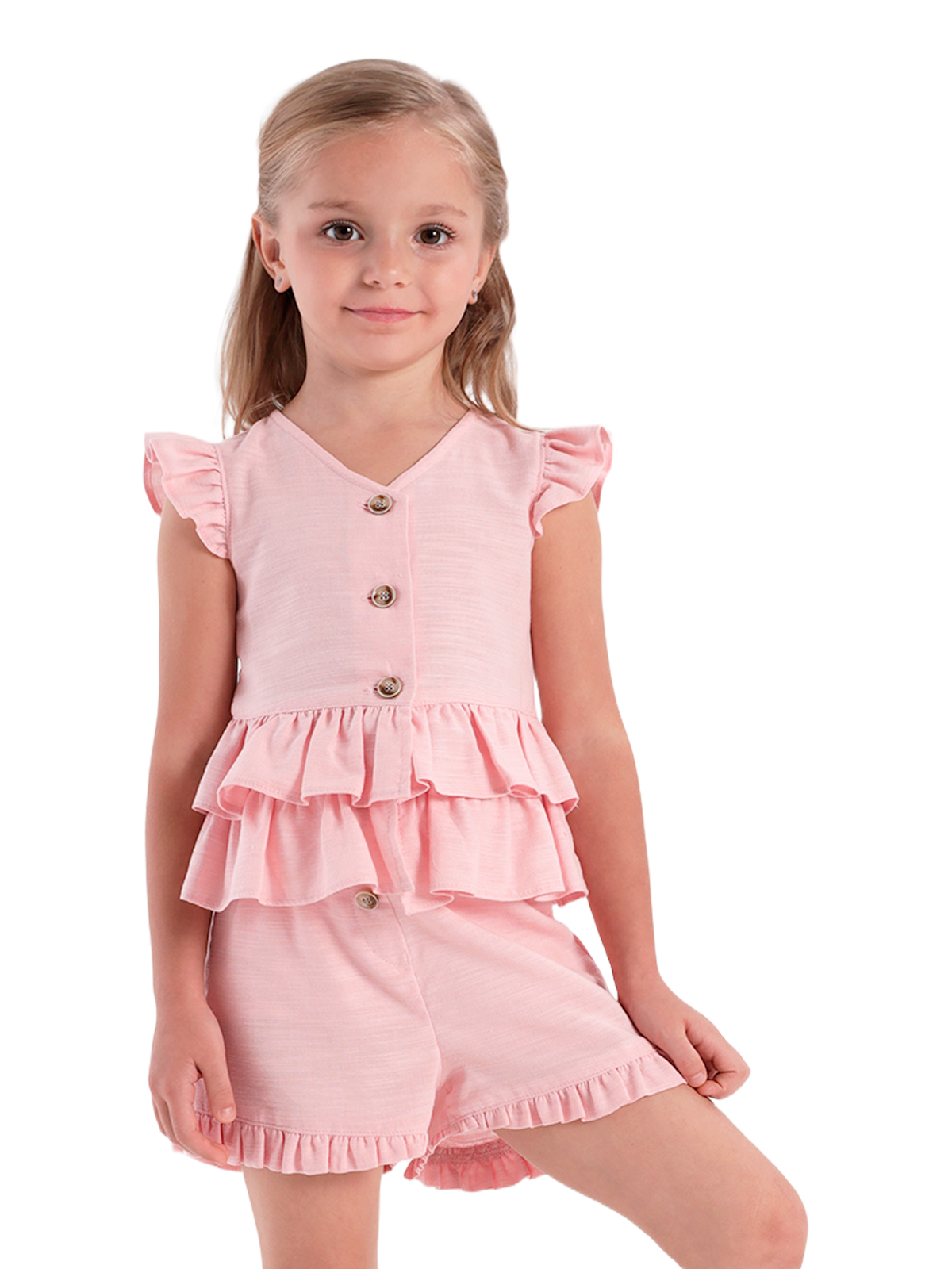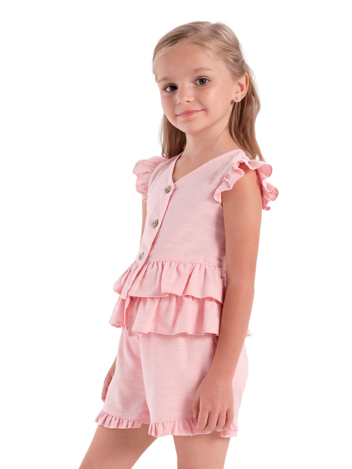 Комплект из блузки и шортов, выполненный из фактурного тонкого хлопка. Блузка с застежкой на три пуговицы, рукава-крылышки, по низу притачиваются две оборки. Шорты с цельнокроеным поясом, в поясе есть регулировка размера с помощью эластичной ленты на пуговицах, спереди гульфик-обманка с декоративными пуговицами, по низу притачивается оборка.