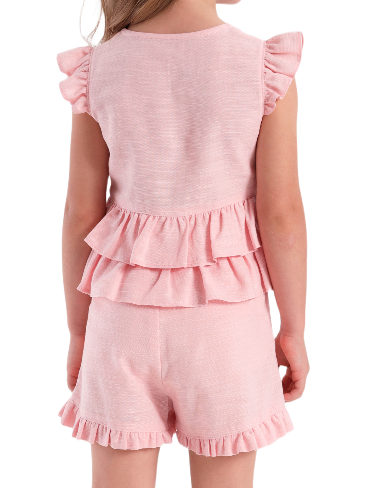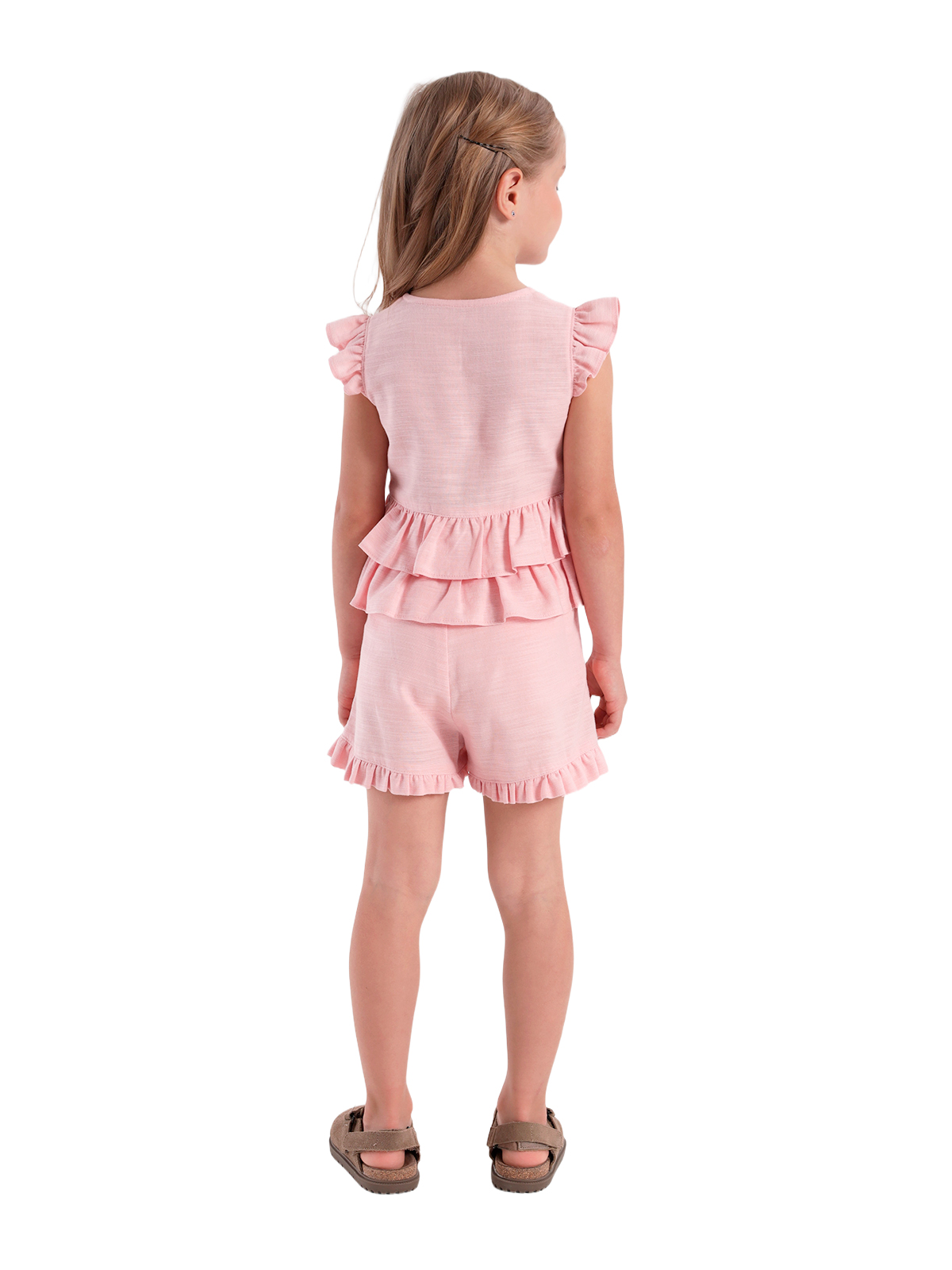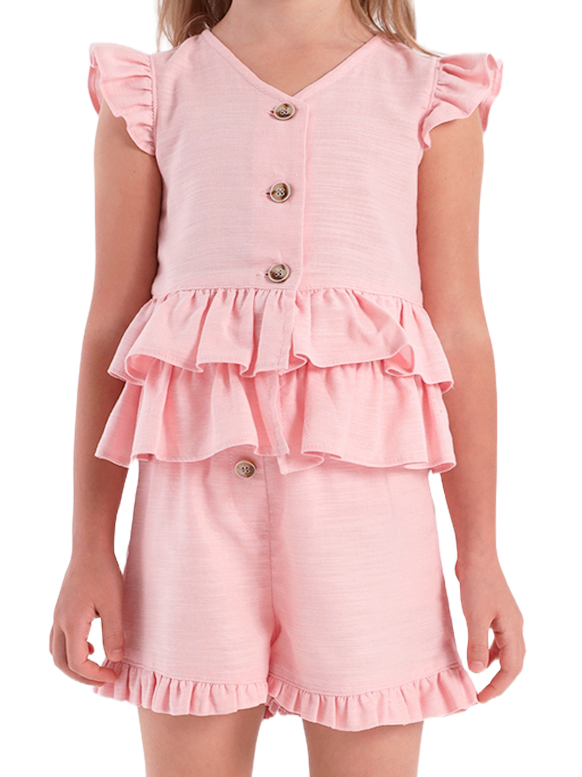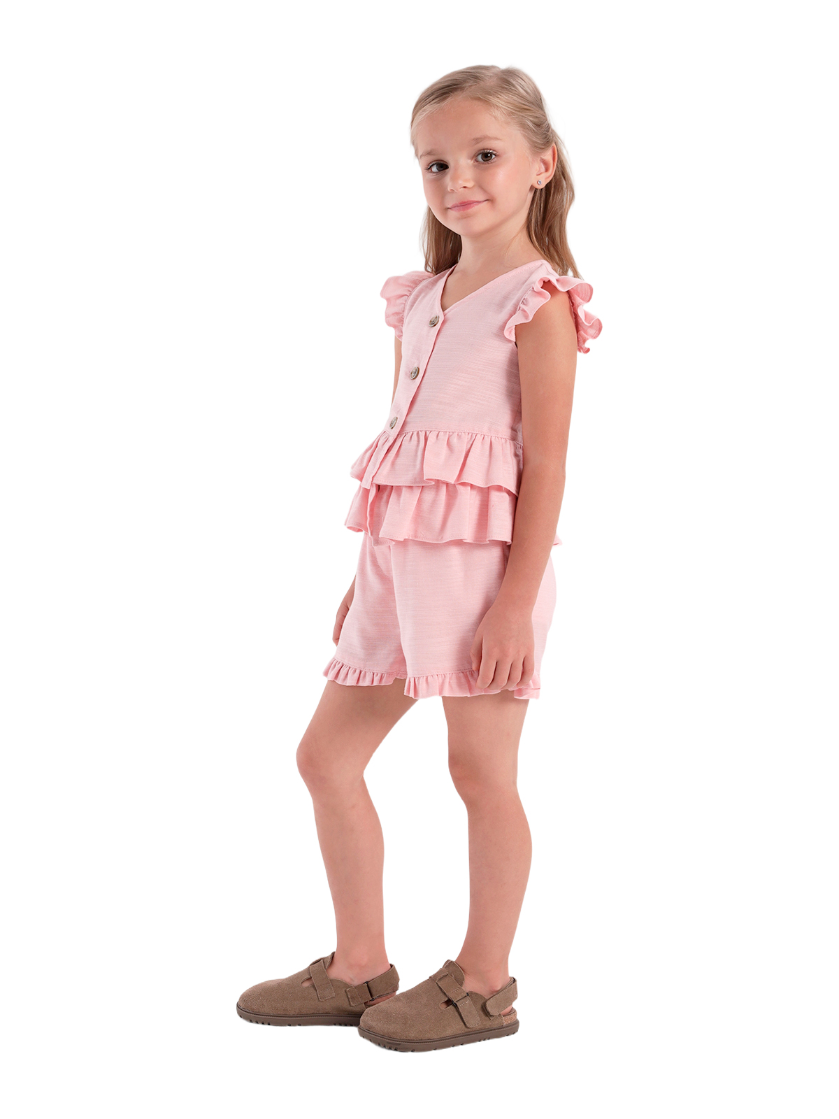 Комплект из блузки и шортов, выполненный из фактурного тонкого хлопка. Блузка с застежкой на три пуговицы, рукава-крылышки, по низу притачиваются две оборки. Шорты с цельнокроеным поясом, в поясе есть регулировка размера с помощью эластичной ленты на пуговицах, спереди гульфик-обманка с декоративными пуговицами, по низу притачивается оборка.