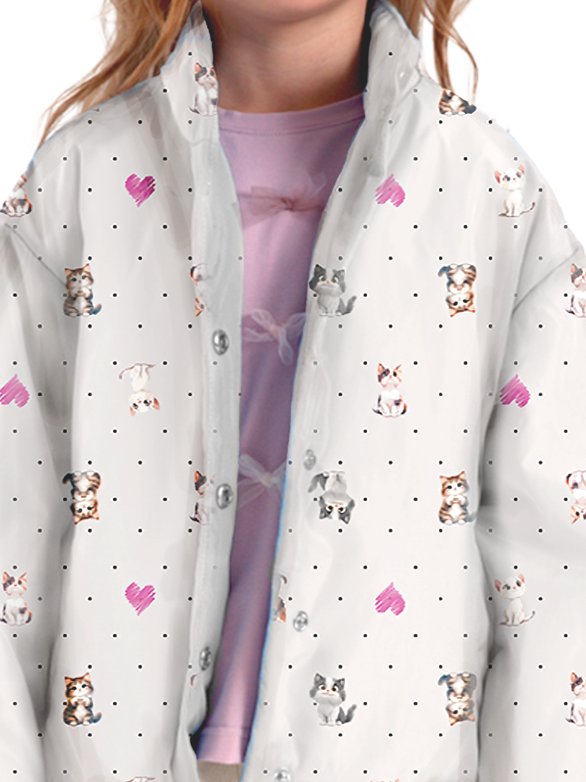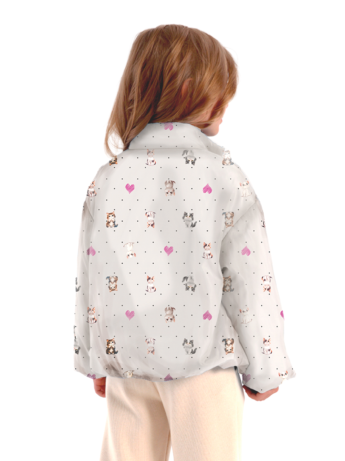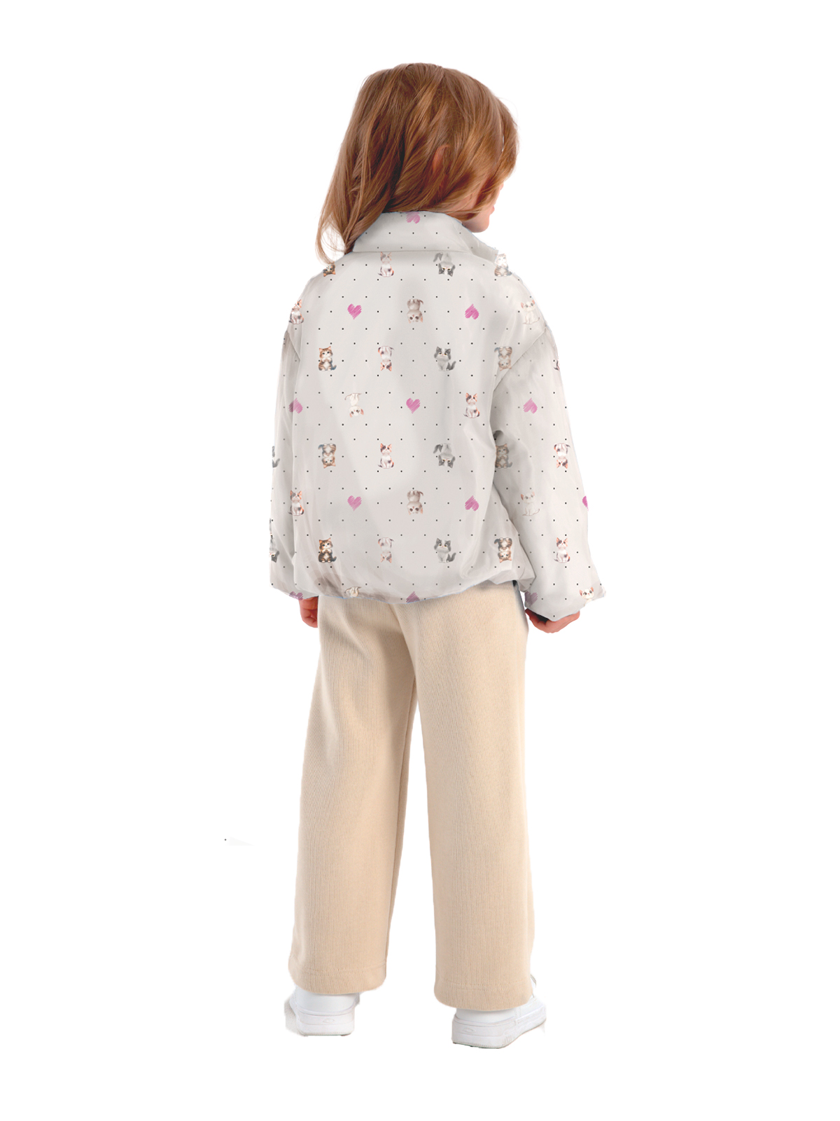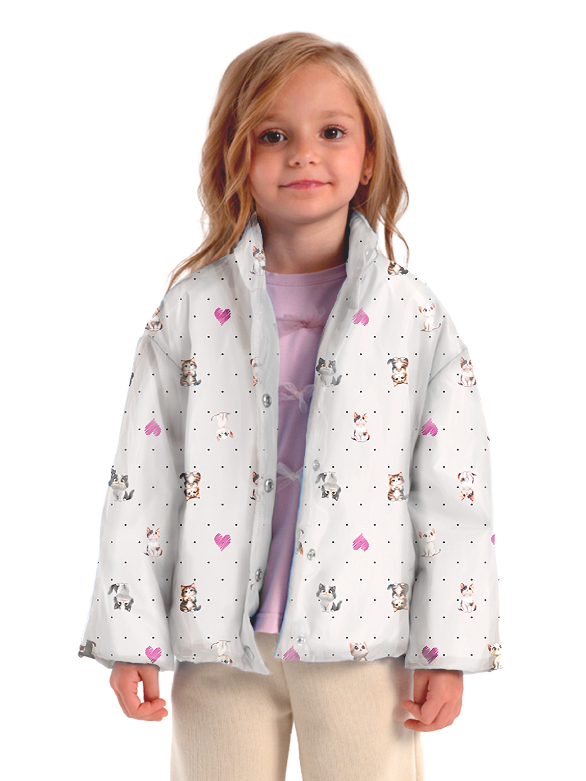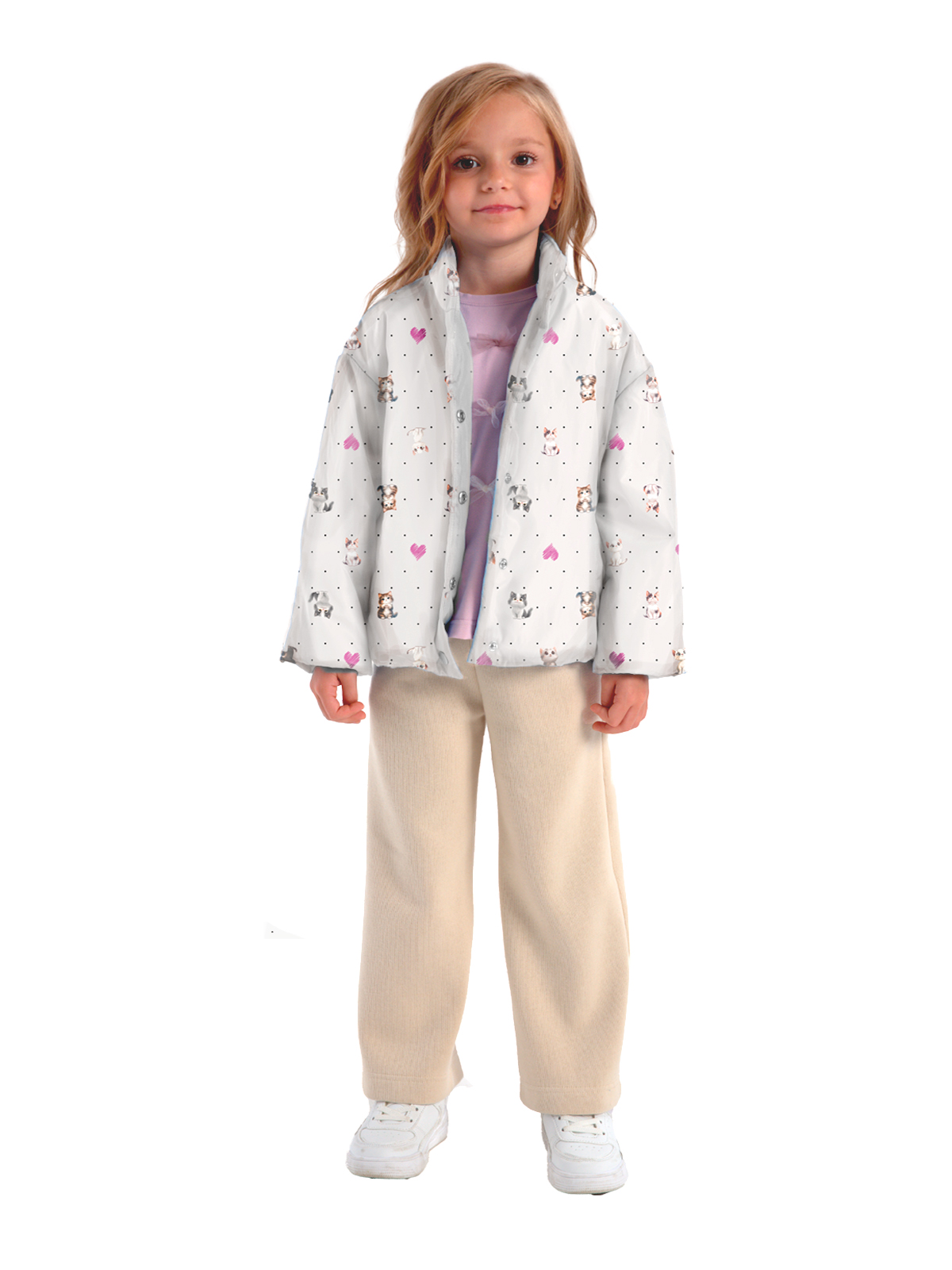 Куртка выполнена из непромокаемой плащевой ткани с дизайнерским рисунком, наполнитель холлофайбер 100 г/кв. м. Изделие рекомендуем носить от + 10°С до + 5°С., куртка имеет воротник стойку, застежка на кнопки, на полочках карманы с листочкой, длинные рукава со сборкой, по низу изделия эластичная лента, что создает эффект баллона, изделие на подкладке.Подкладка 100% хлопок.