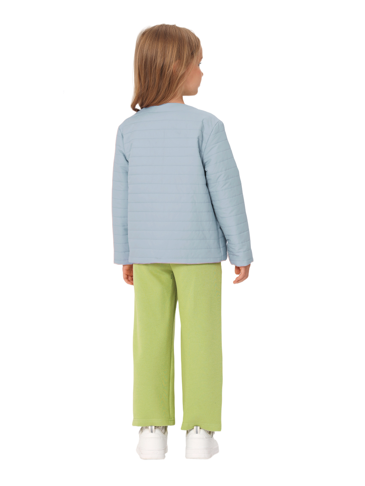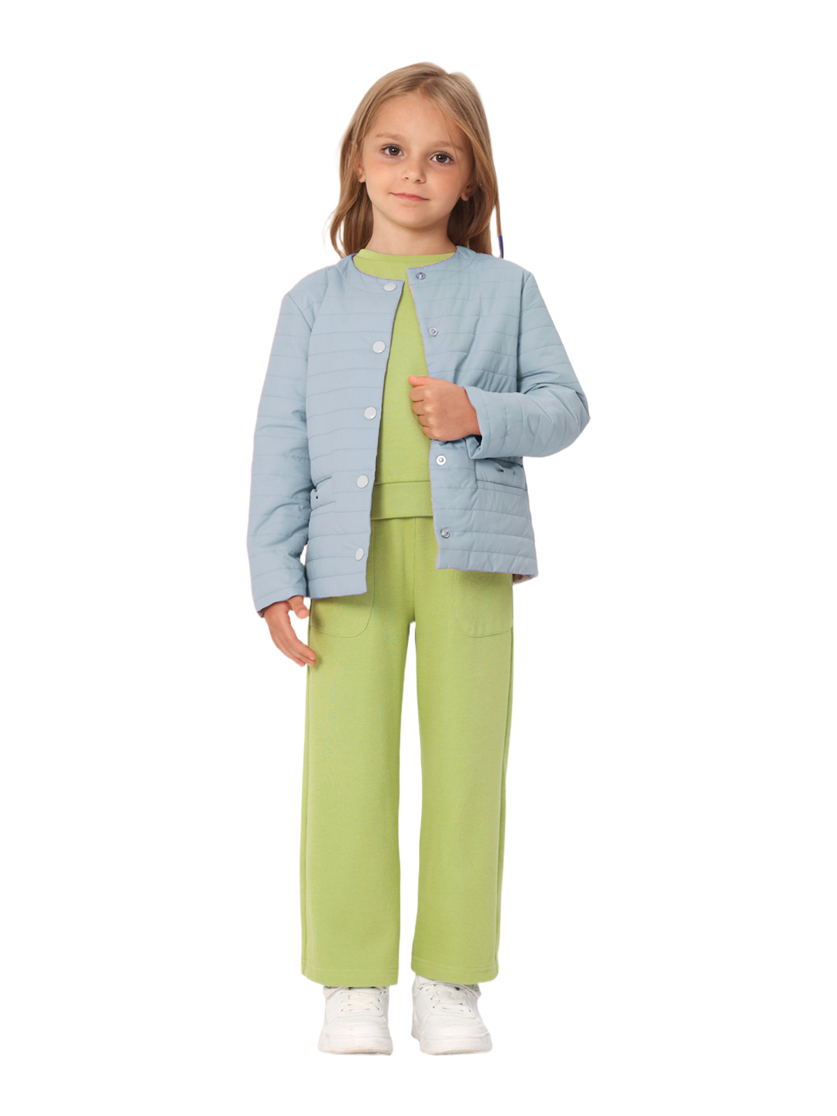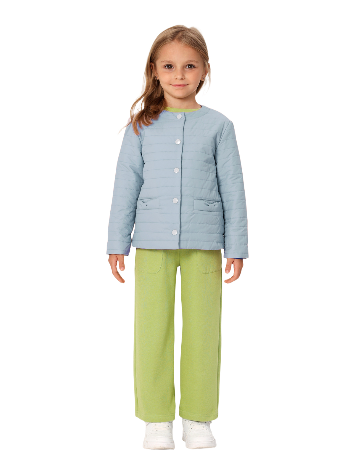 Стеганная куртка выполнена из непромокаемой плащевой ткани, наполнитель холлофайбер 100 г/кв. м. Изделие рекомендуем носить от + 10°С до + 5°С., куртка имеет круглую горловину, застежка на кнопки, на полочках карманы с листочкой, собранную на шлевку, для имитации бантика, длинные рукава, изделие на подкладке.Подкладка 100% хлопок.