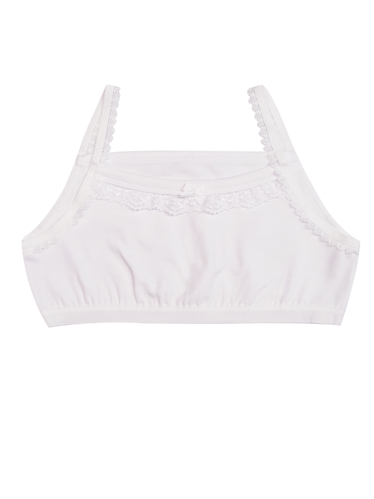Топ из тонкого трикотажа с узкими ажурными бретелями, по горловине окантовка и ажурное кружево, по низу изделия притачивается широкая эластичная лента, декоративный бантик.