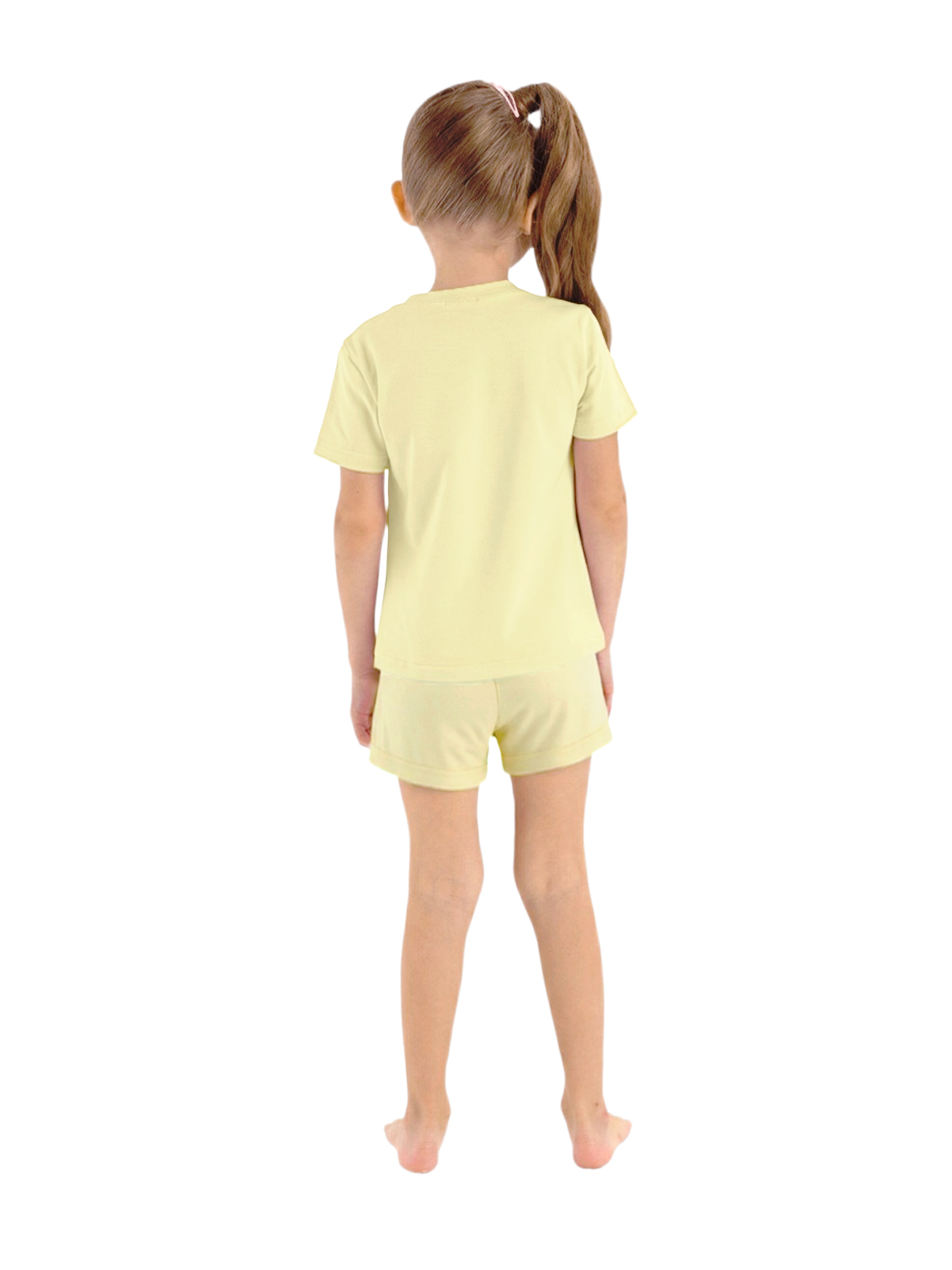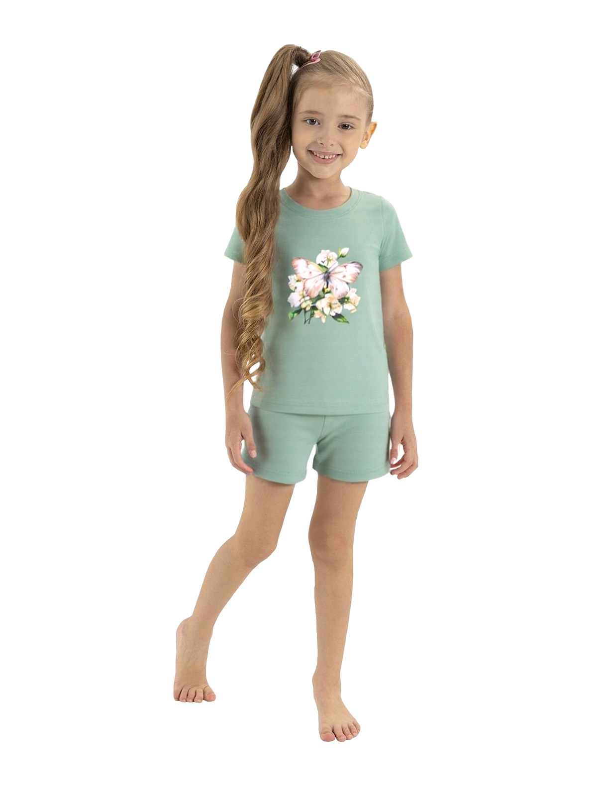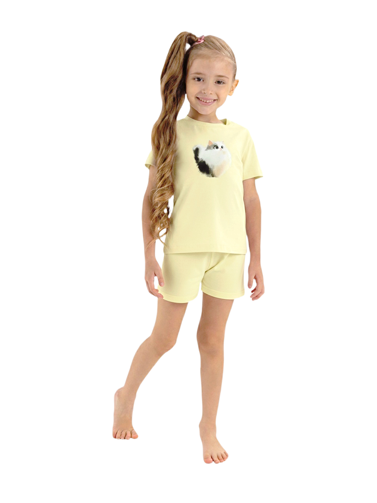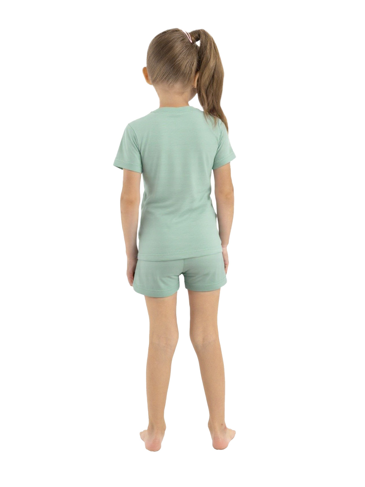 Пижама для девочки из тонкого трикотажа; джемпер с короткими рукавами, по горловине притачивается бейка, на полочке принт; шорты с цельнокроеным поясом с внутренней эластичной лентой.