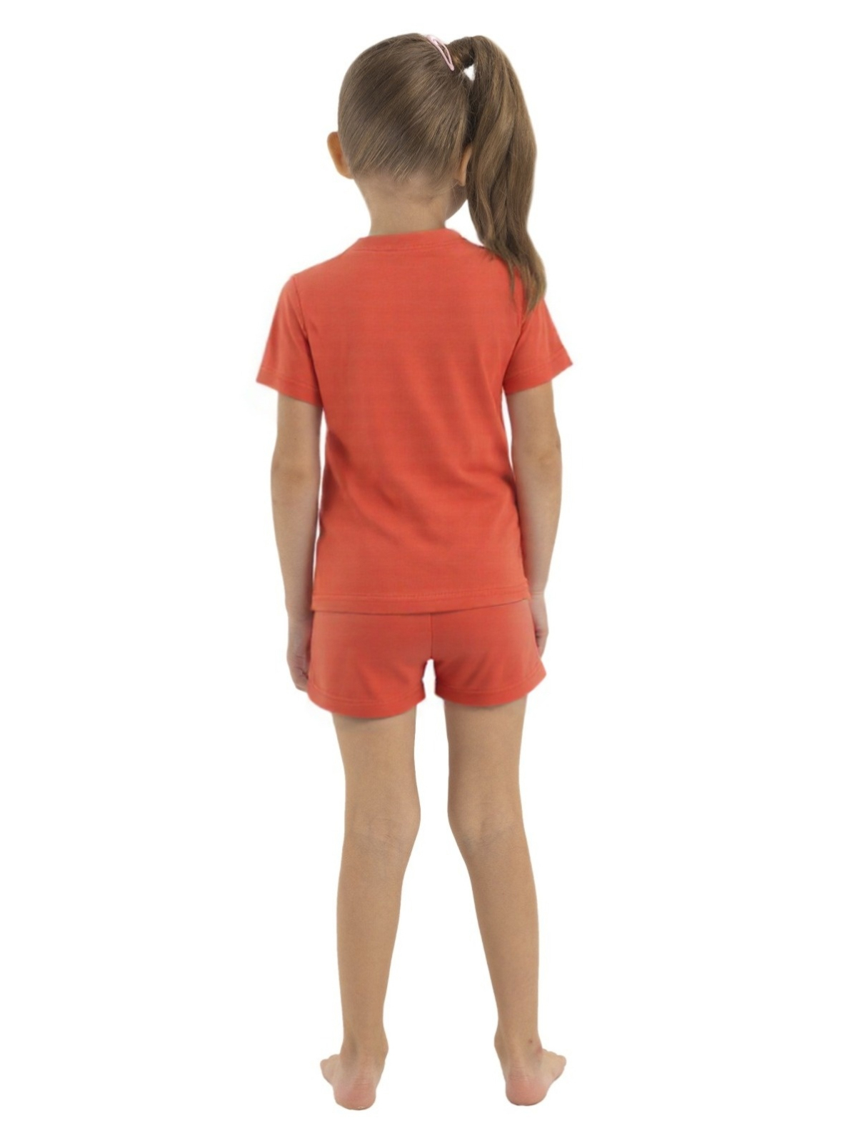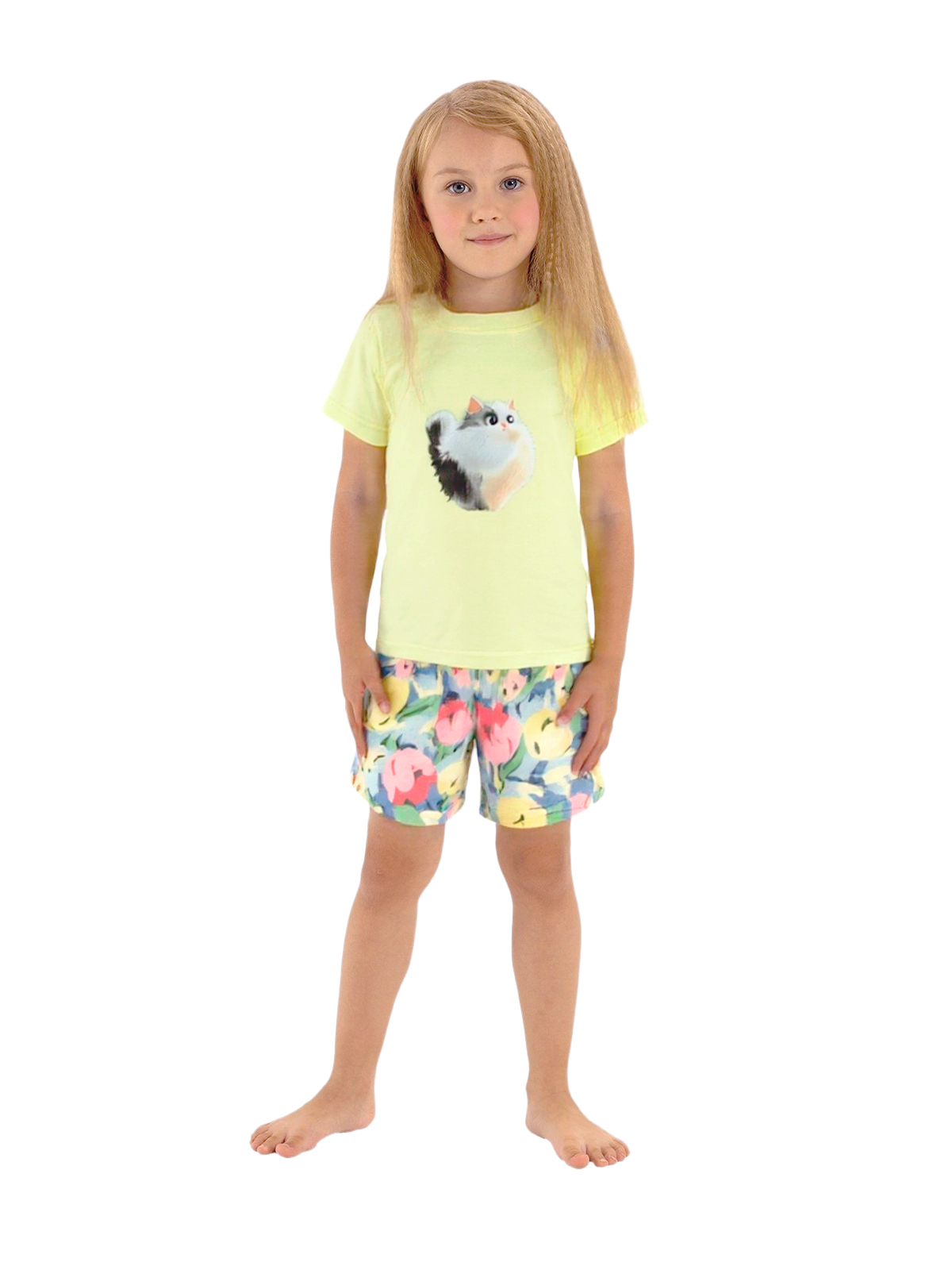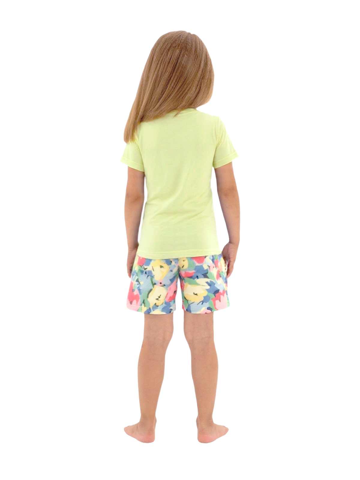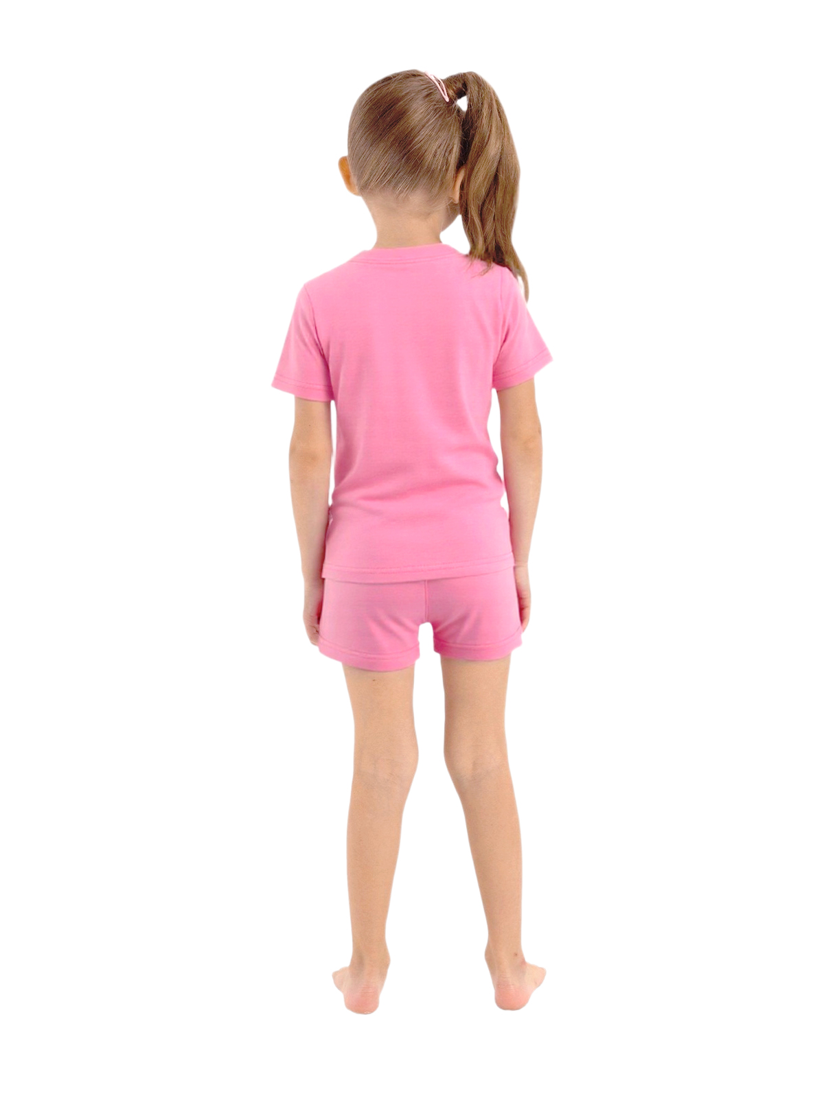 Пижама для девочки из тонкого трикотажа; джемпер с короткими рукавами, по горловине притачивается бейка, на полочке принт; шорты с цельнокроеным поясом с внутренней эластичной лентой.