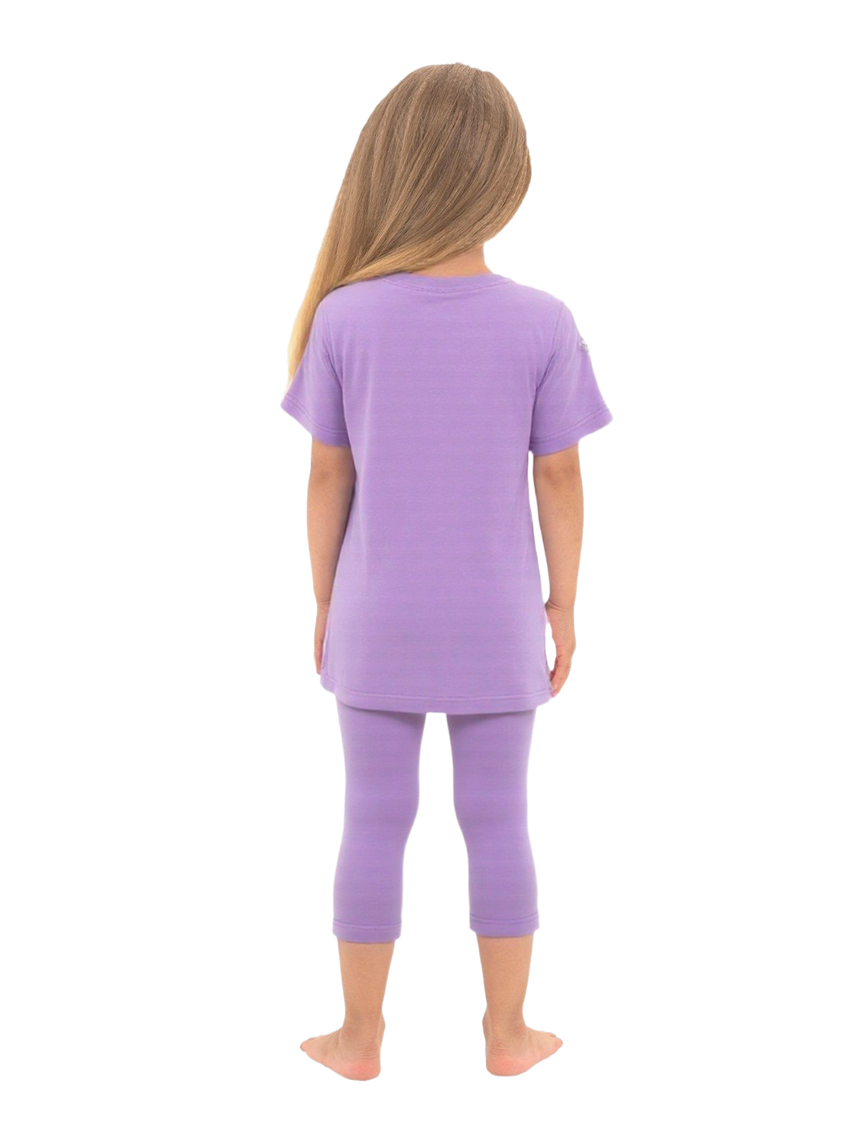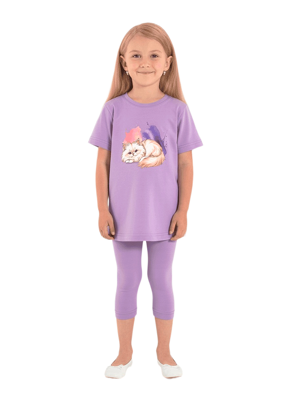 Пижама для девочки из тонкого трикотажа; джемпер с короткими рукавами, по горловине притачивается бейка, на полочке принт; шорты с цельнокроеным поясом с внутренней эластичной лентой.