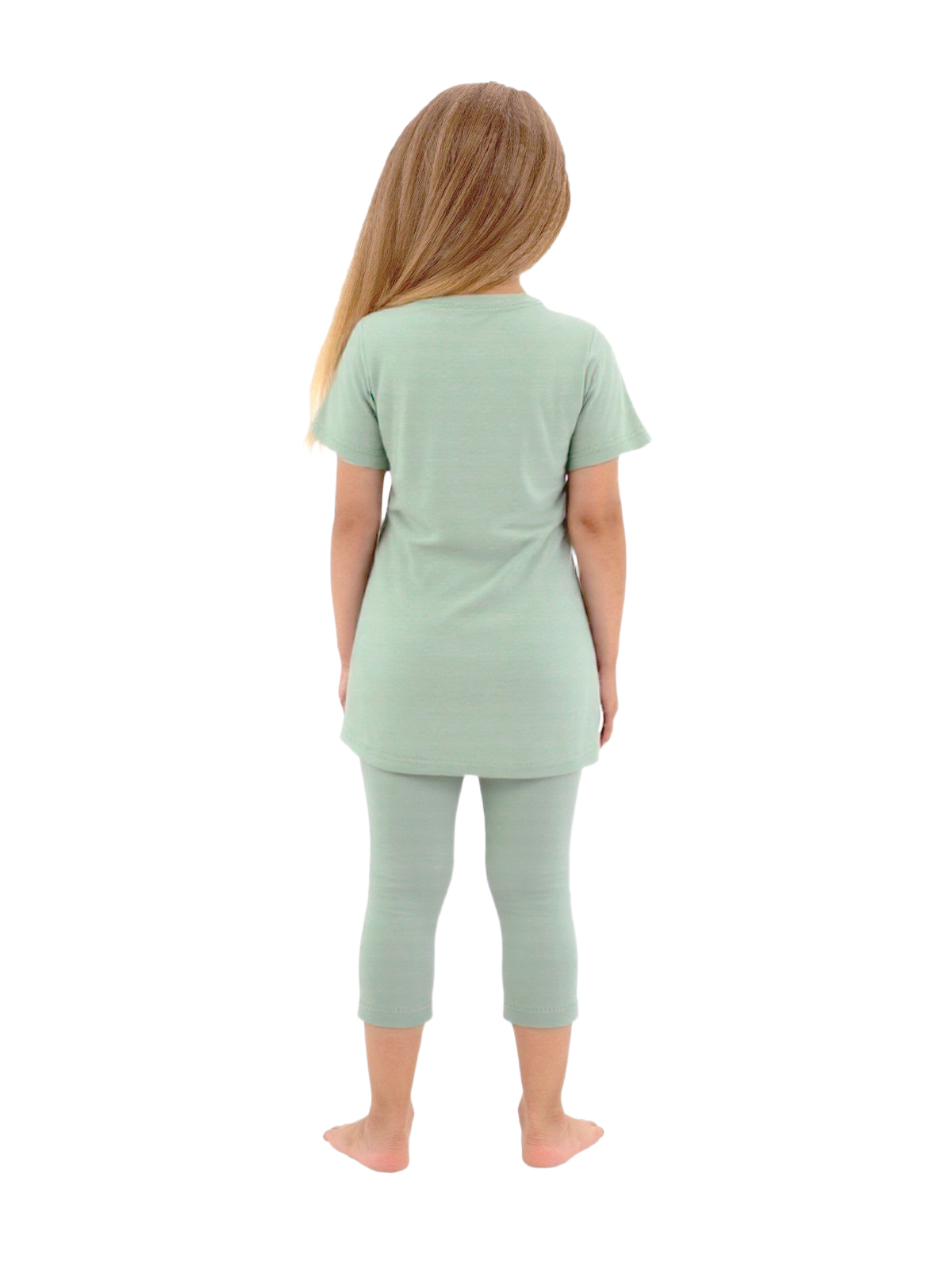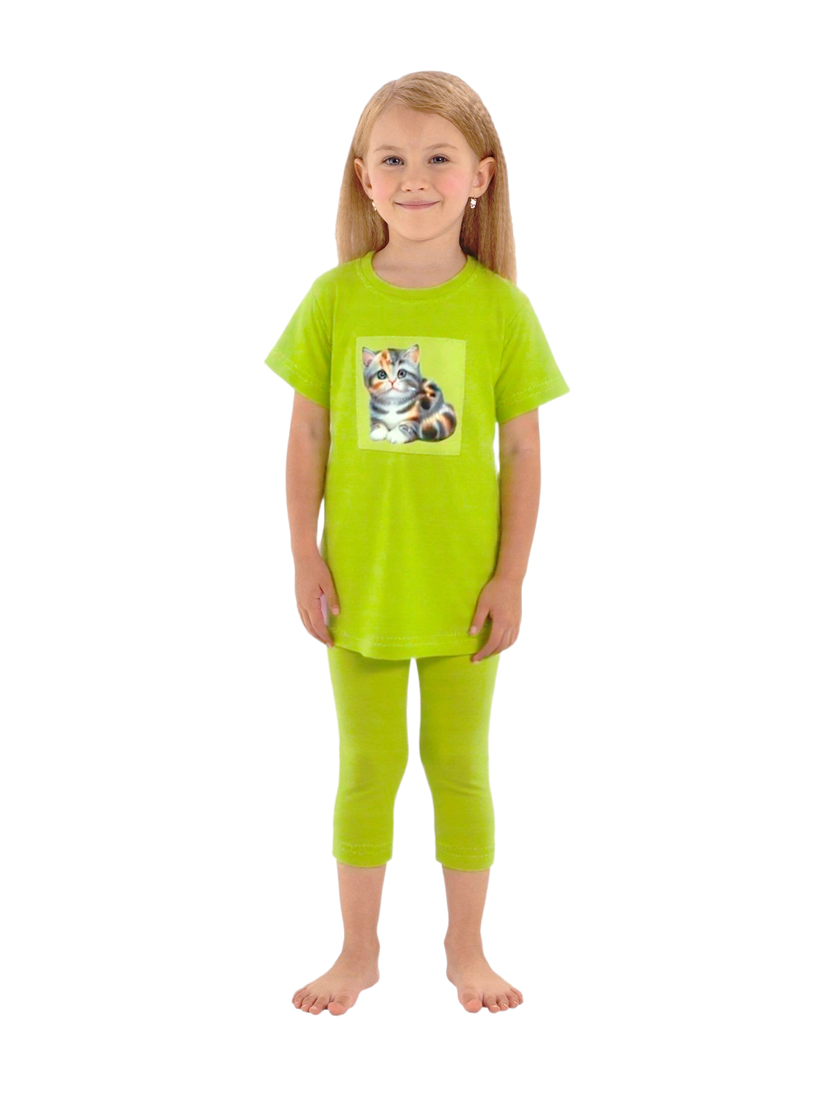 Пижама для девочки из тонкого трикотажа; удлиненный джемпер с короткими рукавами, по горловине притачивается бейка, на полочке мягкая нашивка; бриджи с цельнокроеным поясом с внутренней эластичной лентой.