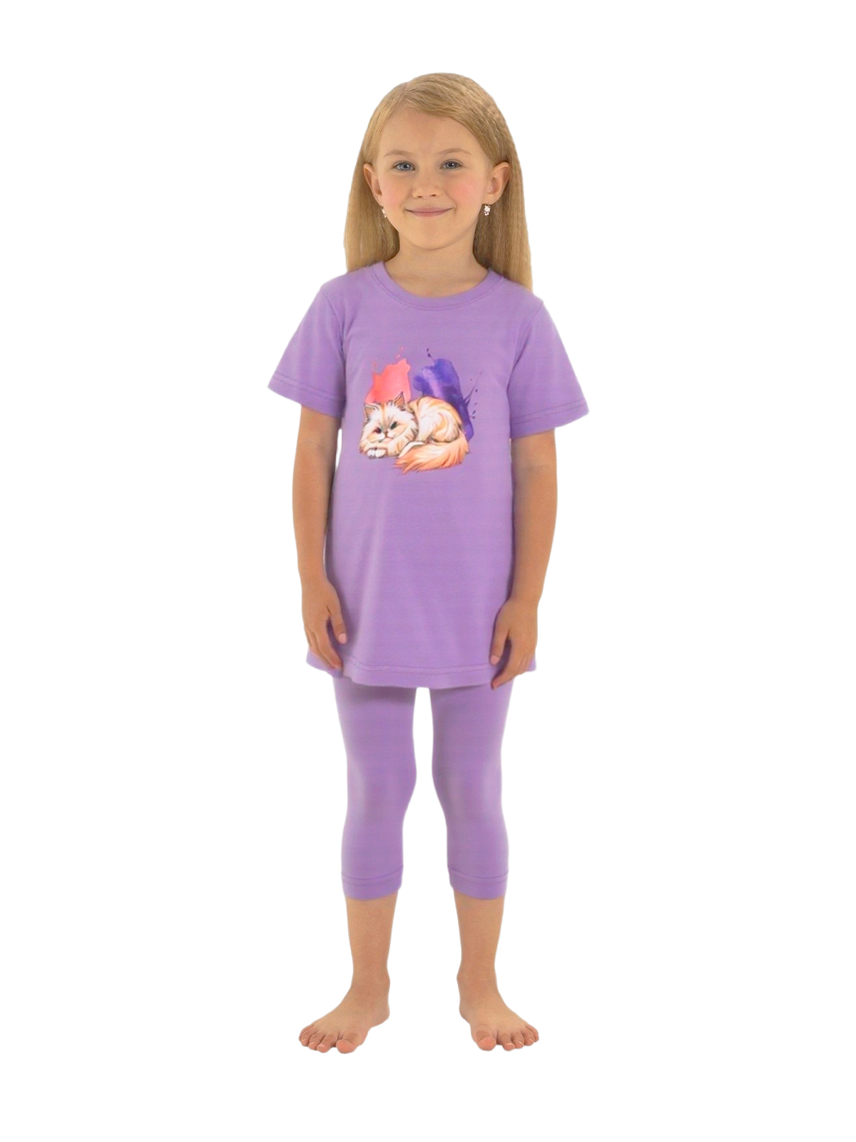 Пижама для девочек из трикотажа, туника с короткими рукавами, на полочке принт, по горловине притачивается бейка, бриджи с цельнокроеным поясом с внутренней эластичной лентой.