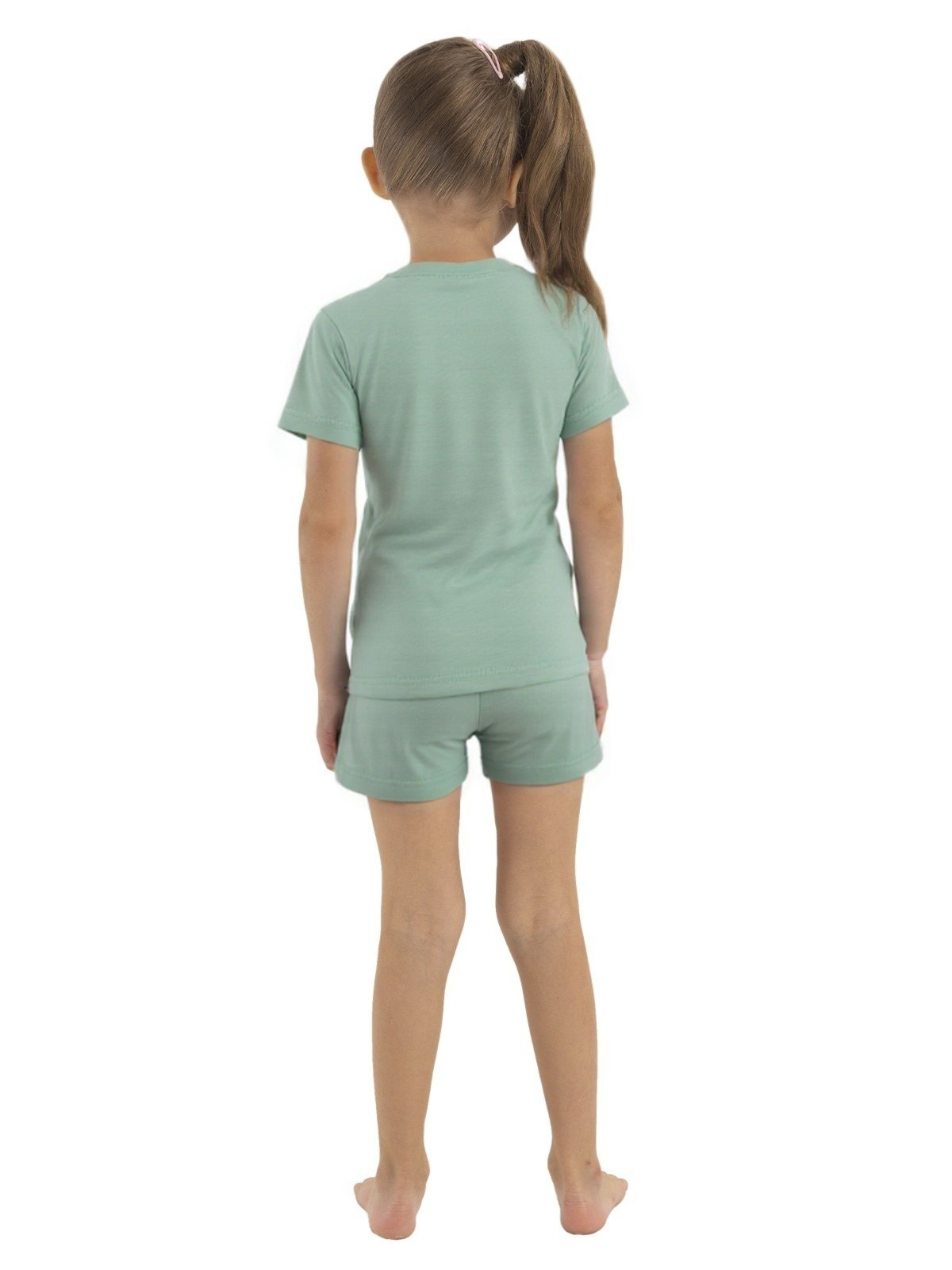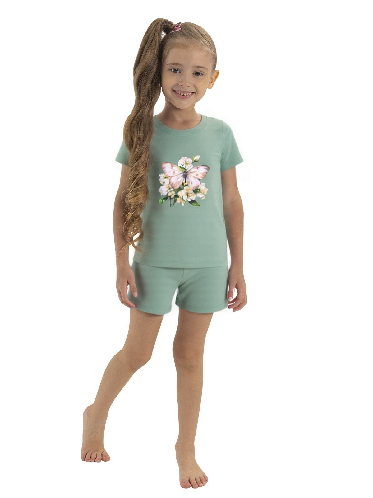 Пижама для девочки из тонкого трикотажа; джемпер с короткими рукавами, по горловине притачивается бейка, на полочке принт; шорты с цельнокроеным поясом с внутренней эластичной лентой.