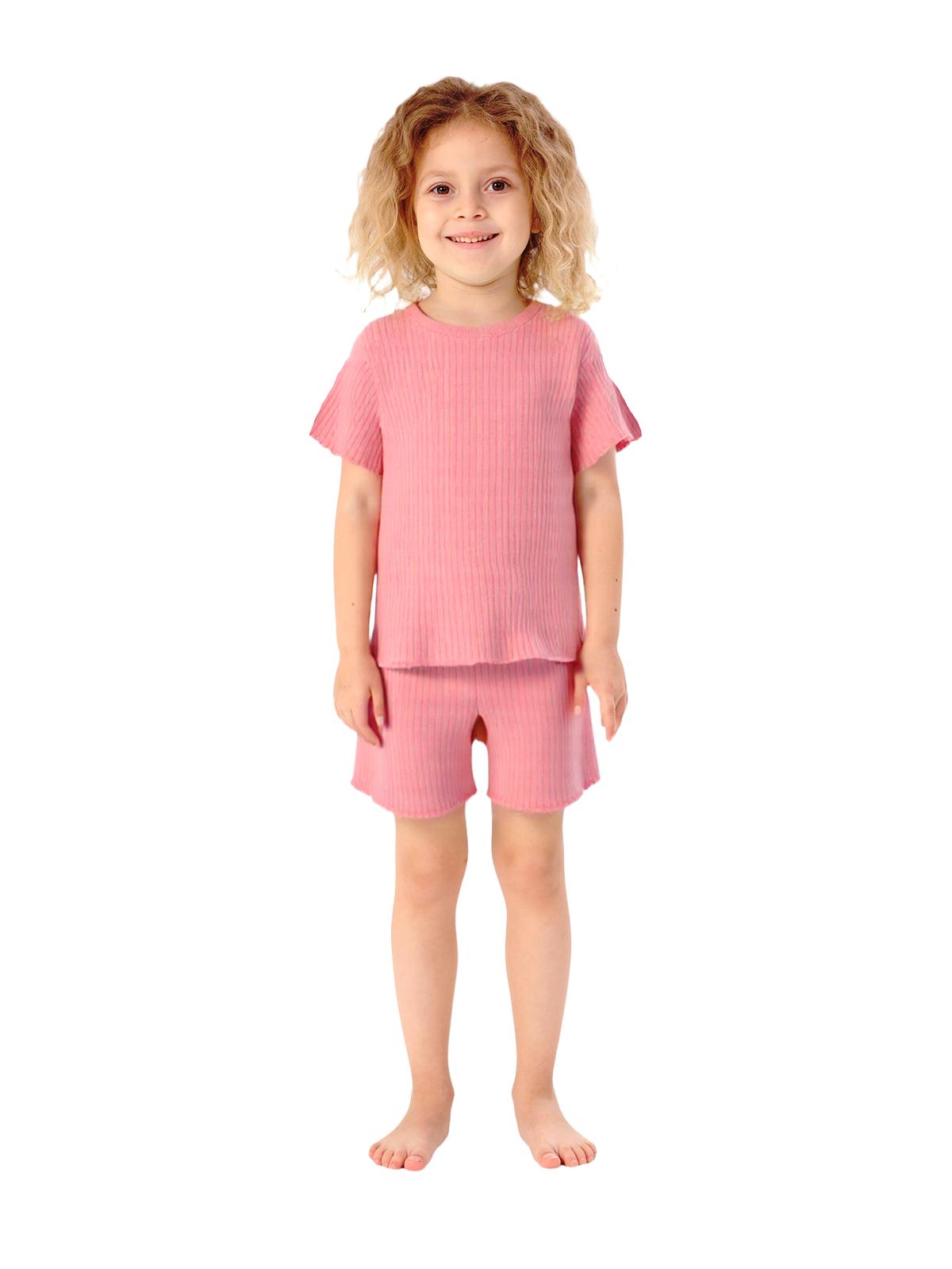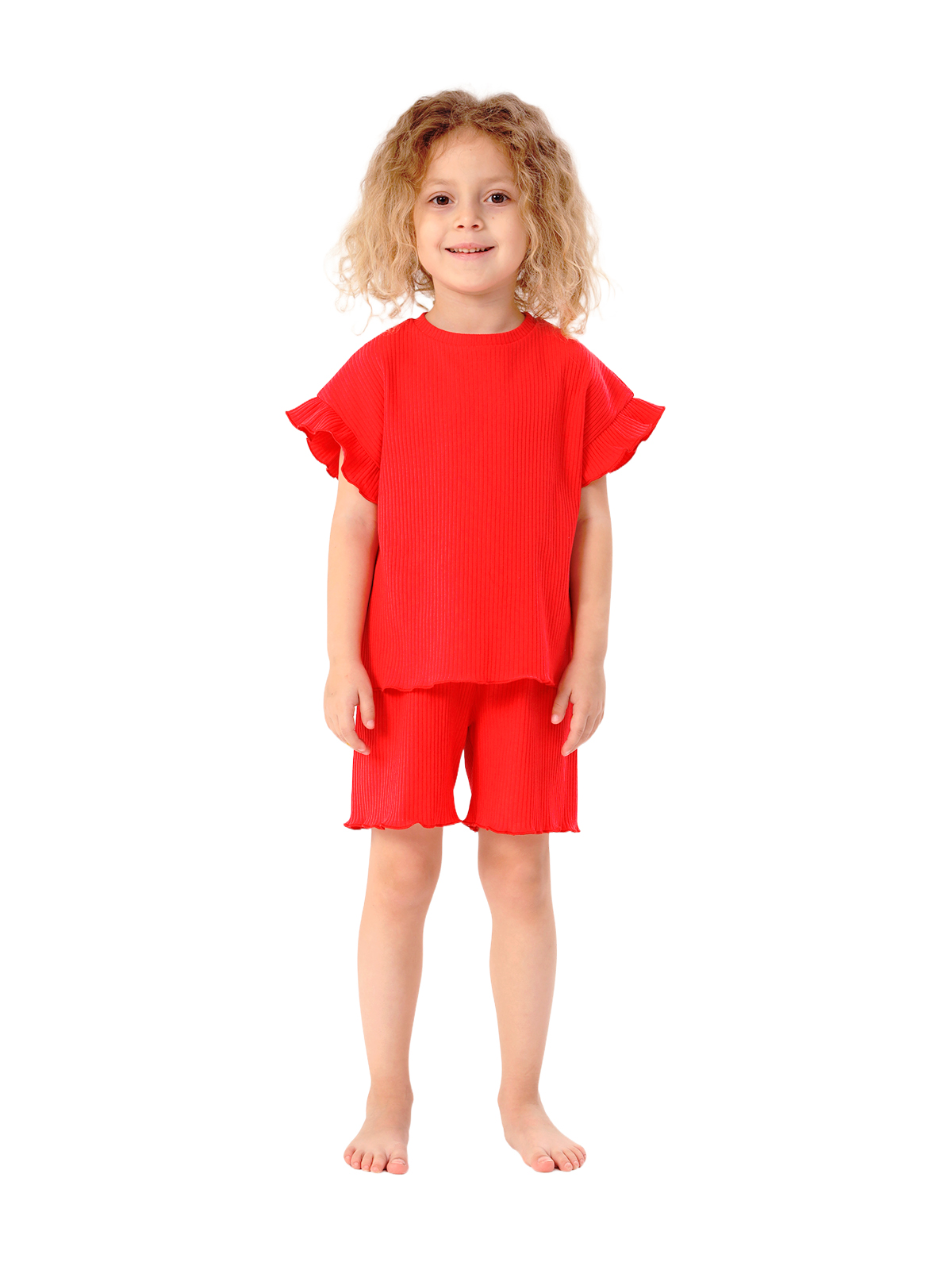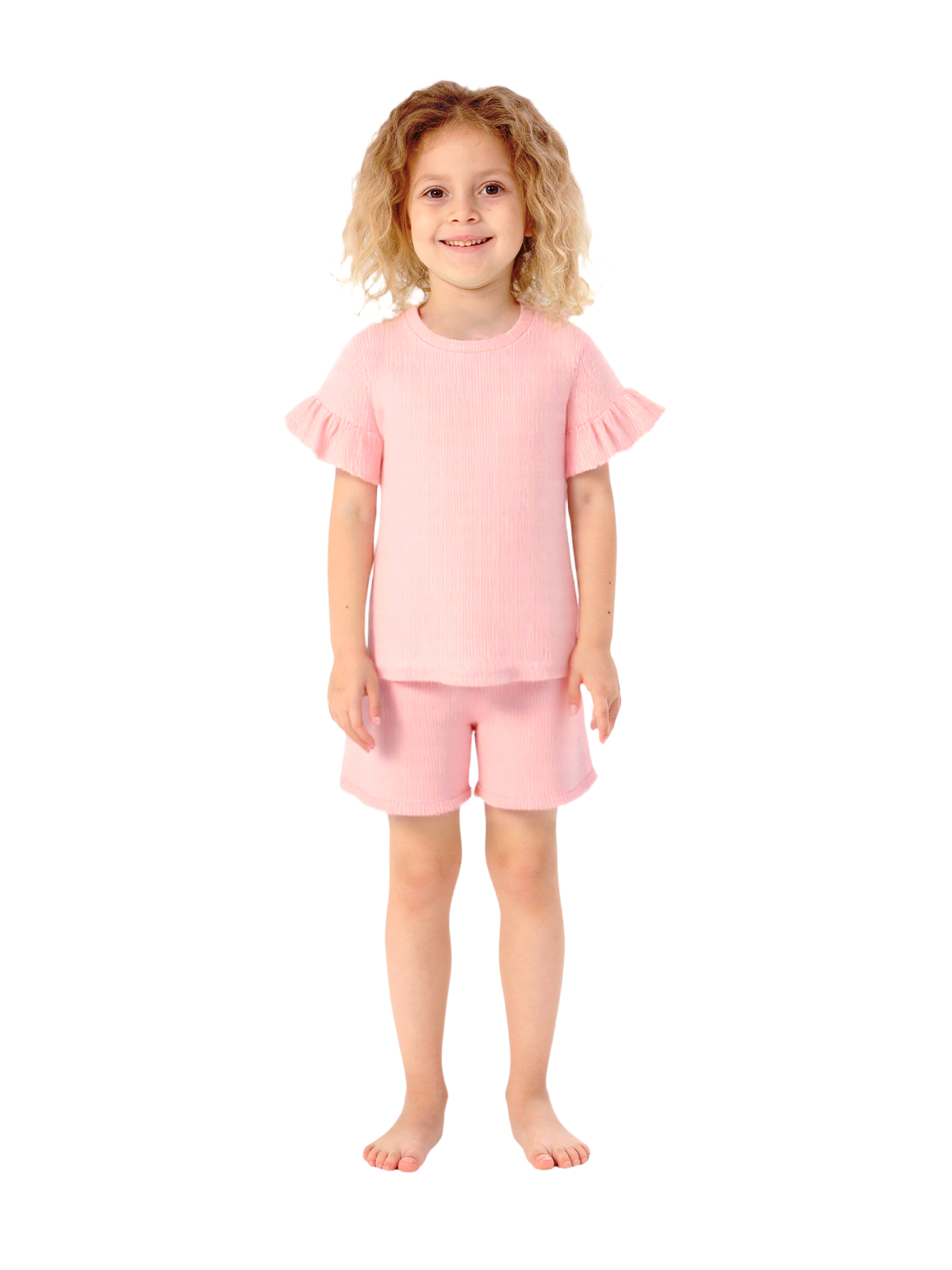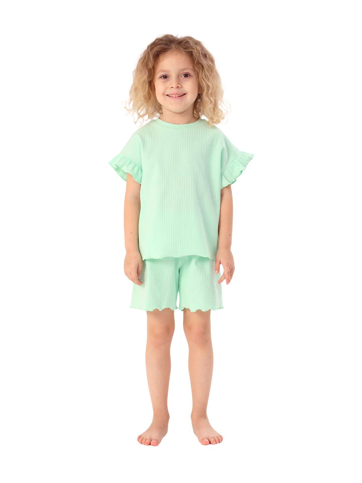 Пижама для девочек из фактурного трикотажа, джемпер со спущенным плечом, по пройме настрачивается оборка, шорты с цельнокроеным поясом с внутренней эластичной лентой.
