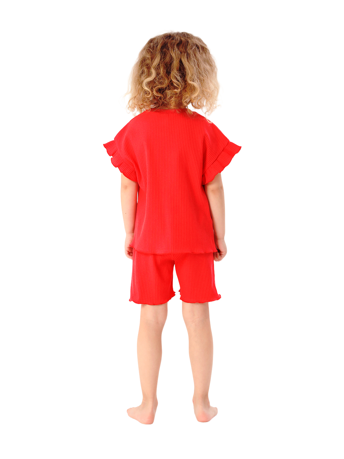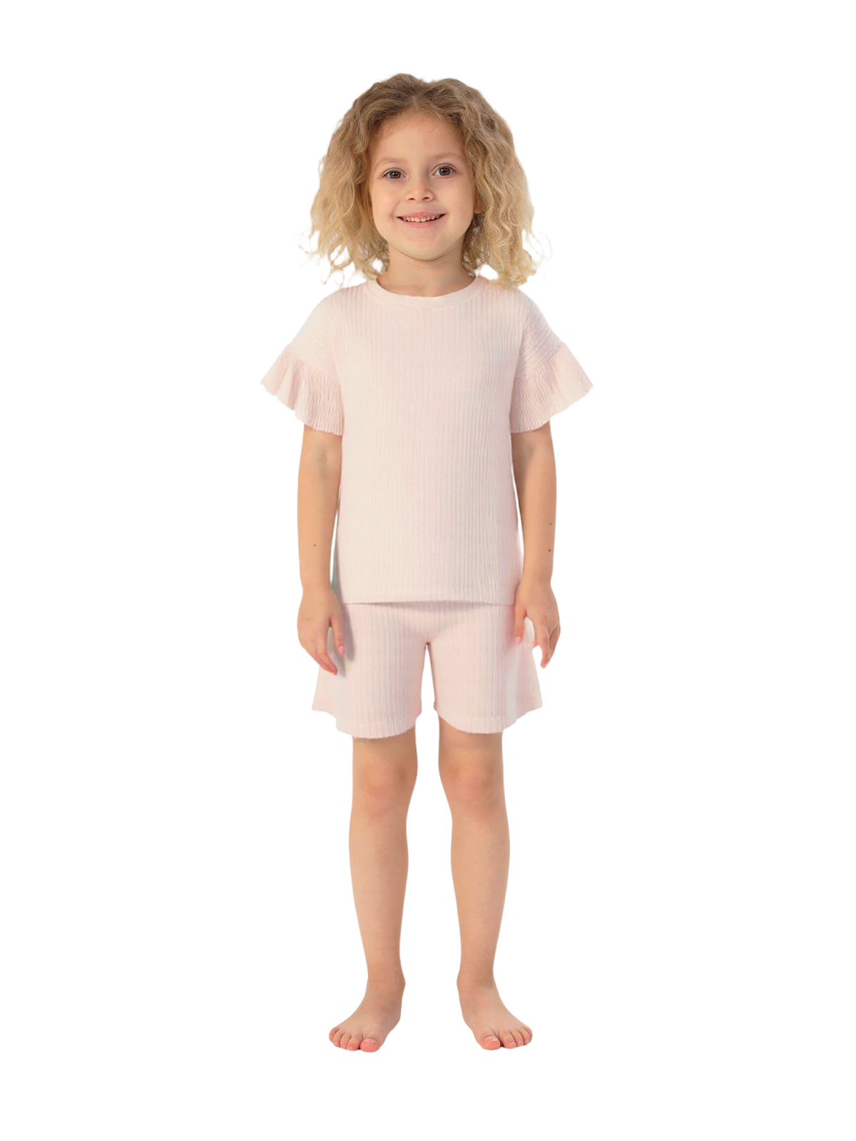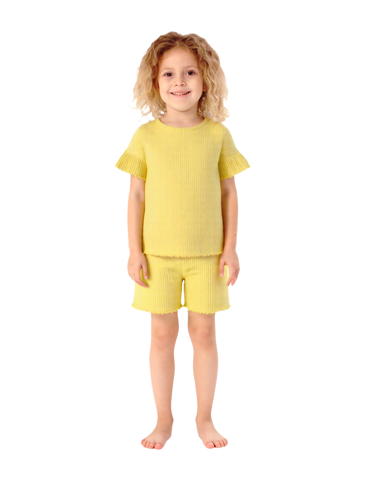 Пижама для девочек из фактурного трикотажа, джемпер со спущенным плечом, по пройме настрачивается оборка, шорты с цельнокроеным поясом с внутренней эластичной лентой.