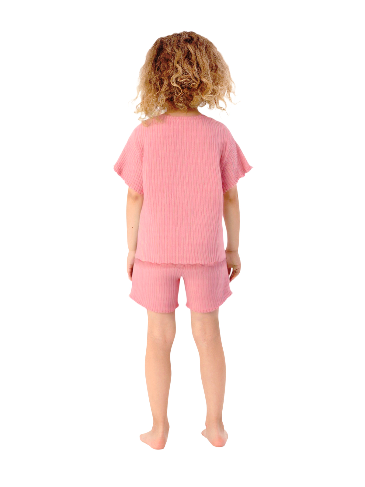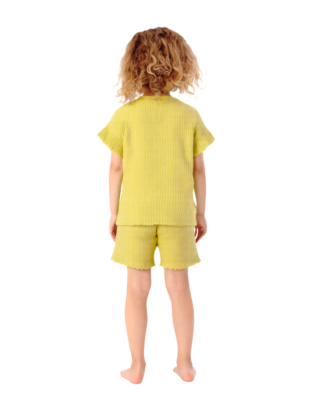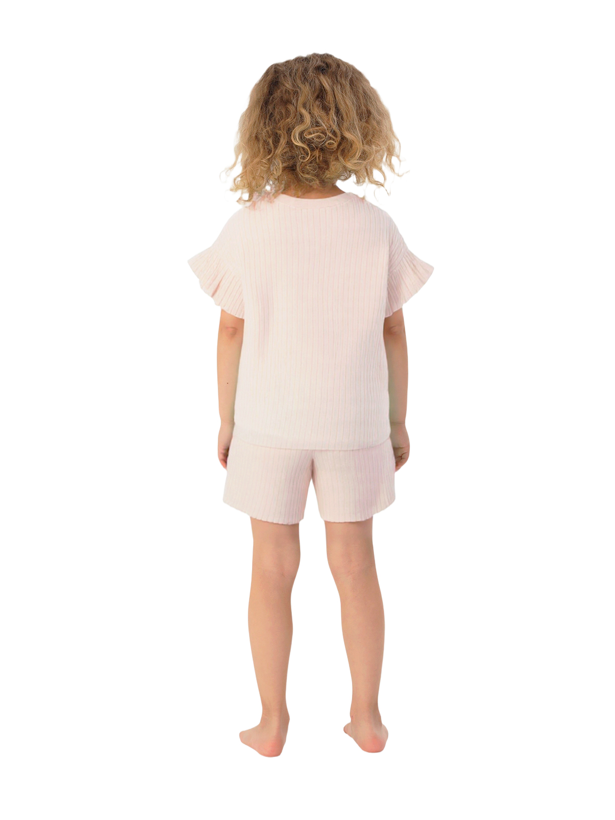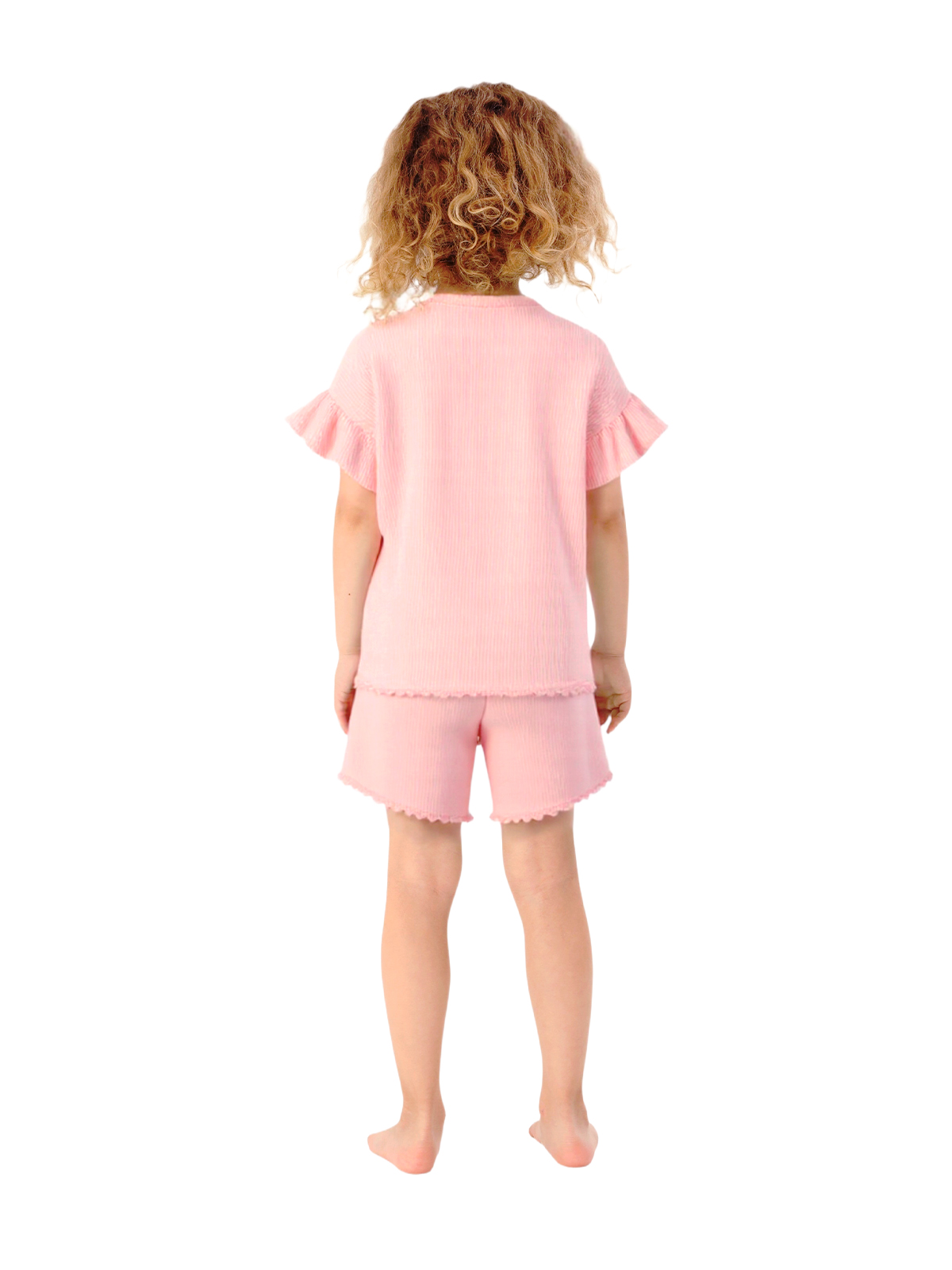Пижама для девочек из фактурного трикотажа, джемпер со спущенным плечом, по пройме настрачивается оборка, шорты с цельнокроеным поясом с внутренней эластичной лентой.