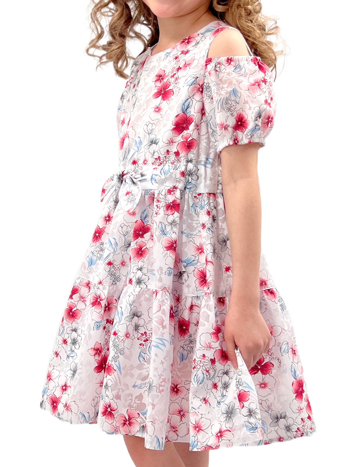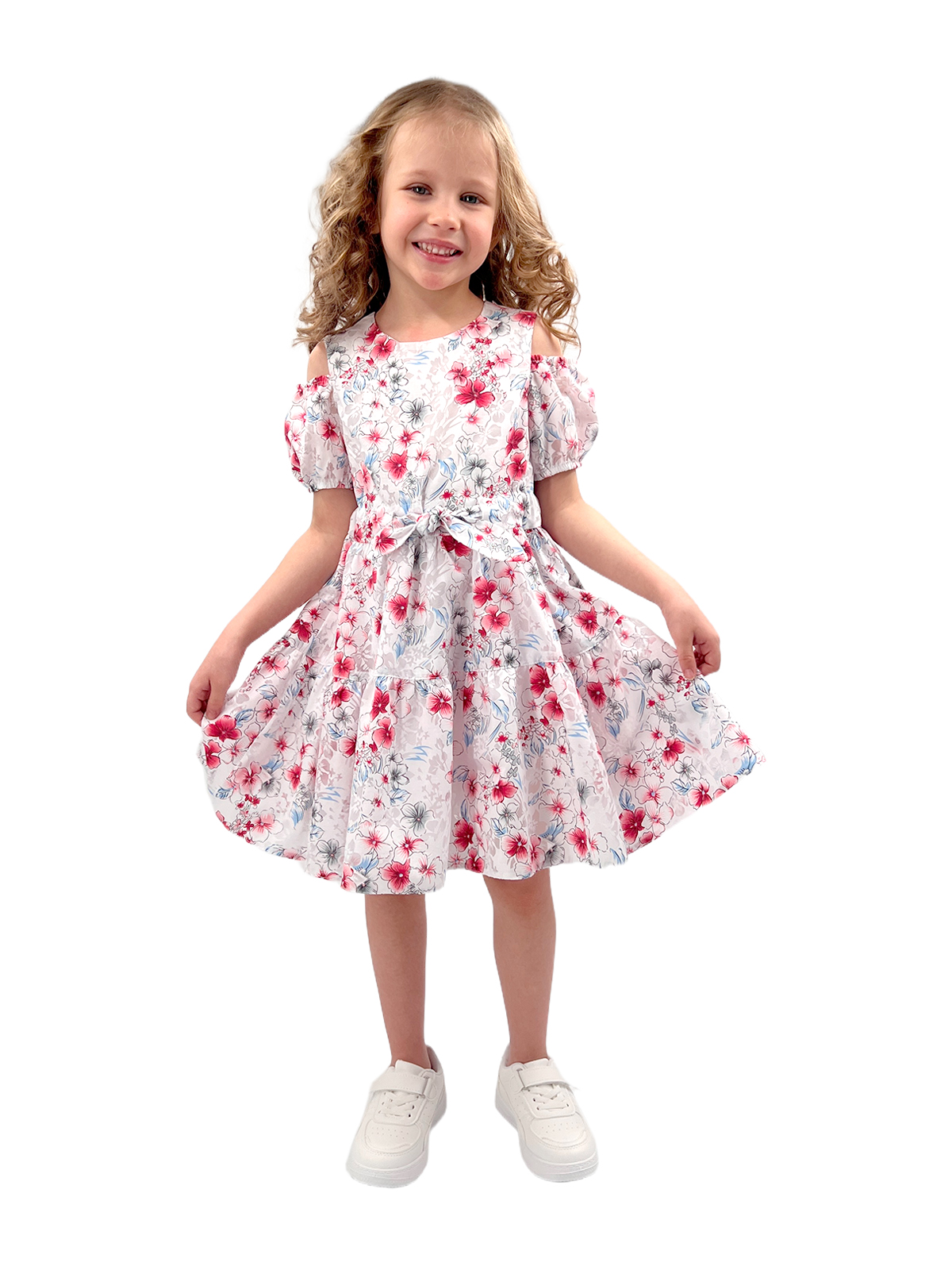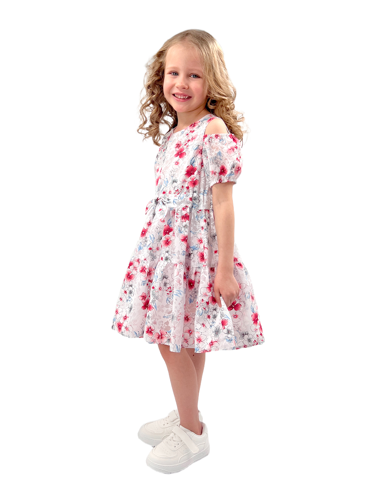 Нарядное платье из шифона с рисунком, пышные рукава с кулисой на резинке, на спинке застежка - разрез с пуговицей, отрезная линия, пояс - кулиса, юбка со сборкой из двух частей, поясом-кулисой с декоративными завязками. Изделие на подкладке.