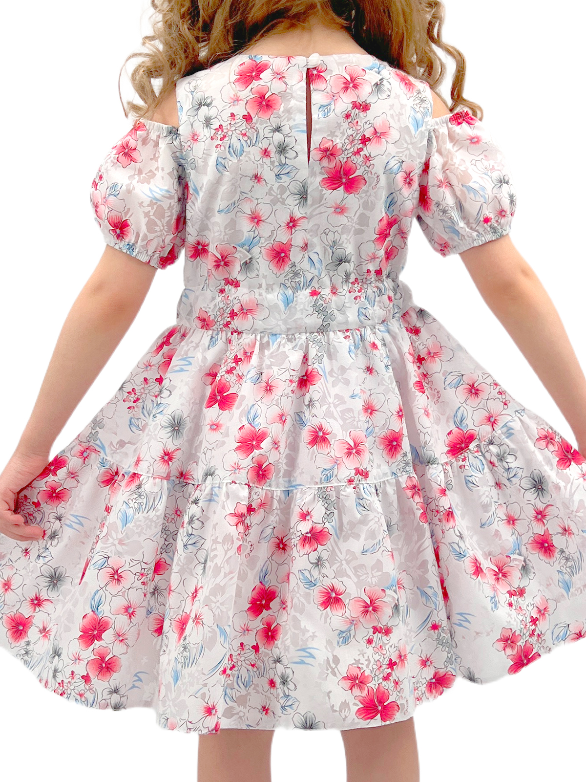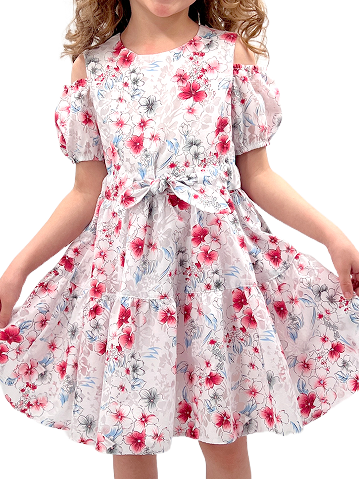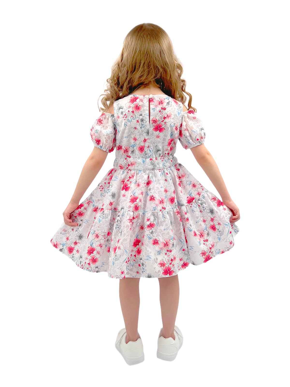 Нарядное платье из шифона с рисунком, пышные рукава с кулисой на резинке, на спинке застежка - разрез с пуговицей, отрезная линия, пояс - кулиса, юбка со сборкой из двух частей, поясом-кулисой с декоративными завязками. Изделие на подкладке.