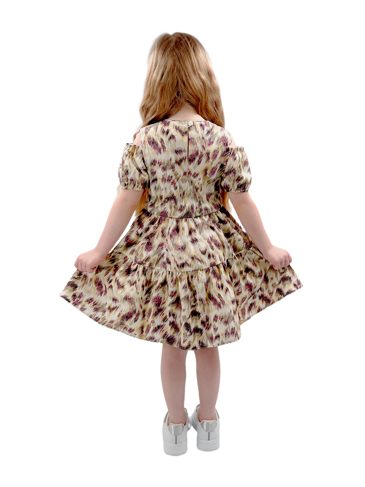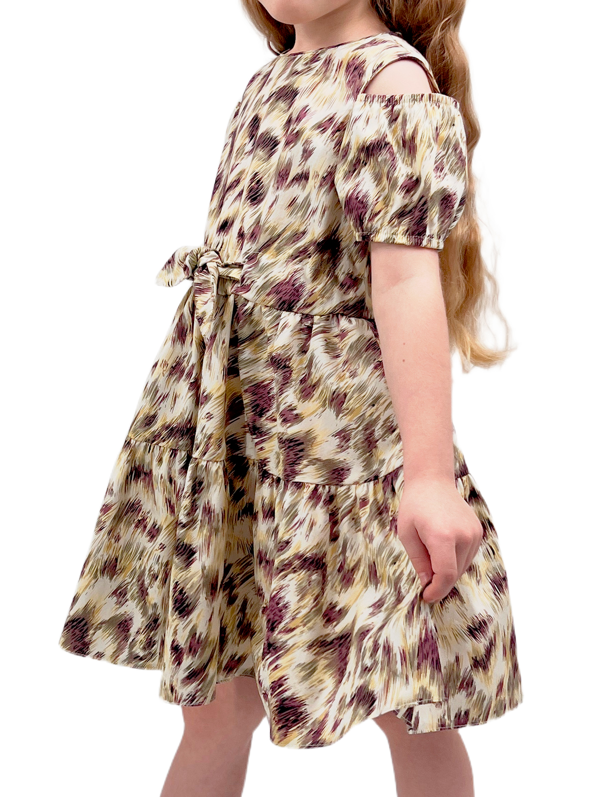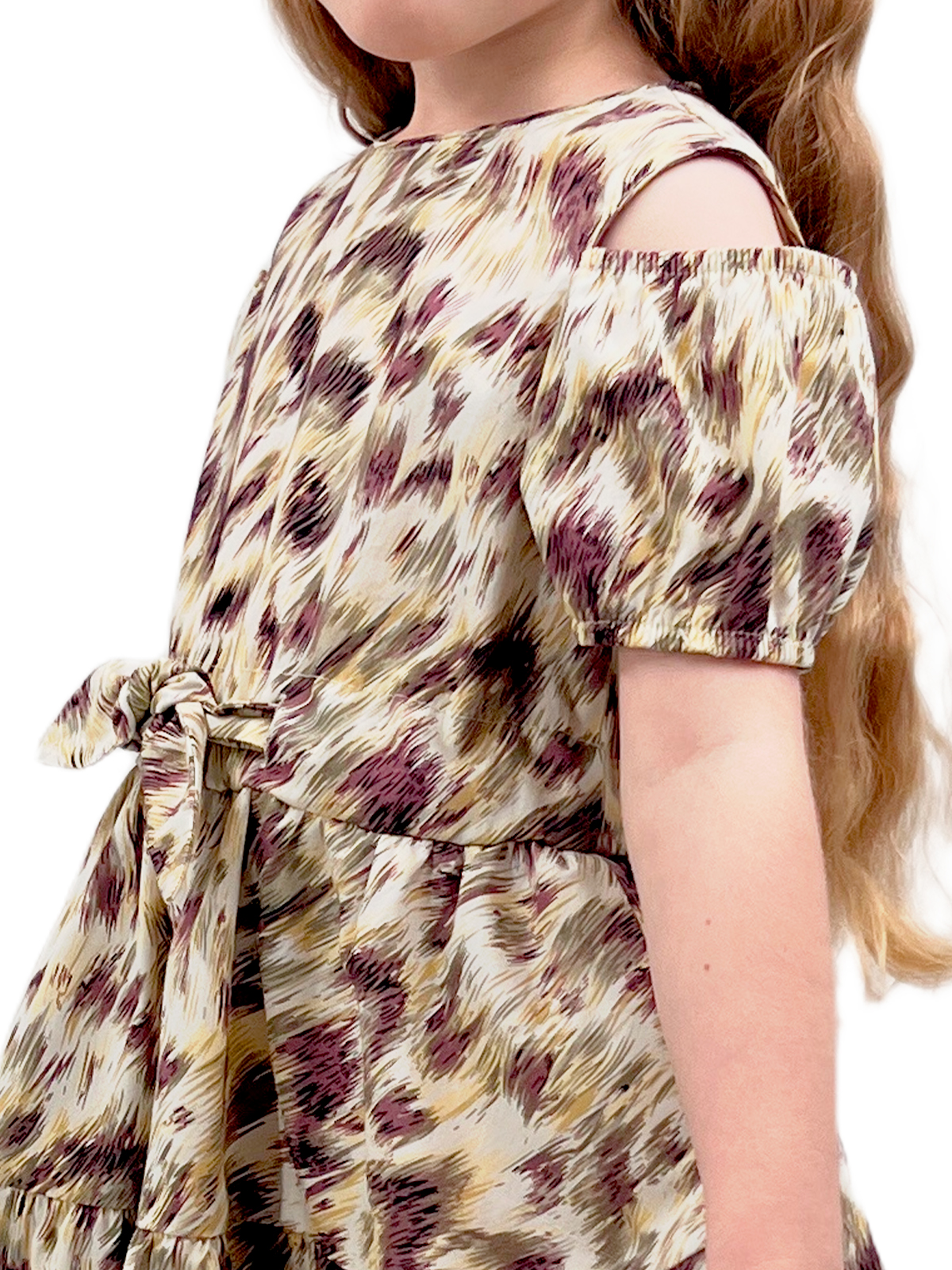 Платье со спущенным плечом из хлопка, пышные рукава с кулисой на резинке, на спинке застежка - разрез с пуговицей, отрезная линия, пояс - кулиса, юбка со сборкой из двух частей, поясом-кулисой с декоративными завязками.