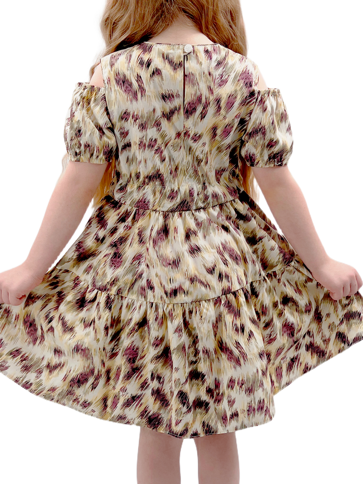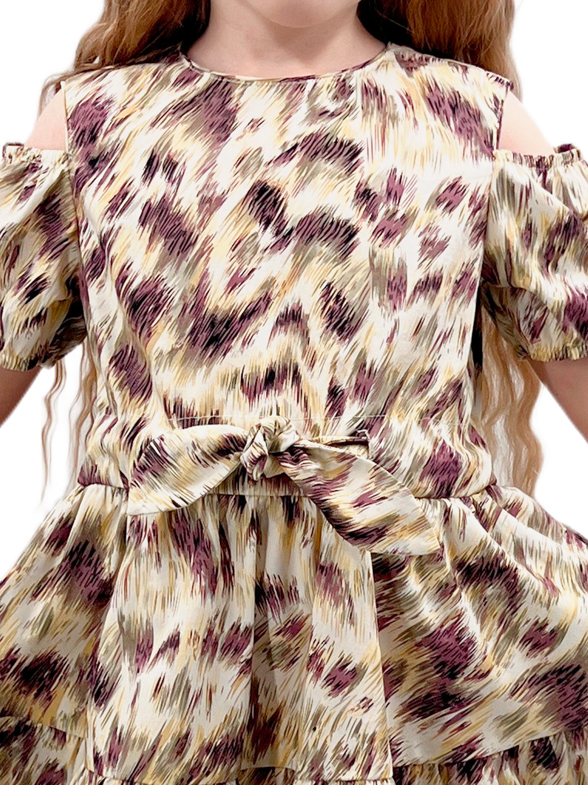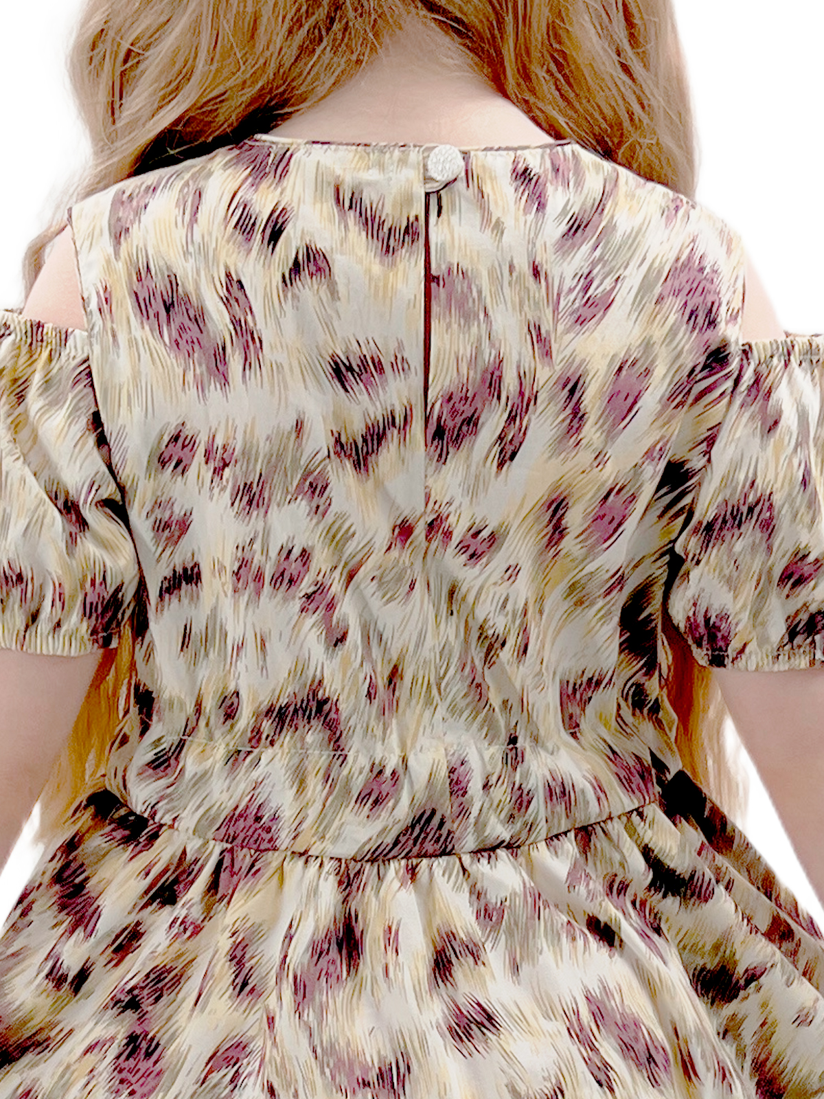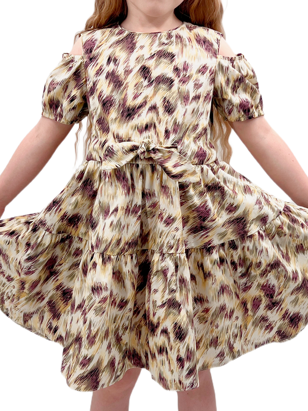 Платье со спущенным плечом из хлопка, пышные рукава с кулисой на резинке, на спинке застежка - разрез с пуговицей, отрезная линия, пояс - кулиса, юбка со сборкой из двух частей, поясом-кулисой с декоративными завязками.
