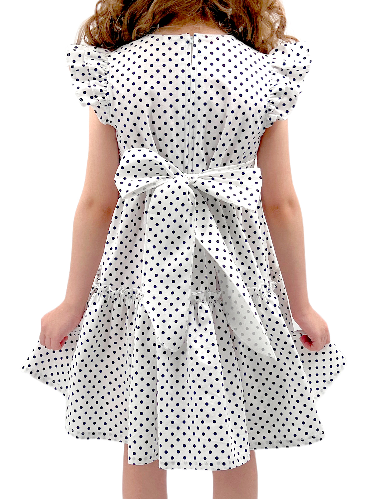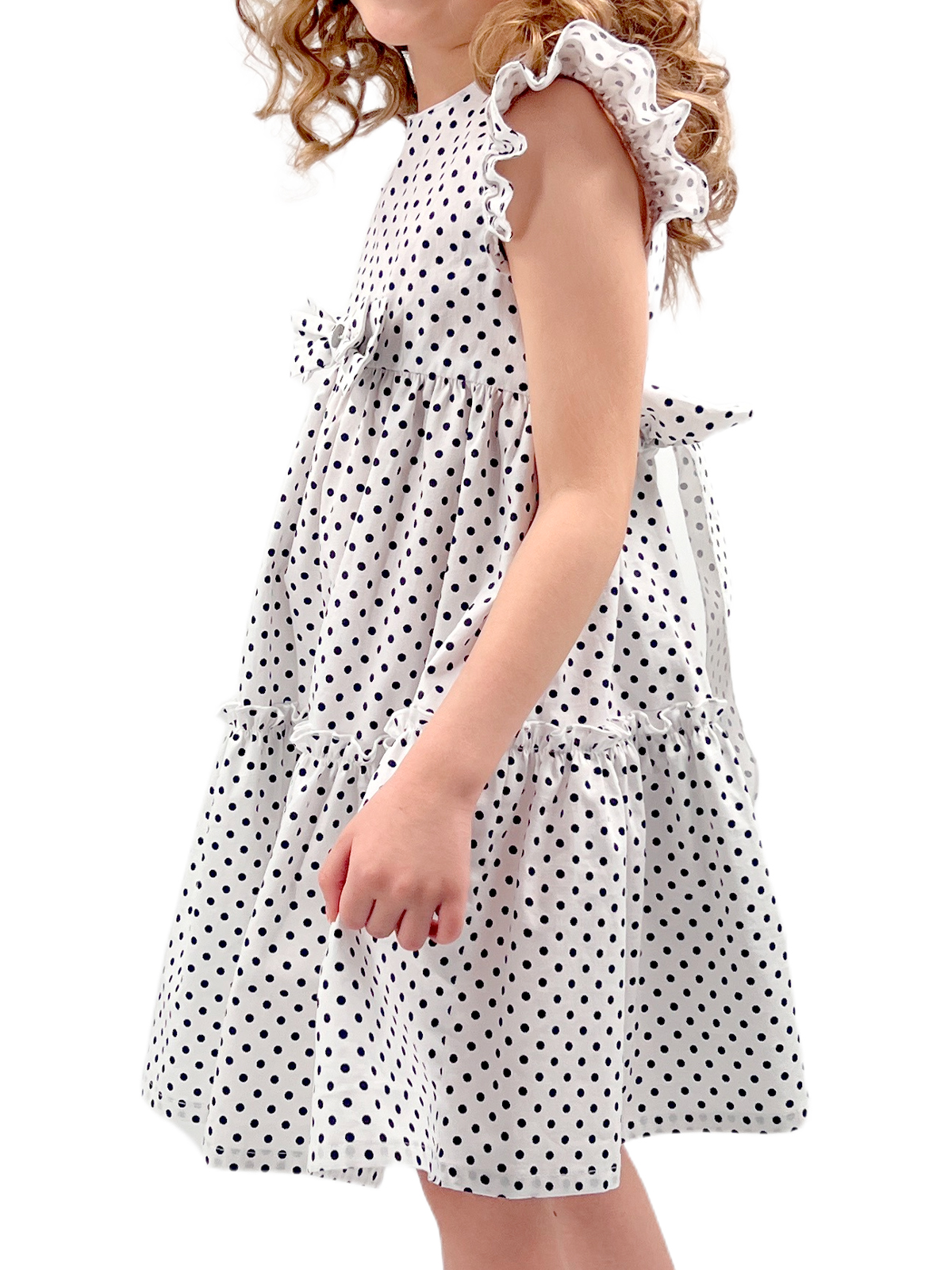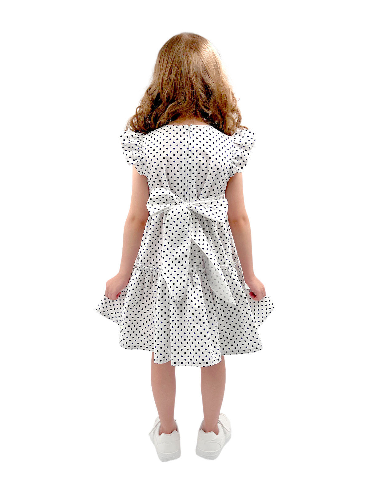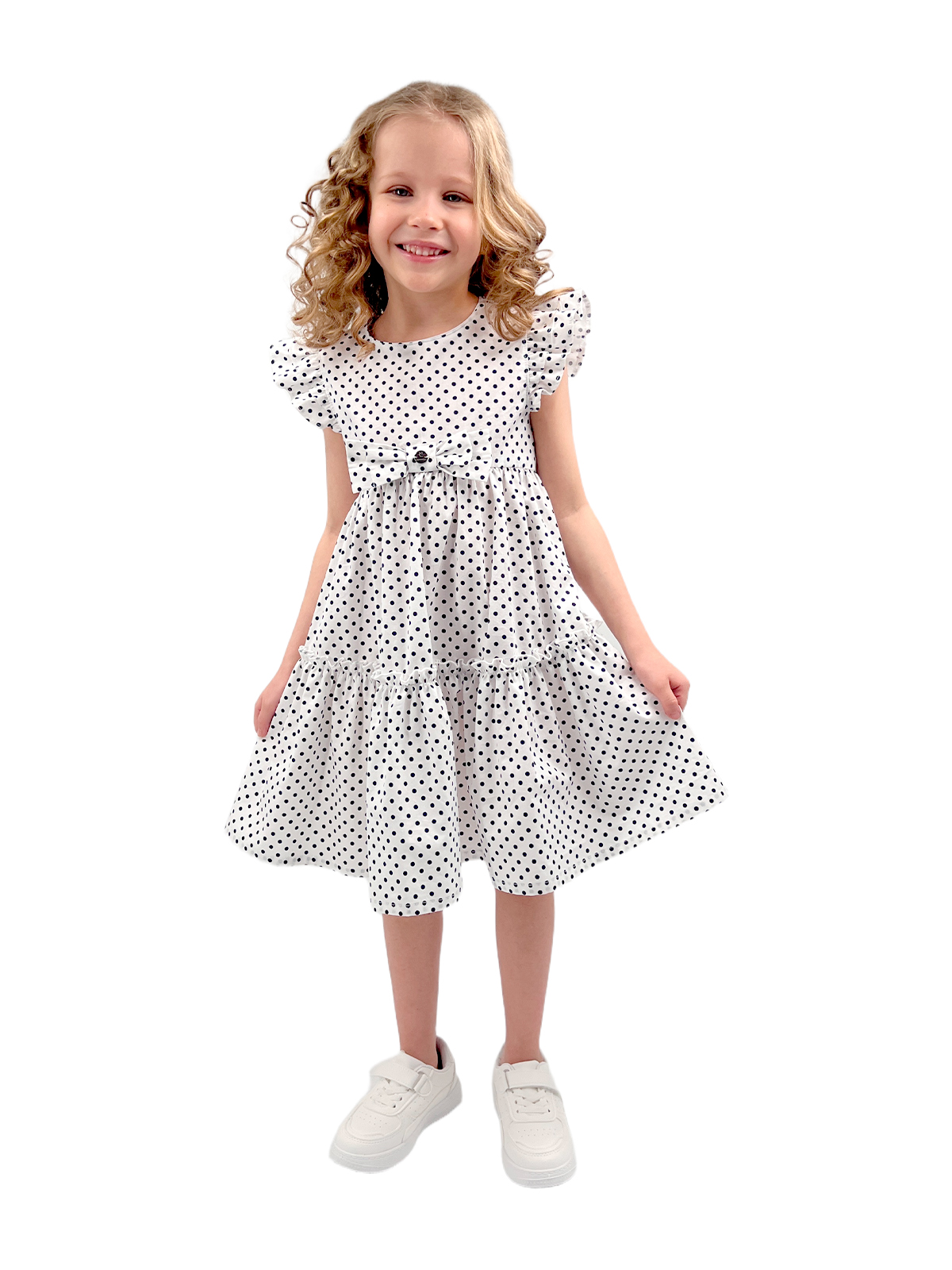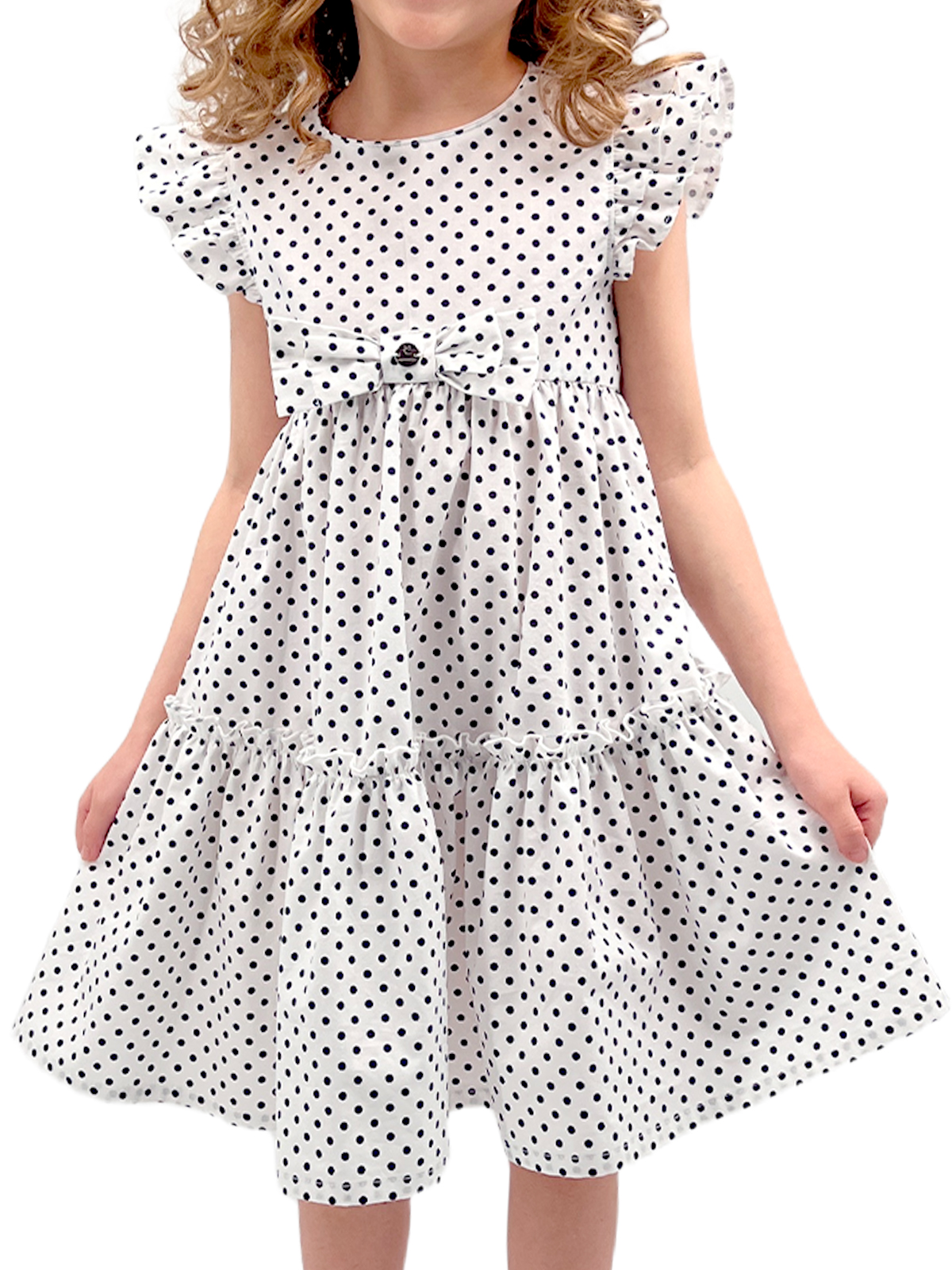 Платье из тонкого хлопка с дизайнерским рисунком, с завышенной линией талии, рукава-«крылышки» два ряда, круглая горловина, на полочке бант с металлическим украшением с логотипом, юбка со сборкой, к низу юбки притачивается широкая оборка со сборкой, на спинке застежка на молнию, полупояса.