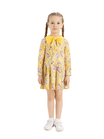 Платье из тонкого гладко-окрашенного трикотажа и трикотажа с рисунком, длинные рукава, круглый воротник с оборкой со сгибом, заниженная линия талии, юбка со сборкой, на лифе принт с декоративным бантиком, на спинке шов, застежка разрез с пуговицей.