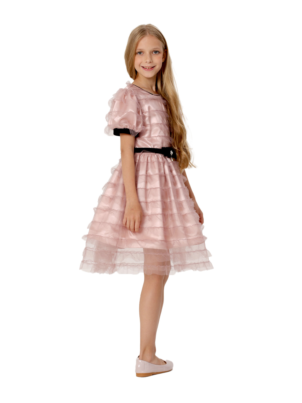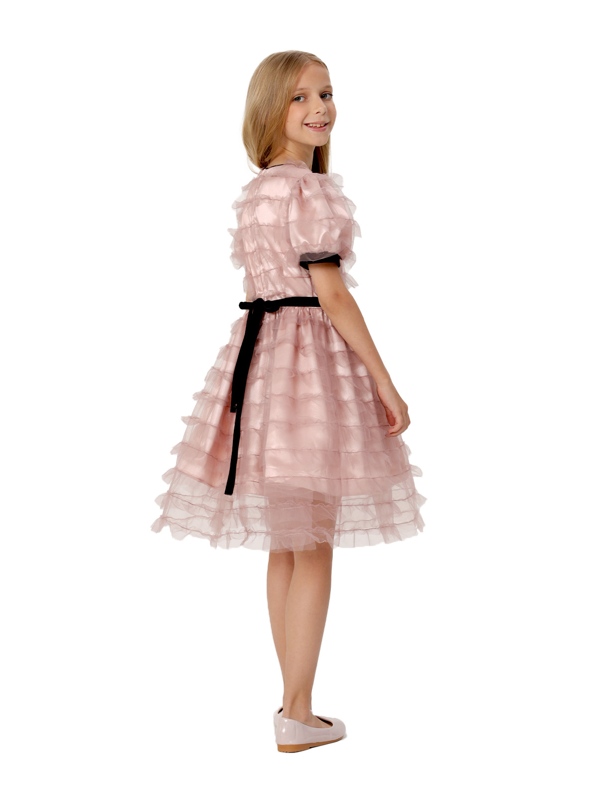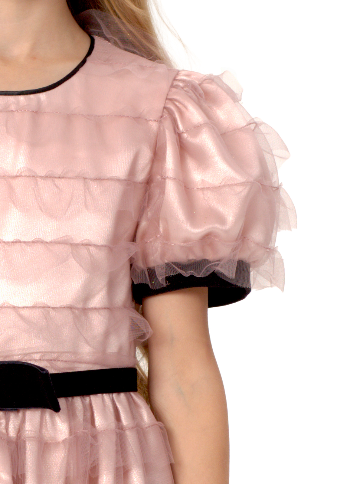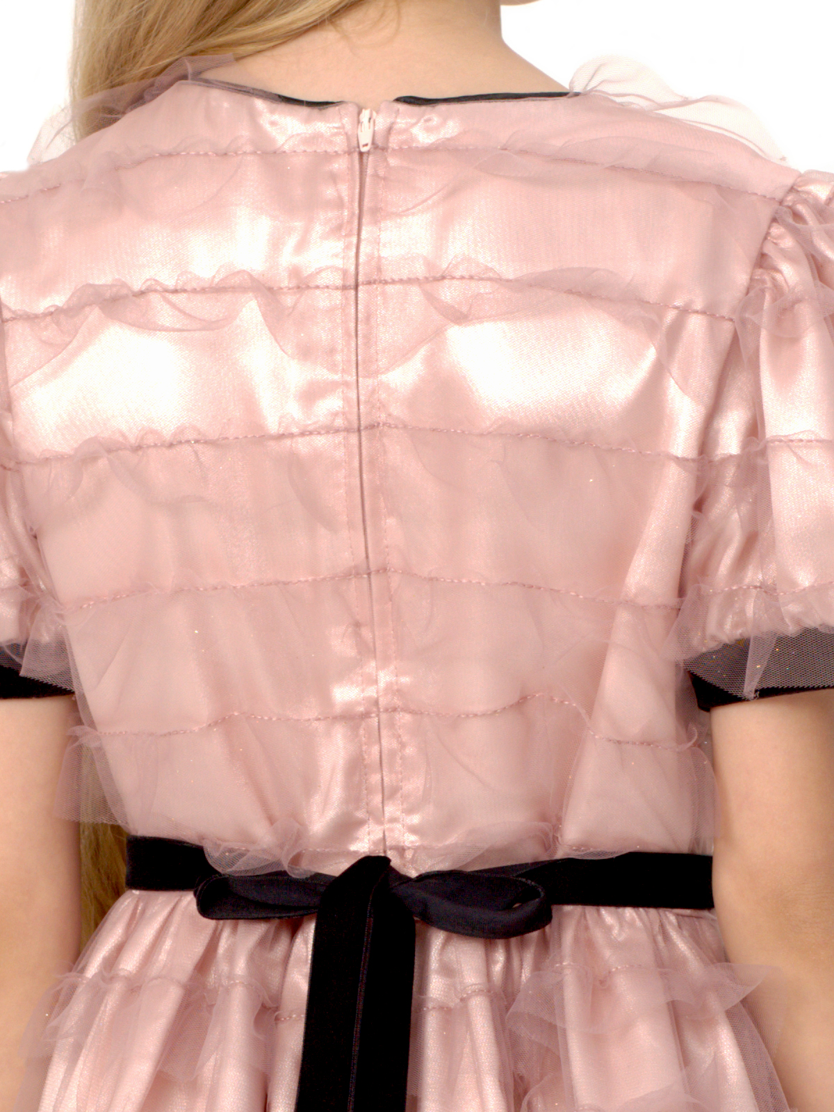 Нарядное платье из трёх слоев: фатин с оборками, фатин, французский шелк, к низу которого притачивается ригилин; отрезное по линии талии; юбка со сборкой; рукава с приточными манжетами; по горловине кант; декоративный пояс с бантом из широкой бархатной ленты; на спинке застёжка в виде длинной молнии.