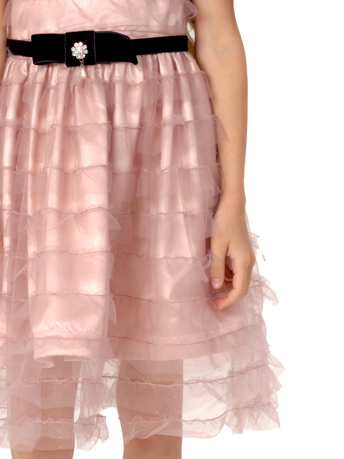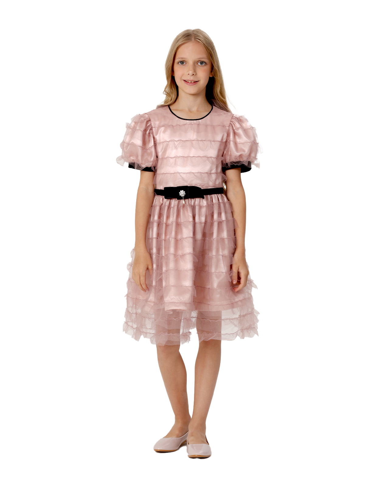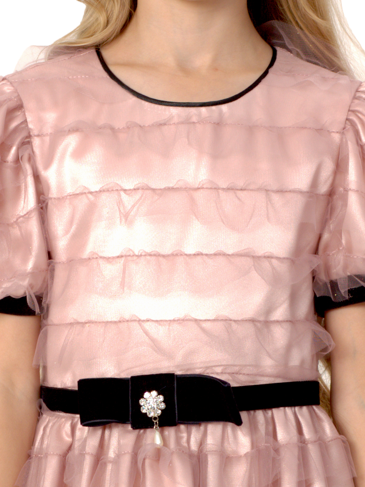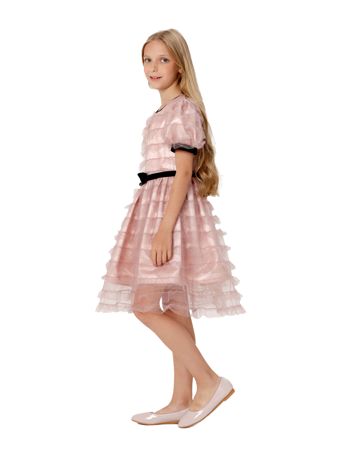 Нарядное платье из трёх слоев: фатин с оборками, фатин, французский шелк, к низу которого притачивается ригилин; отрезное по линии талии; юбка со сборкой; рукава с приточными манжетами; по горловине кант; декоративный пояс с бантом из широкой бархатной ленты; на спинке застёжка в виде длинной молнии.