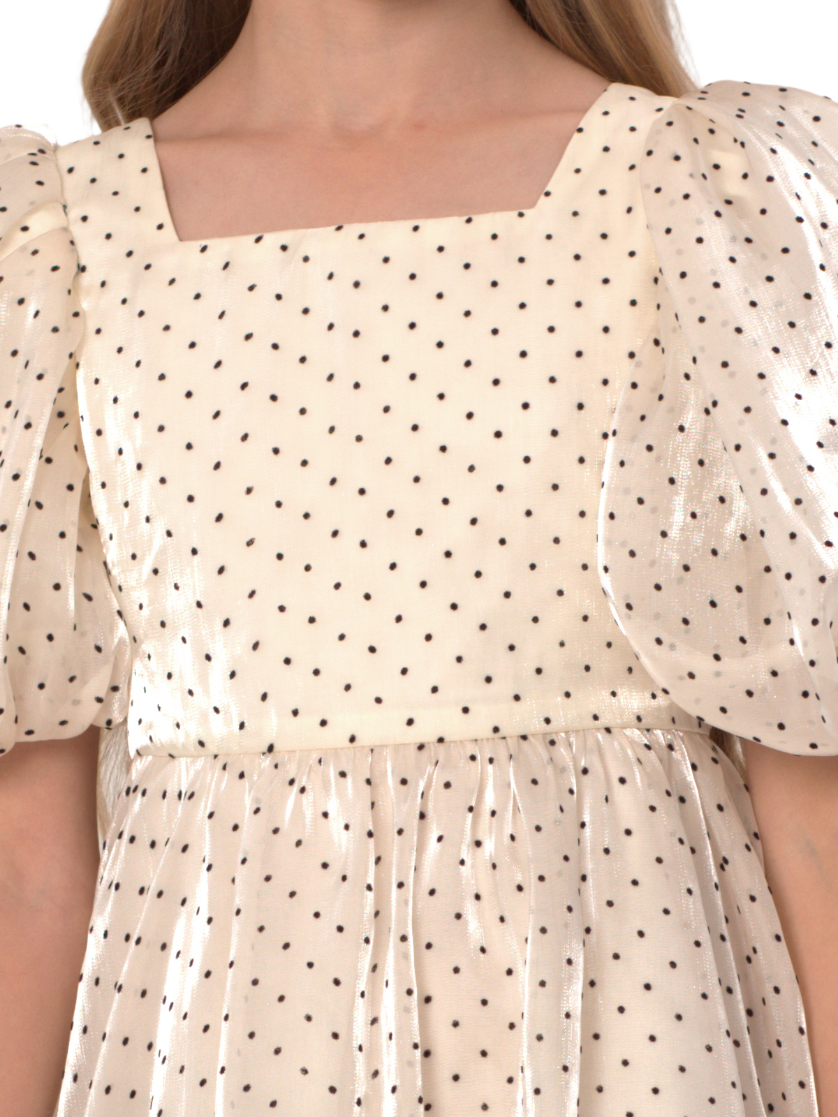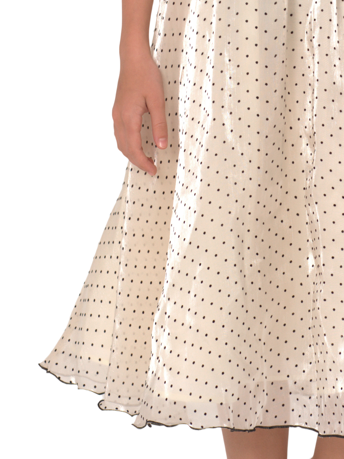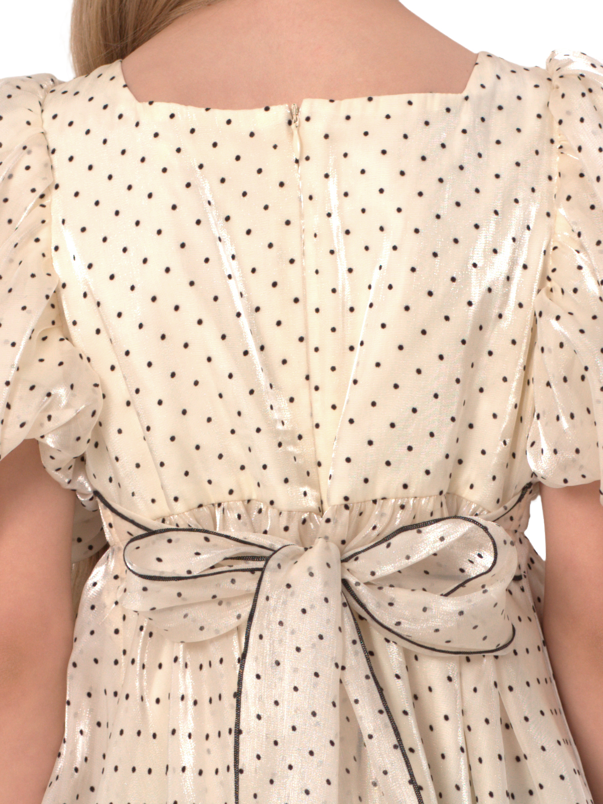 Нарядное платье из органзы с рисунком флок; завышенная отрезная линия талии, расклешкнная удлиненная юбка; юбка со сборкой; рукава – баллон со складками; на спинке застёжка в виде длинной молнии, полупояса. Подкладка 100% хлопок.