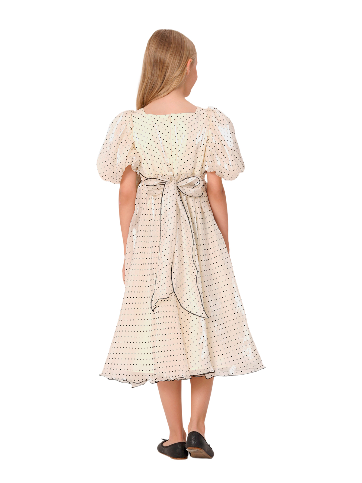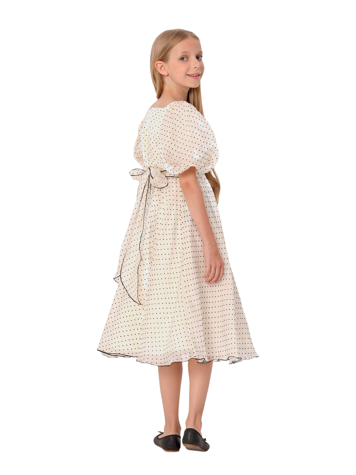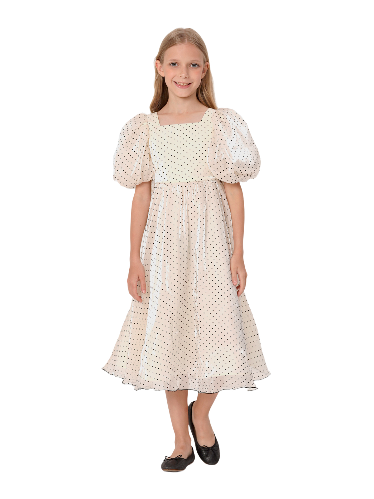 Нарядное платье из органзы с рисунком флок; завышенная отрезная линия талии, расклешкнная удлиненная юбка; юбка со сборкой; рукава – баллон со складками; на спинке застёжка в виде длинной молнии, полупояса. Подкладка 100% хлопок.