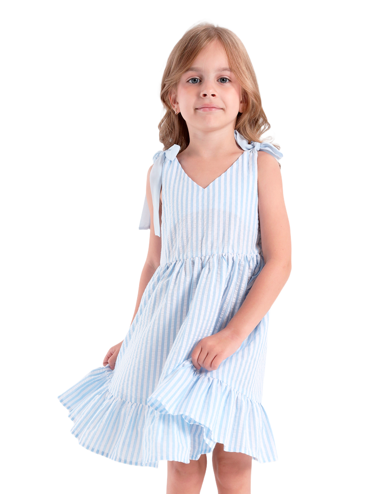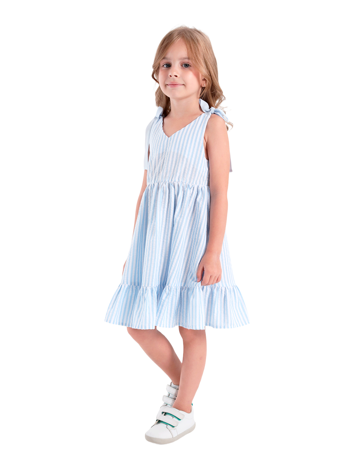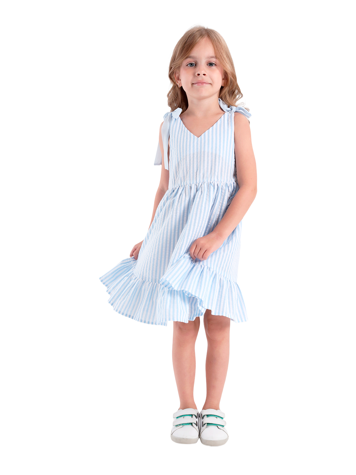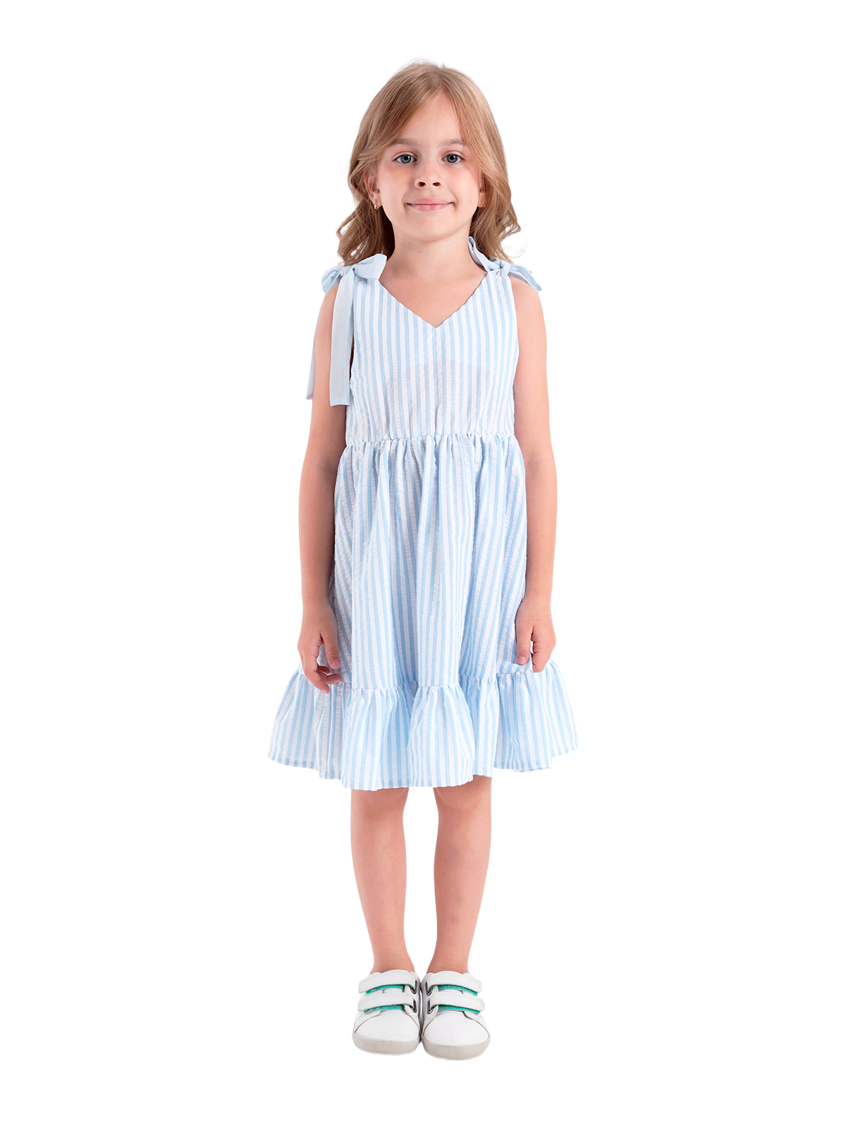 Сарафан из хлопка с рисунком в полоску на завязывающихся бретельках, отрезная завышенная линия талии, юбка со сборкой, на линии талии эластичная лента, V-образная горловина, по низу изделия притачивается оборка.