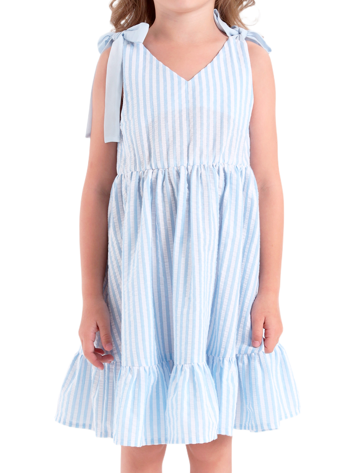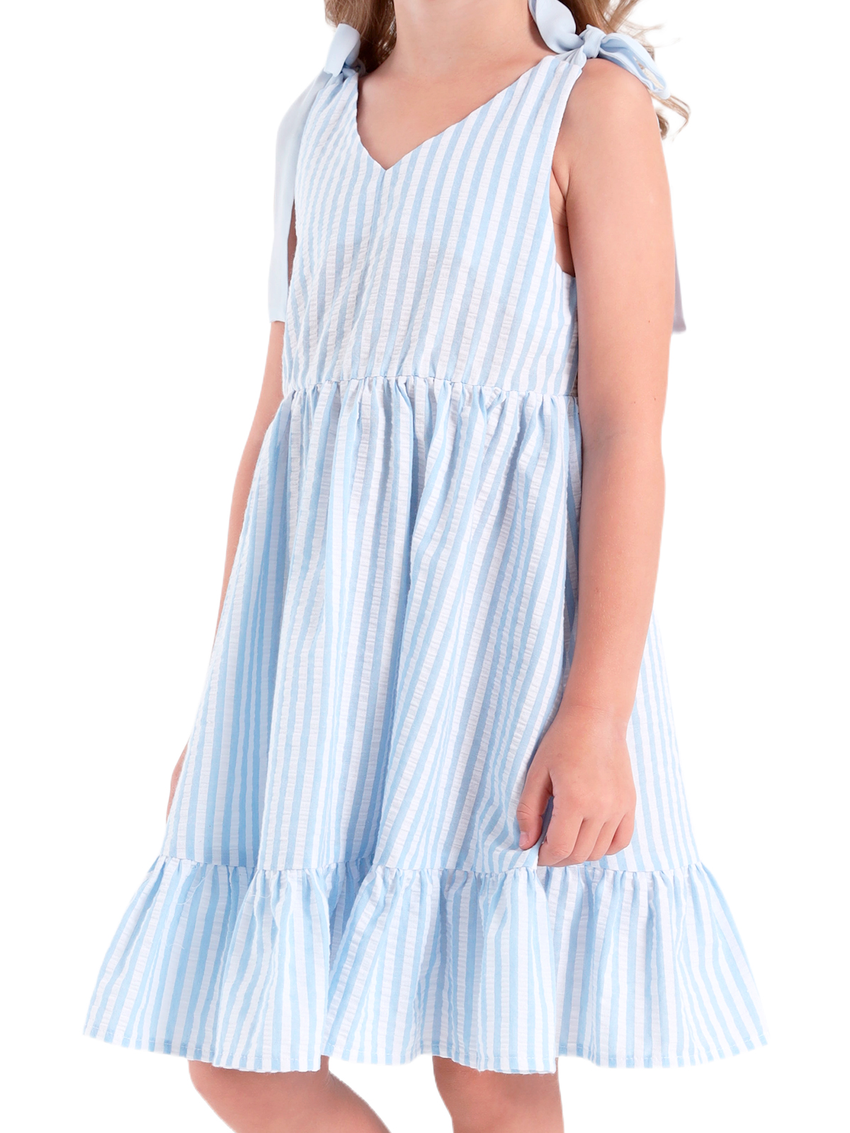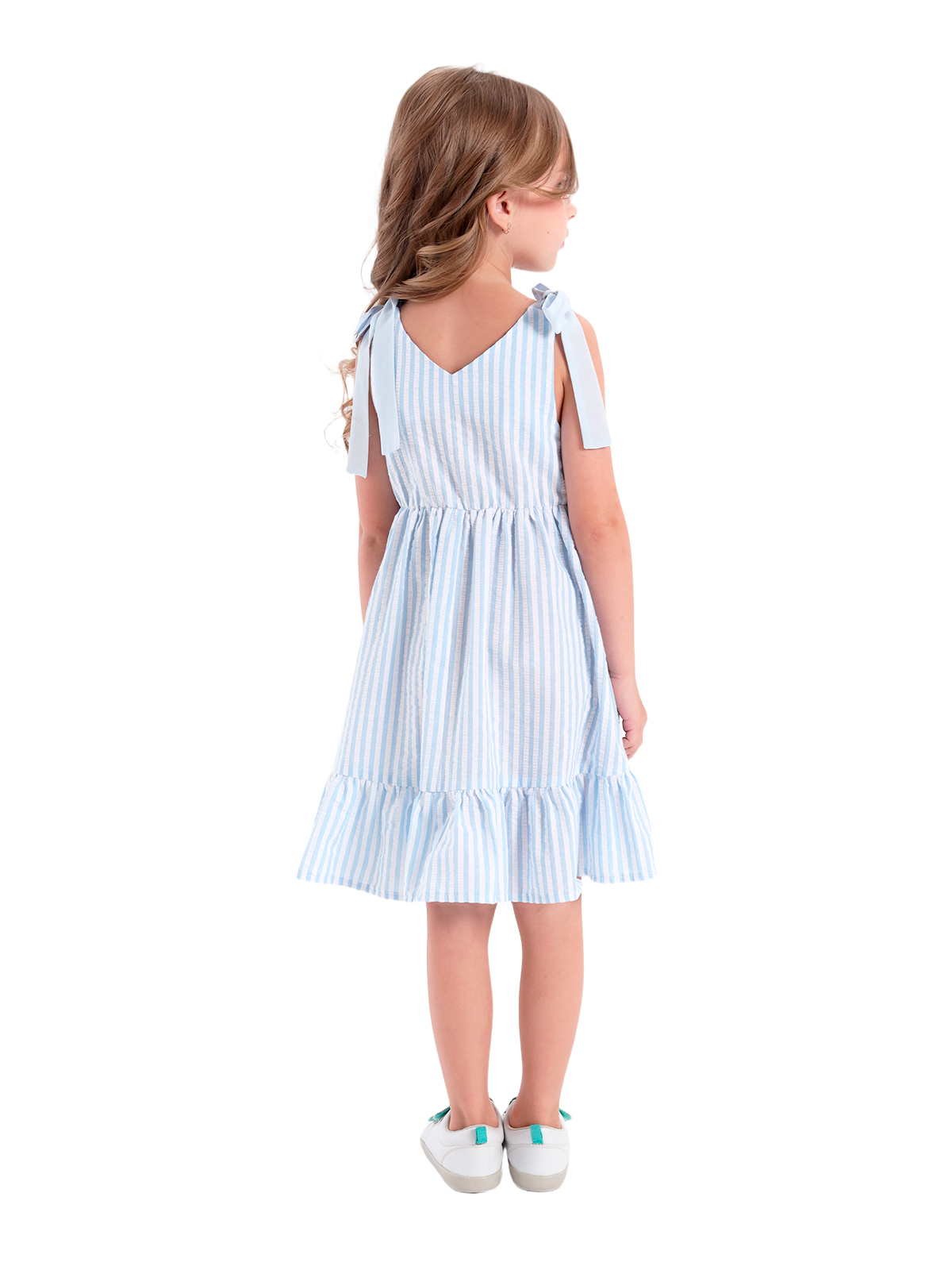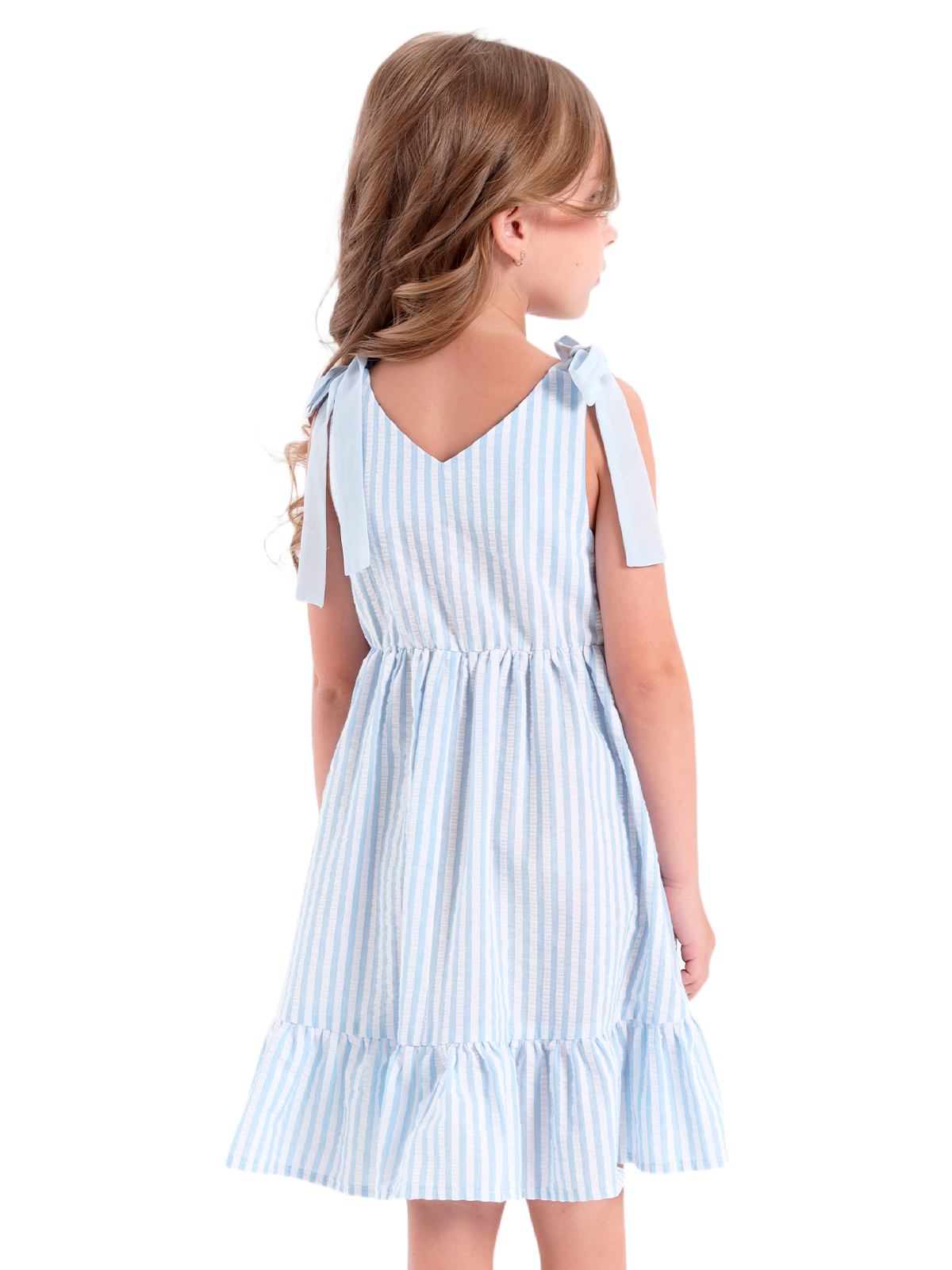 Сарафан из хлопка с рисунком в полоску на завязывающихся бретельках, отрезная завышенная линия талии, юбка со сборкой, на линии талии эластичная лента, V-образная горловина, по низу изделия притачивается оборка.