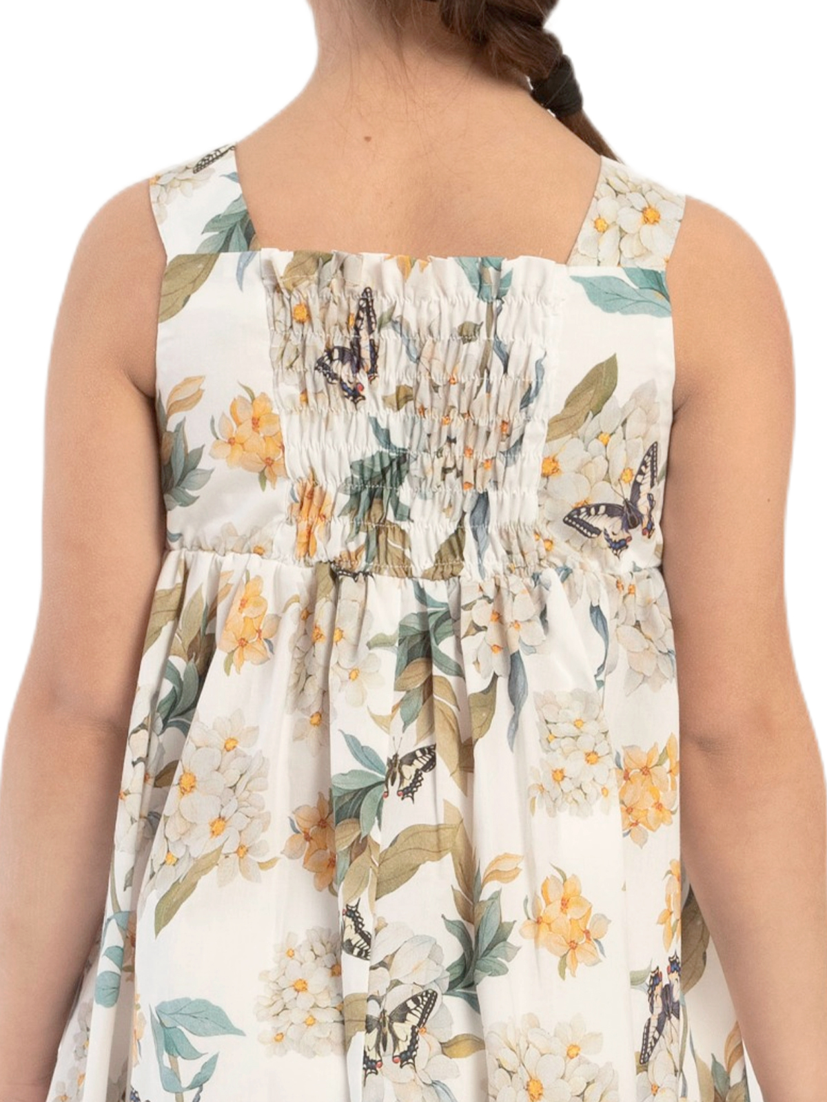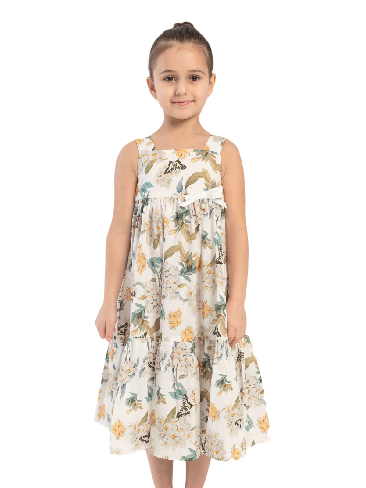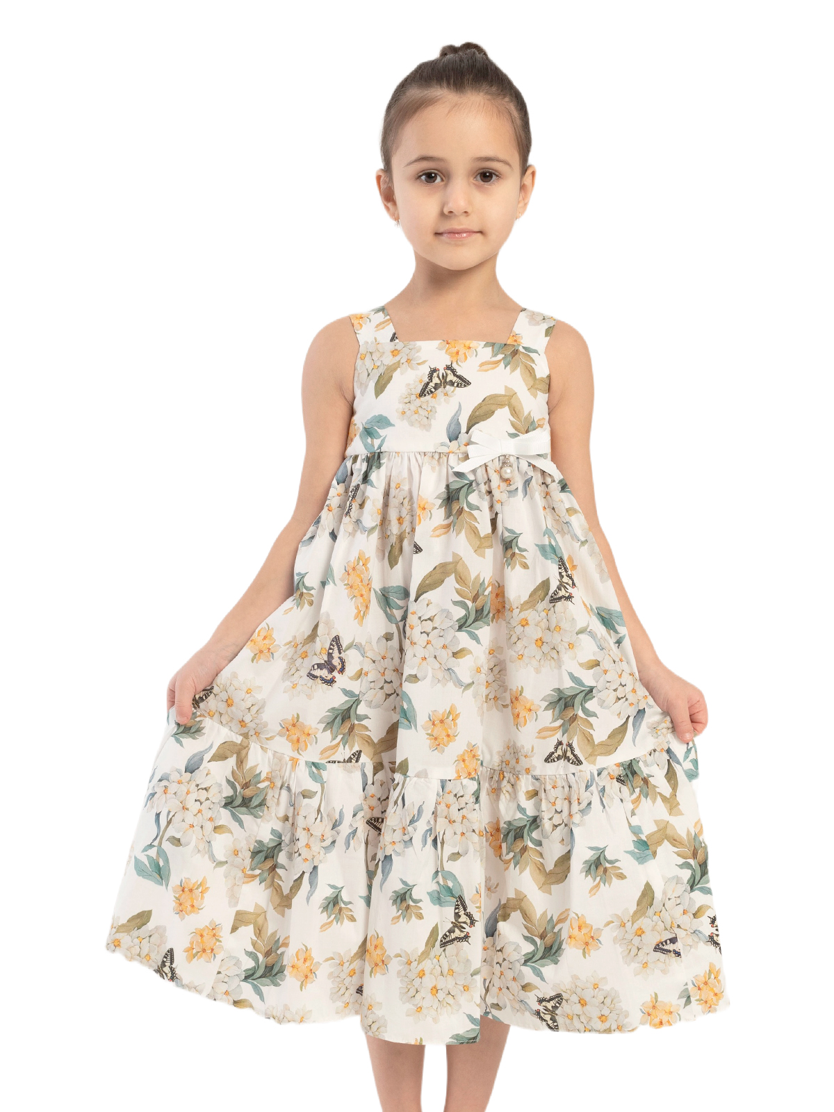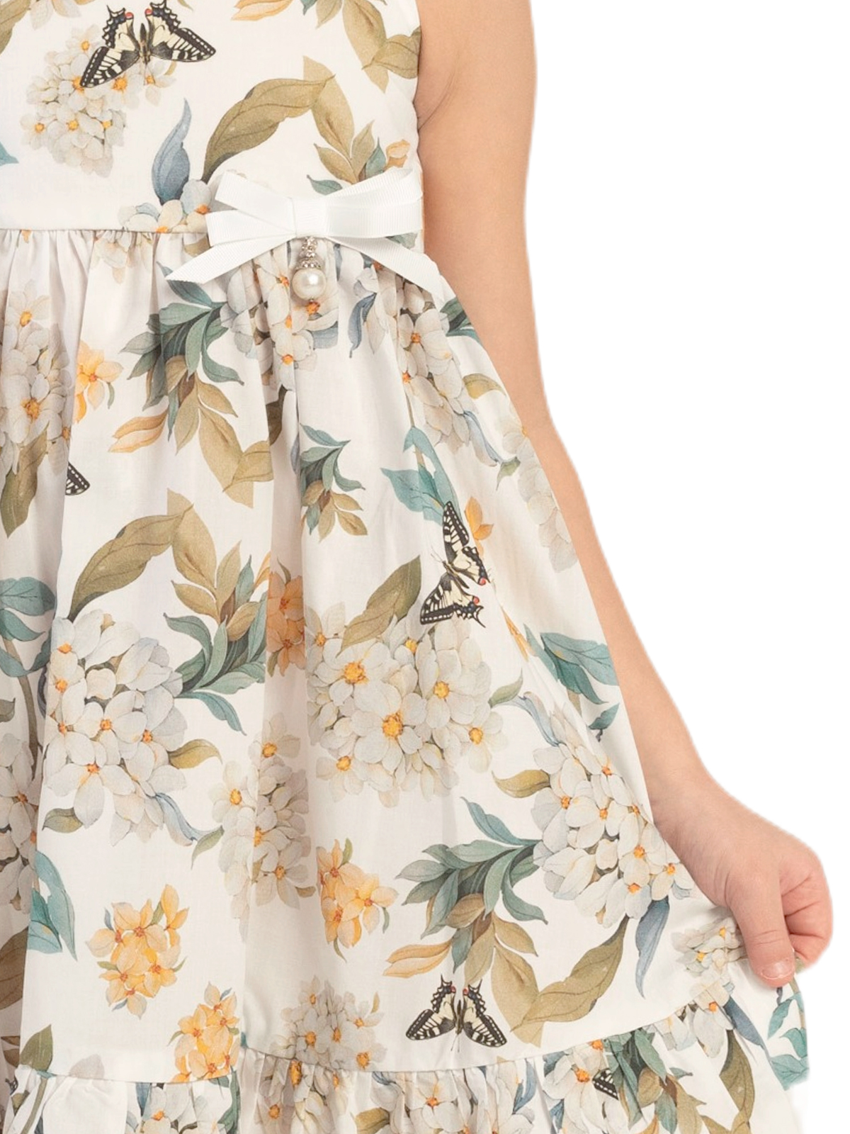 Сарафан из тонкого хлопка с дизайнерским принтом, трапециевидного силуэта, широкие бретели, украшение, завышенная отрезная линия талии, юбка со сборкой и широкой притачной оборкой по низу, на спинке вставка с резинками.