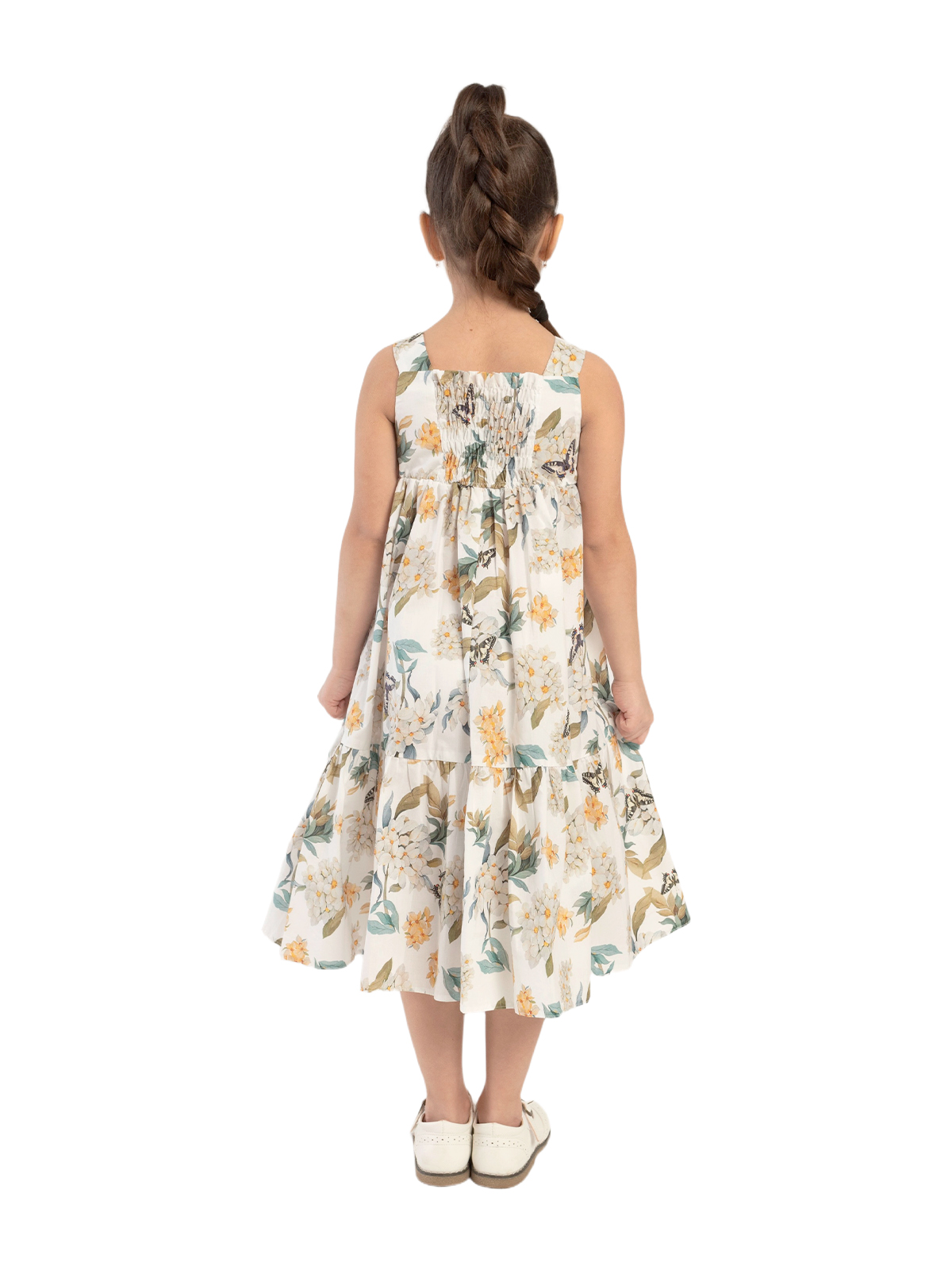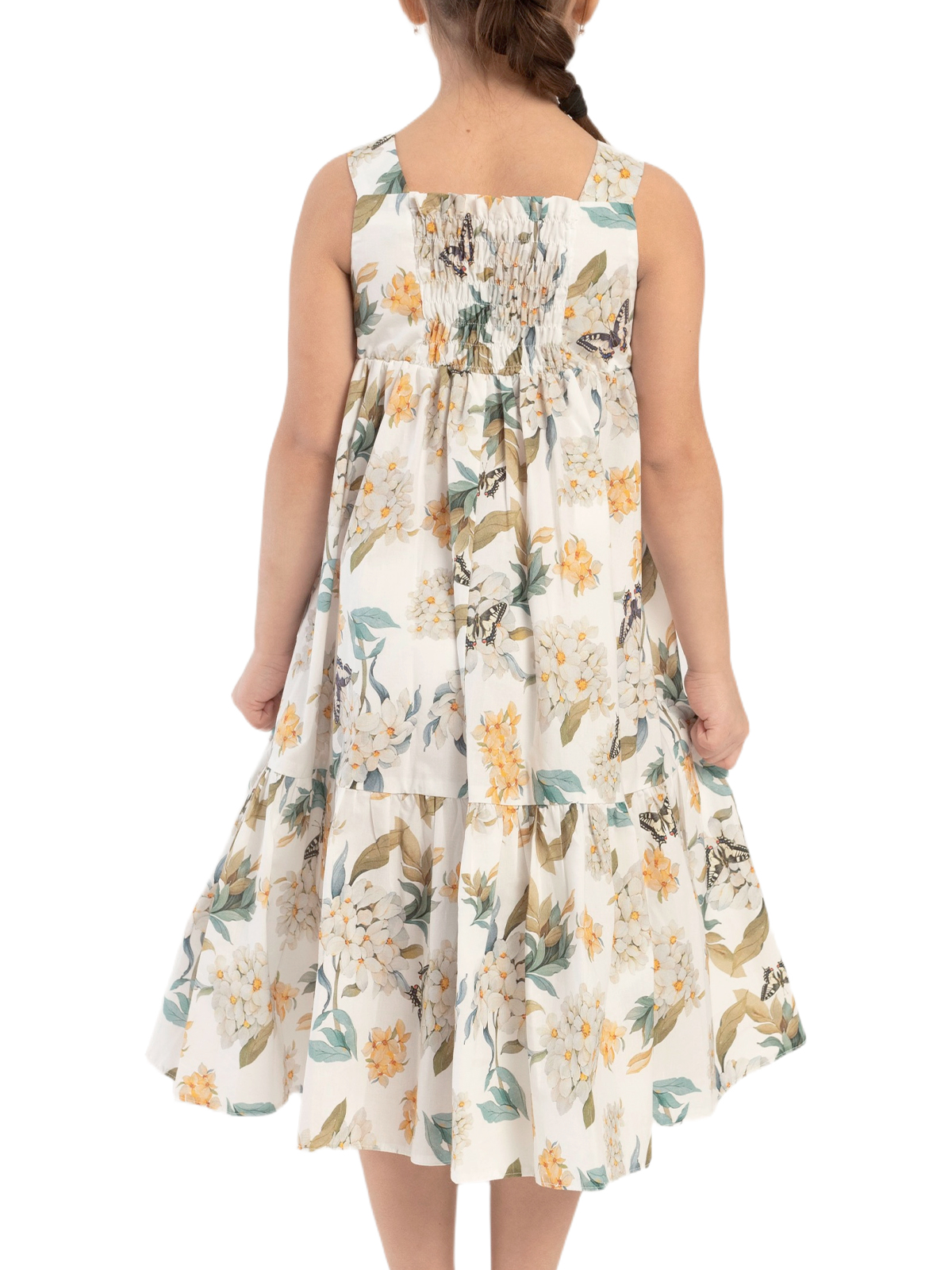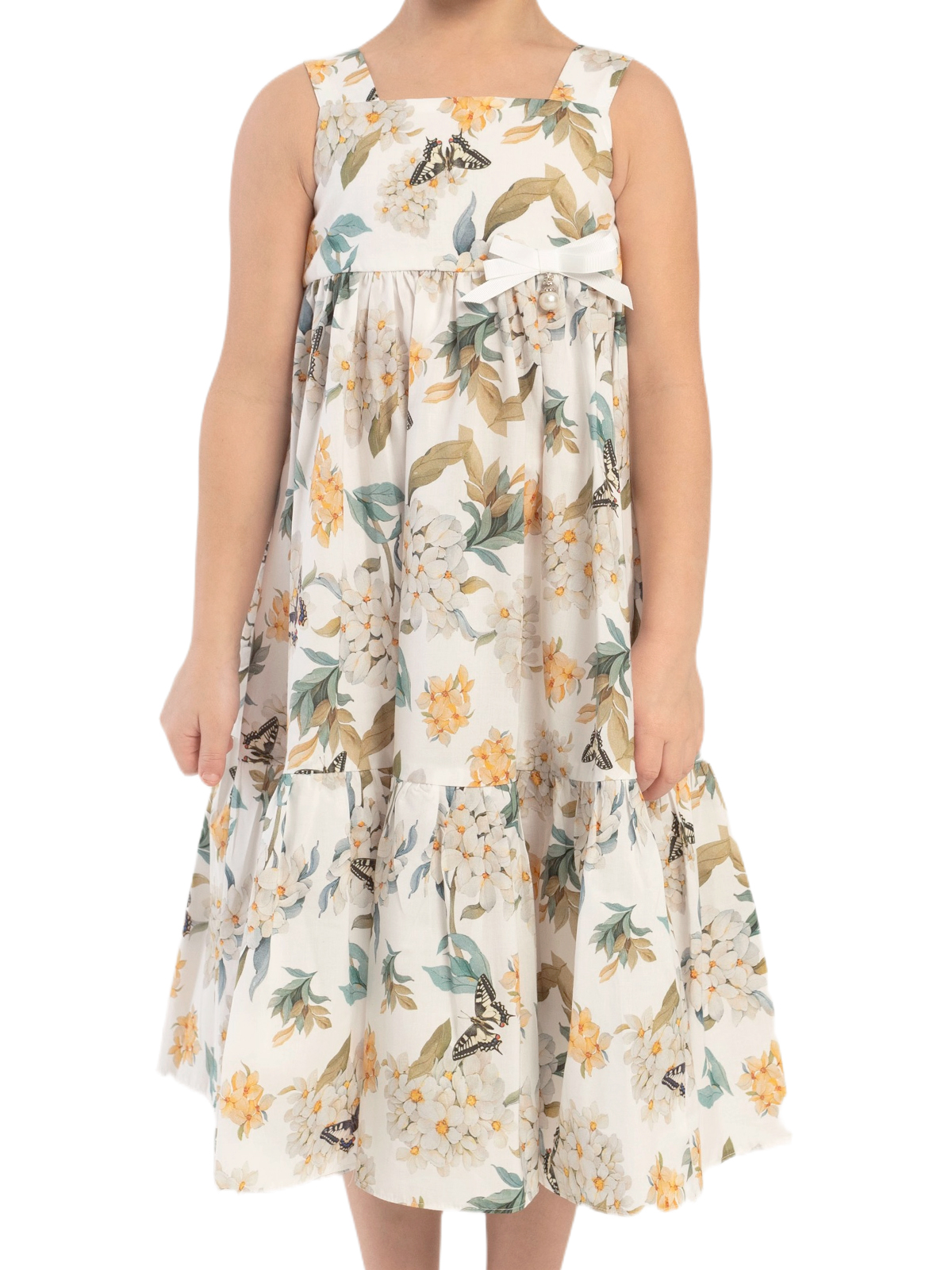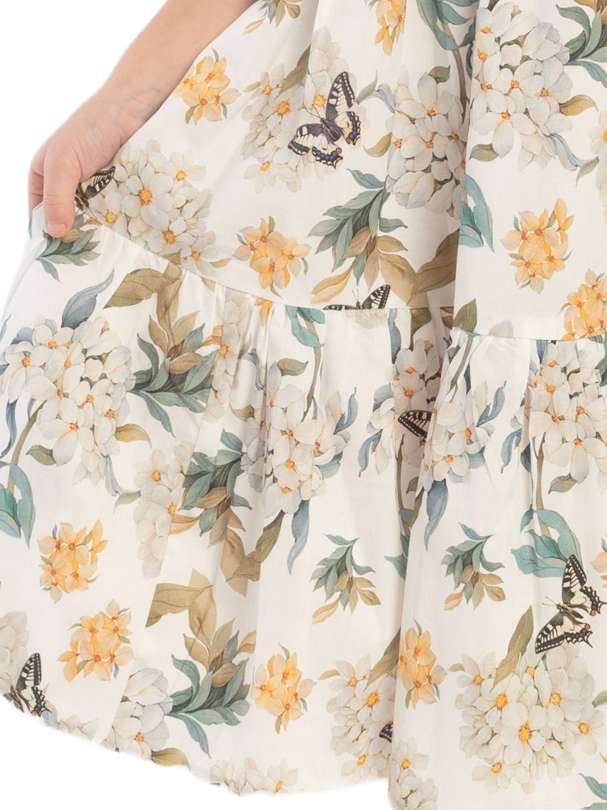 Сарафан из тонкого хлопка с дизайнерским принтом, трапециевидного силуэта, широкие бретели, украшение, завышенная отрезная линия талии, юбка со сборкой и широкой притачной оборкой по низу, на спинке вставка с резинками.