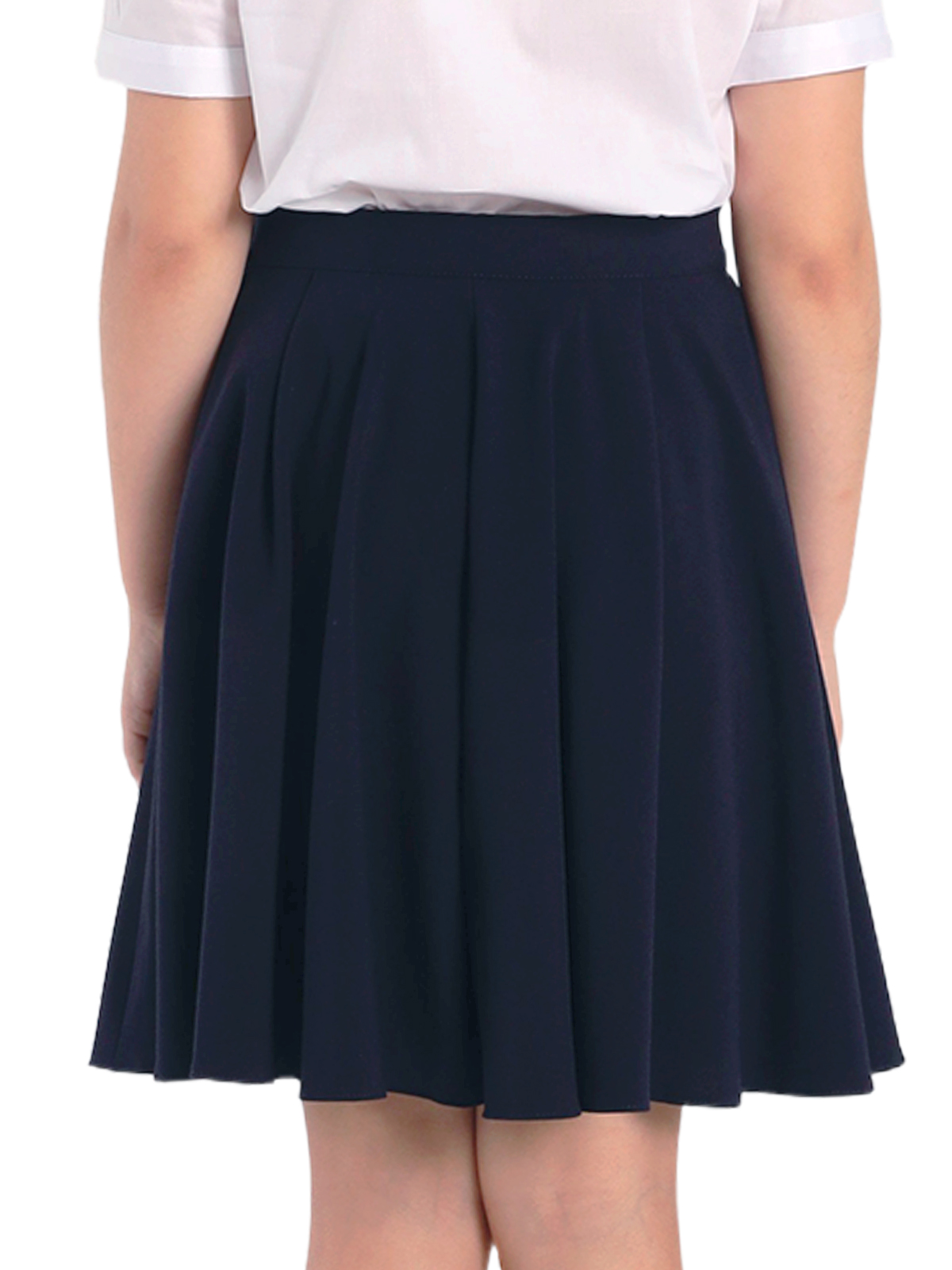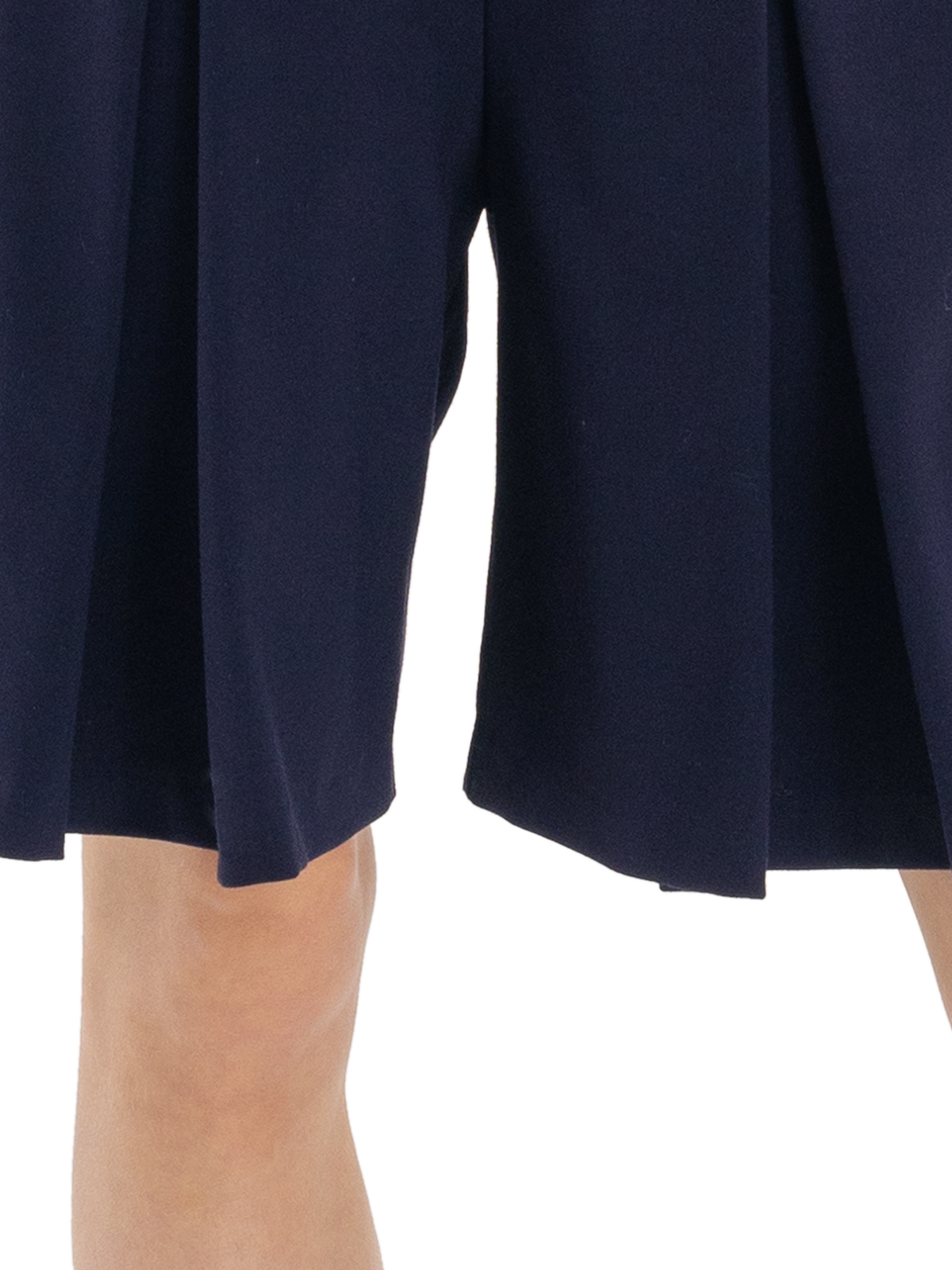 Юбка-шорты из костюмной ткани с мягкими заложенными складками, силуэт «солнце», в левом боковом шве застежка на пуговицу и молнию, притачной пояс, на спинке в поясе есть регулировка размера с помощью внутренней эластичной ленты на пуговице.