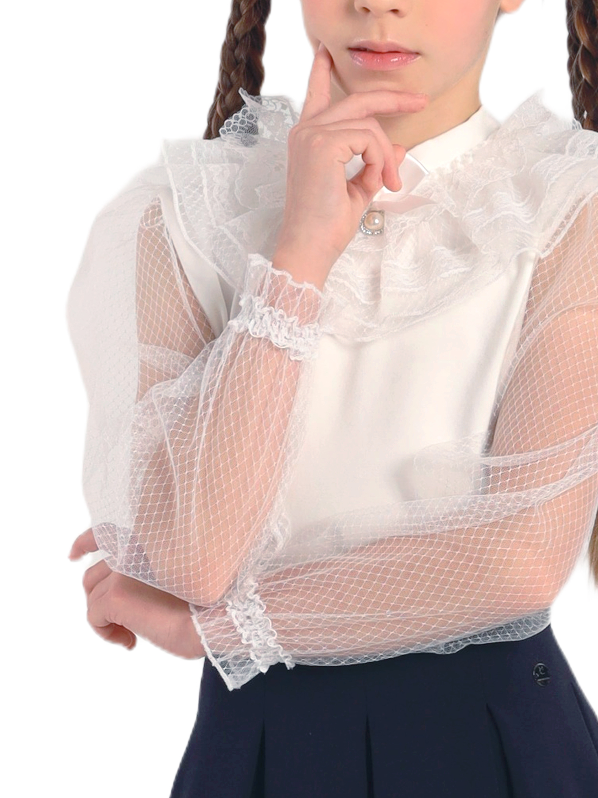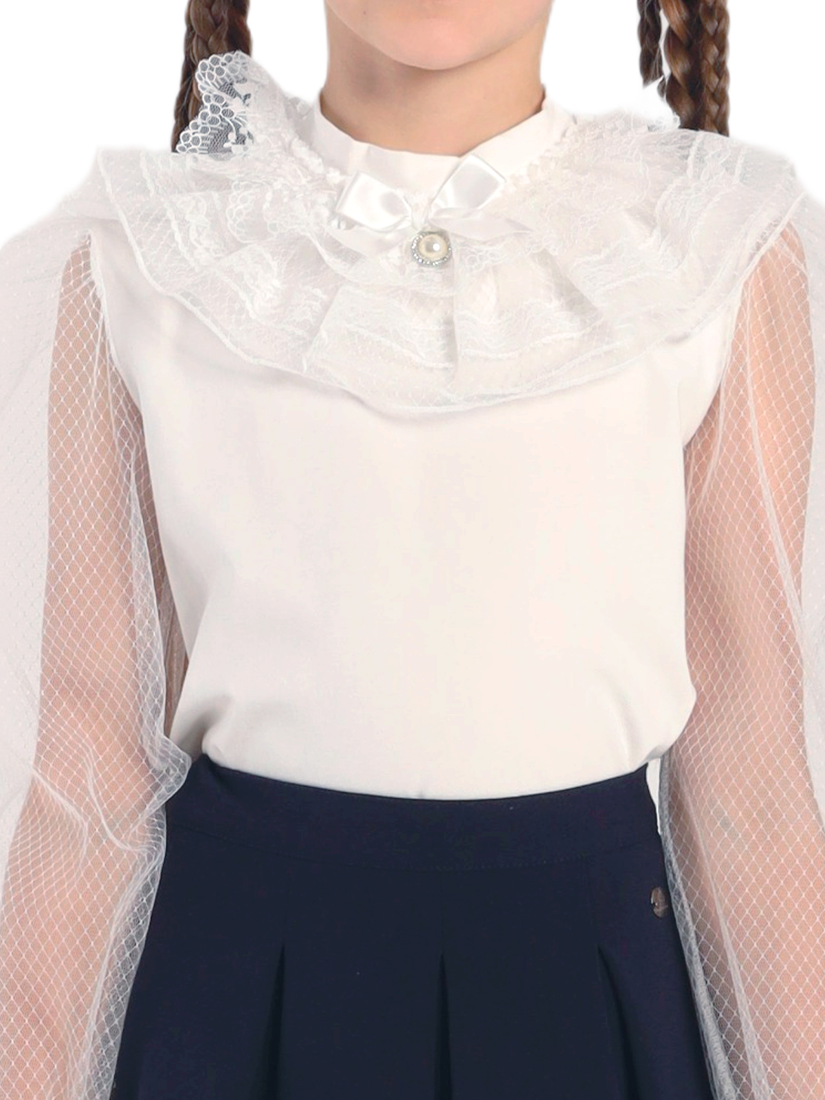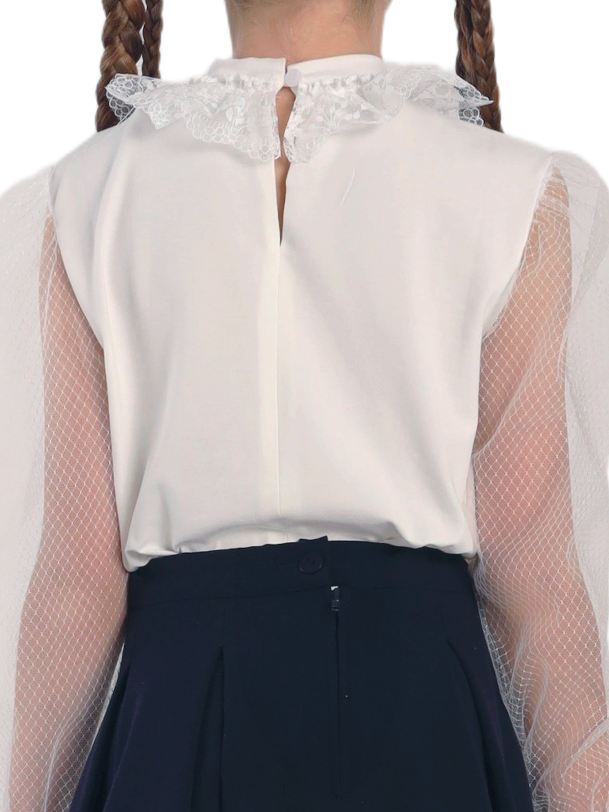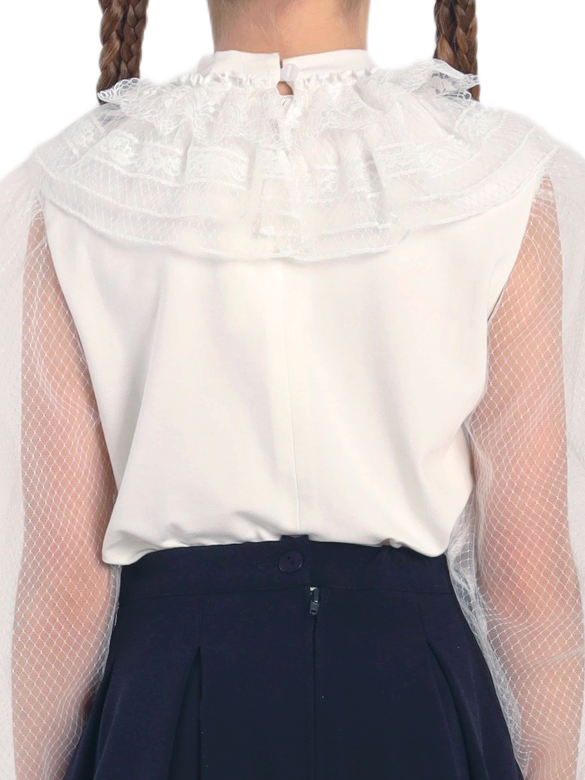 Джемпер из тонкого трикотажа, длинные рукава из ажурного фатина, на некотором расстоянии от низа настрочена эластичная лента с кружевом, воротник стойка, по низу стойки настрачивается кружево со сборкой и декоративным украшением. У джемпера есть съемный воротник из ажурного фатина.