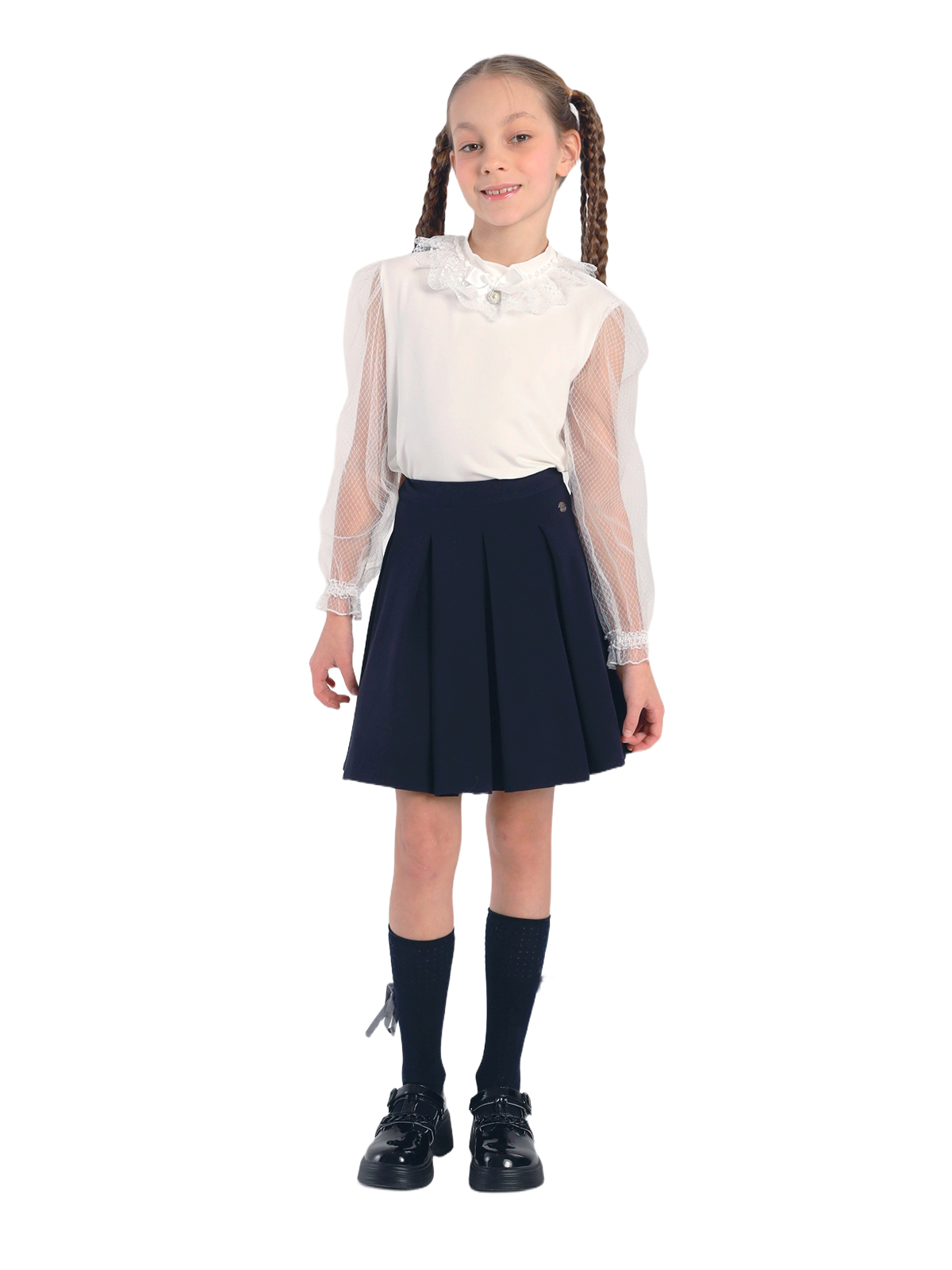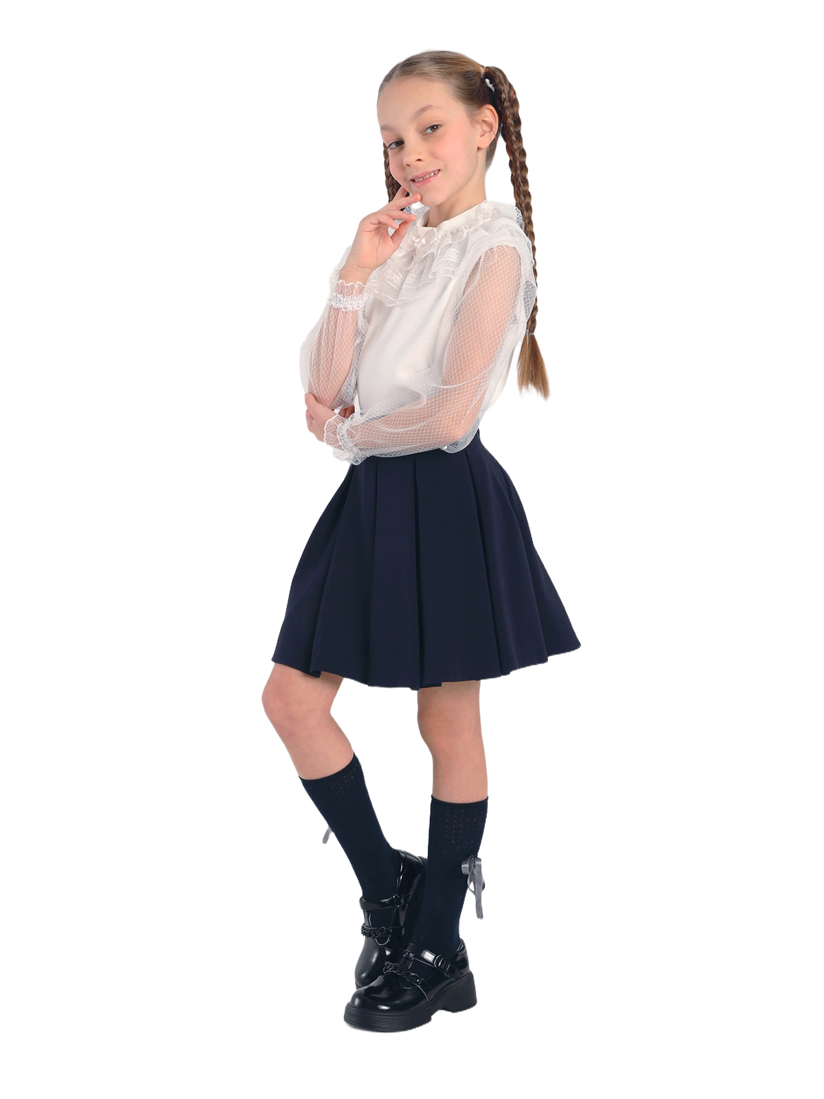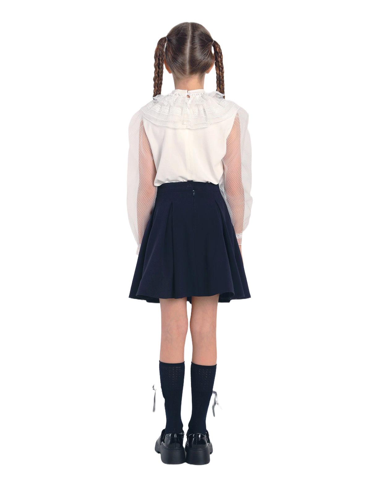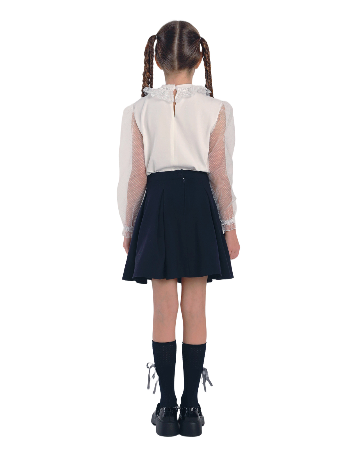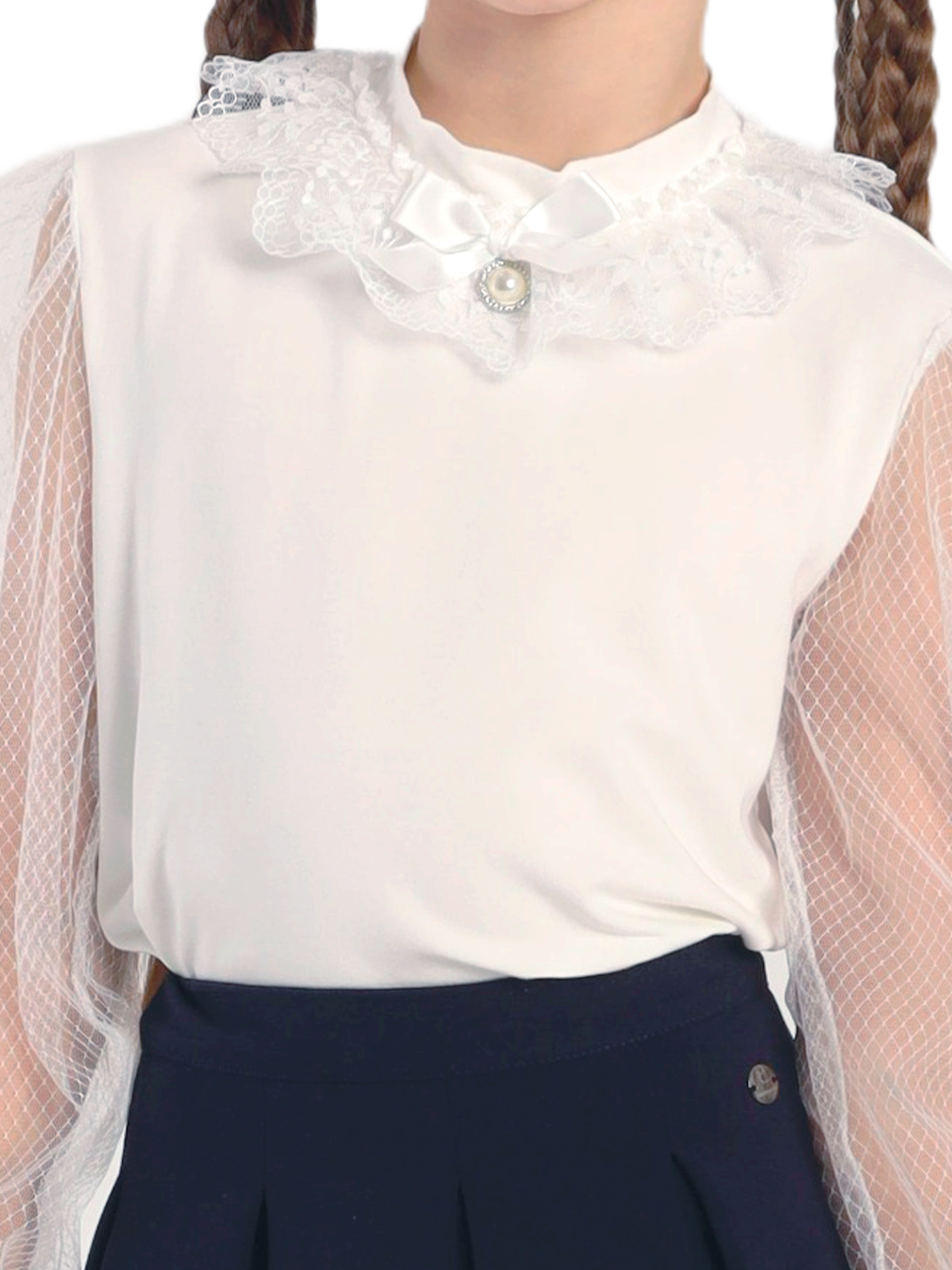 Джемпер из тонкого трикотажа, длинные рукава из ажурного фатина, на некотором расстоянии от низа настрочена эластичная лента с кружевом, воротник стойка, по низу стойки настрачивается кружево со сборкой и декоративным украшением. У джемпера есть съемный воротник из ажурного фатина.
