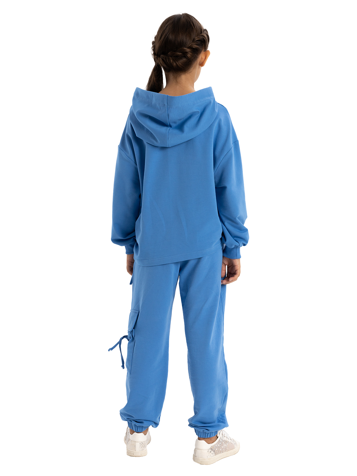Свободные брюки в спортивном стиле из плотного трикотажа, притачной пояс с эластичной лентой и кулисой, низ изделия на резинке, на левой половинке карман с кулисой и клапаном, на передних половинках карманы с отрезными деталями.