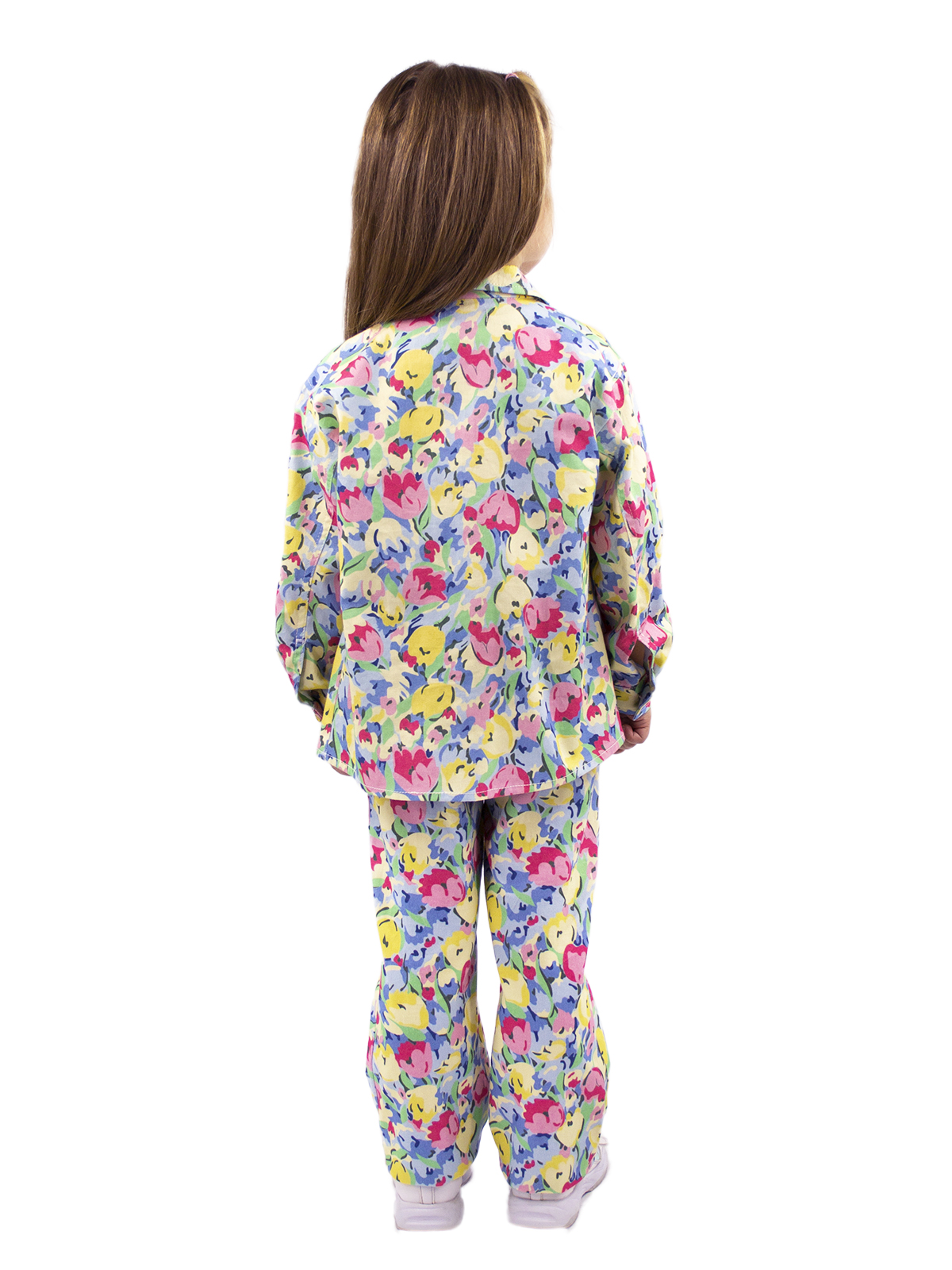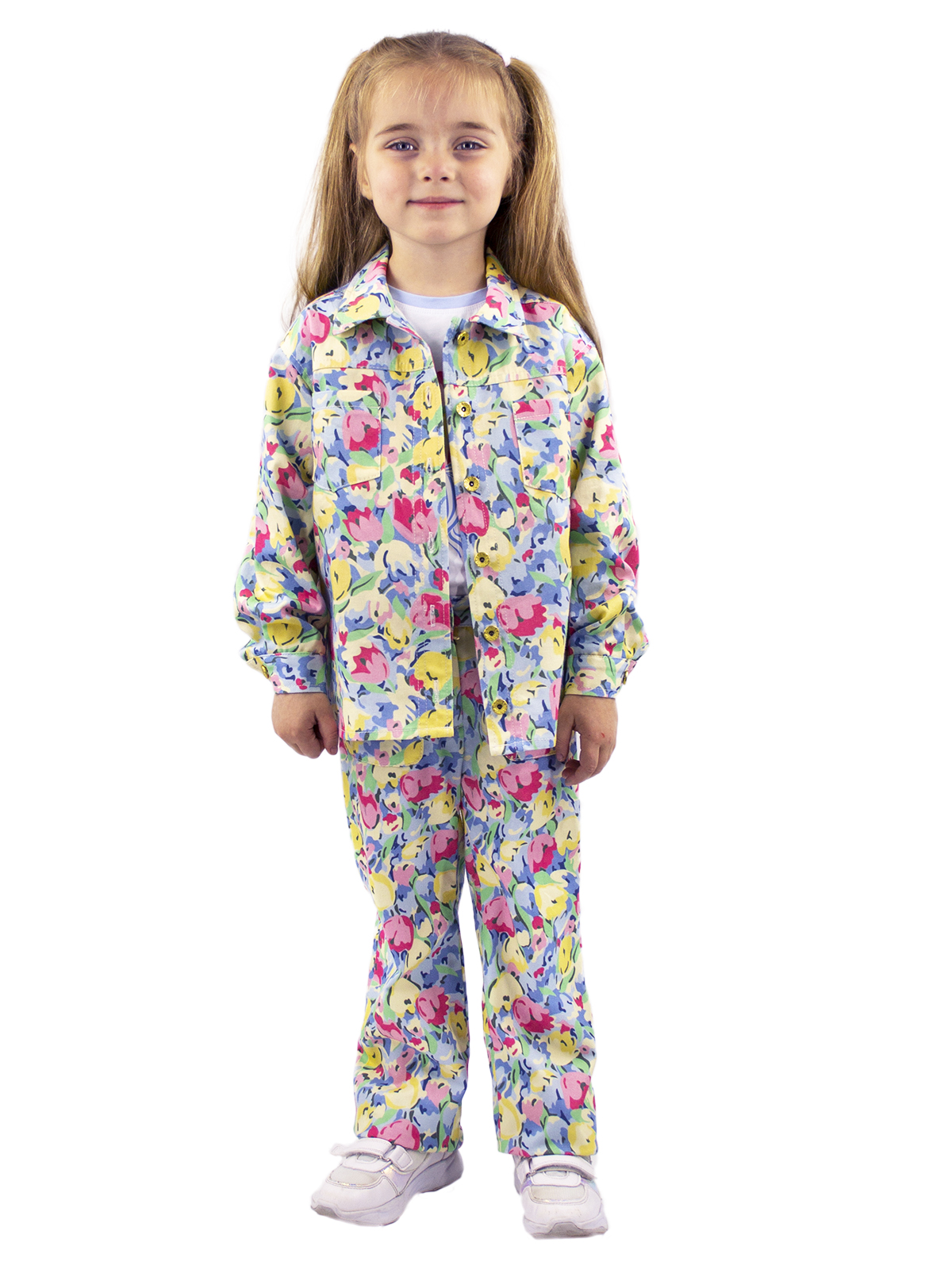 Куртка - рубашка из плотного хлопка с дизайнерским принтом, спущенное плечо, длинные рукава с притачными манжетами, воротник на цельнокроеной стойке, спереди кокетка, два кармана, застежка на джинсовые пуговицы.