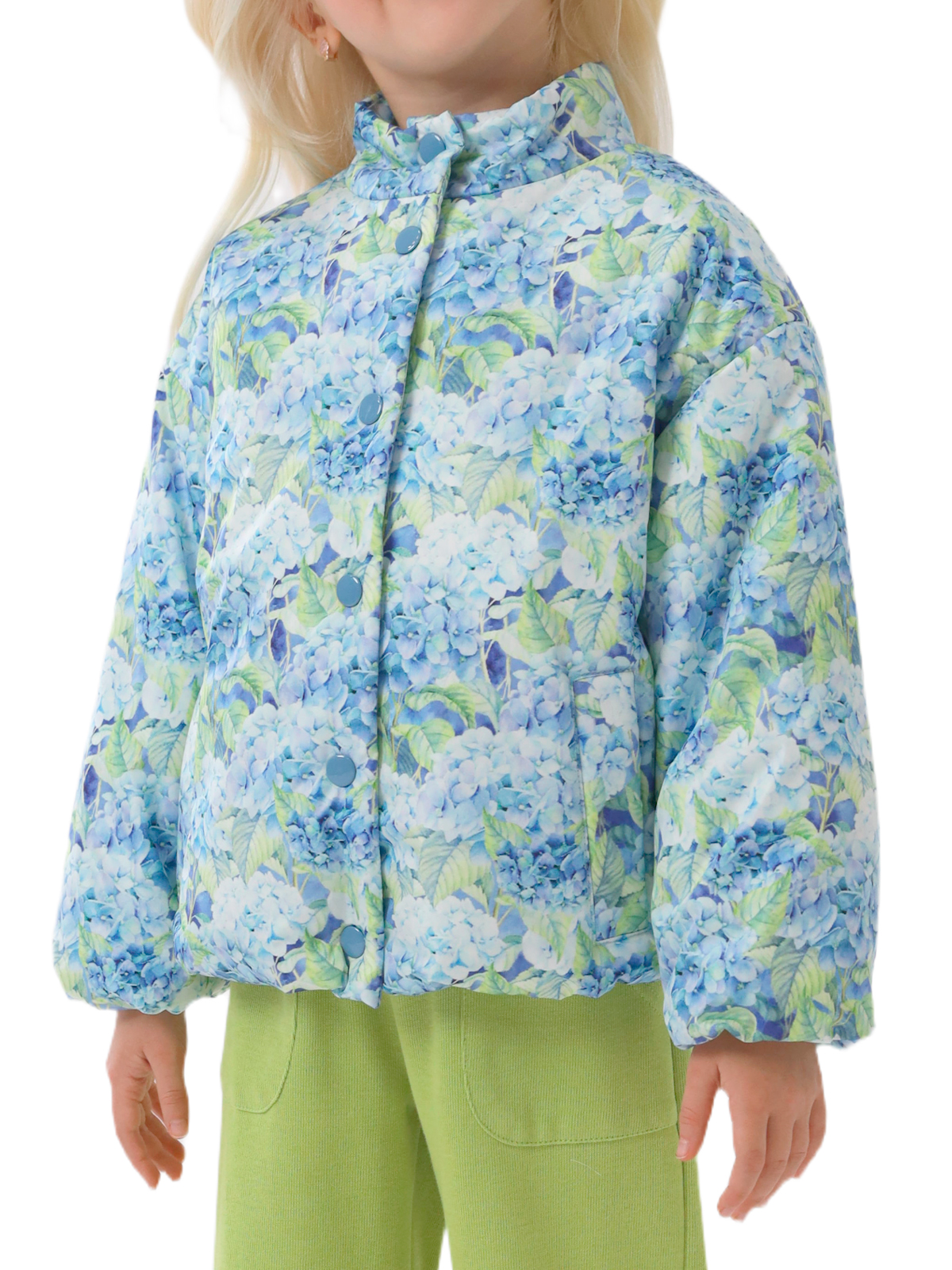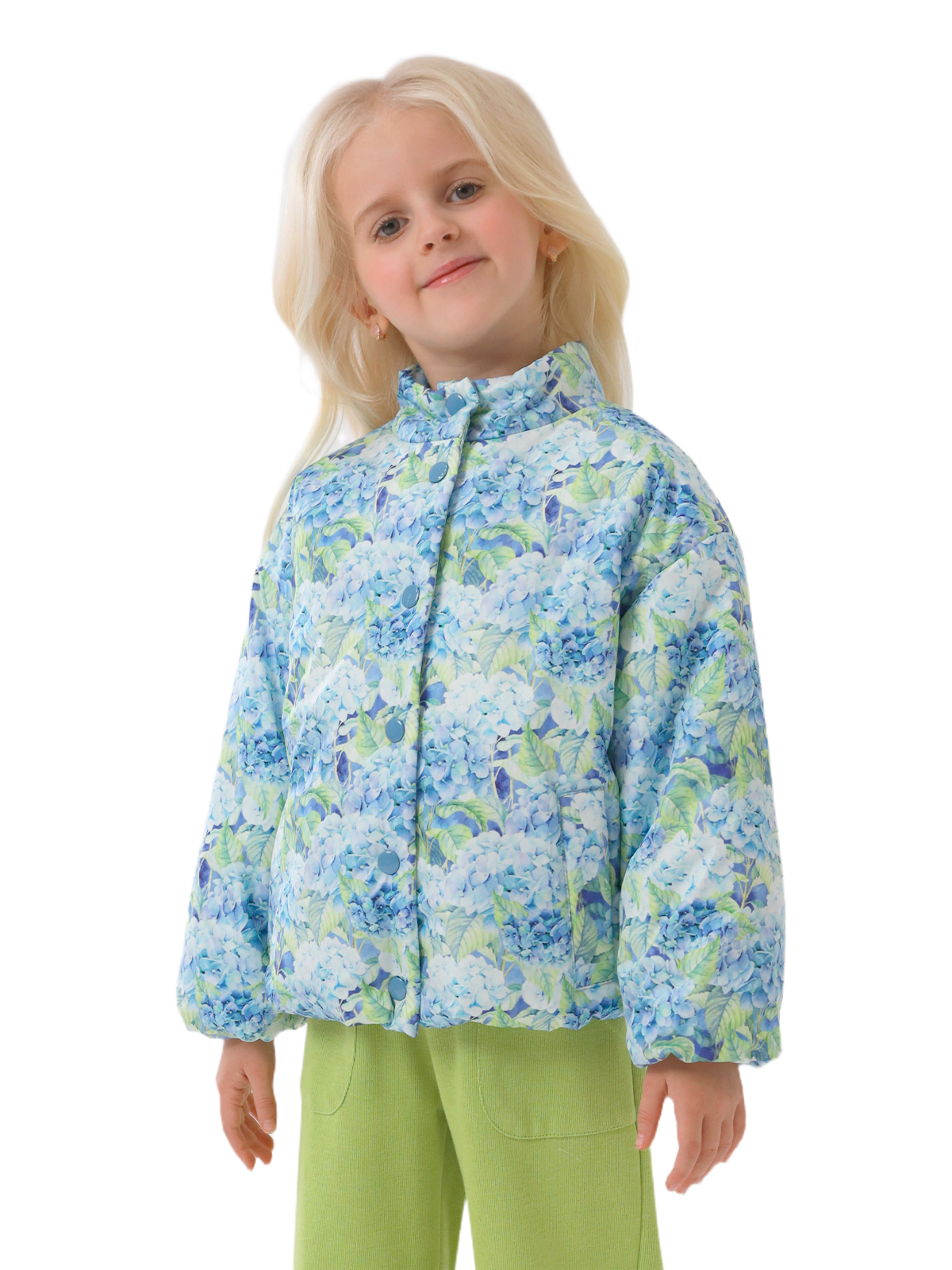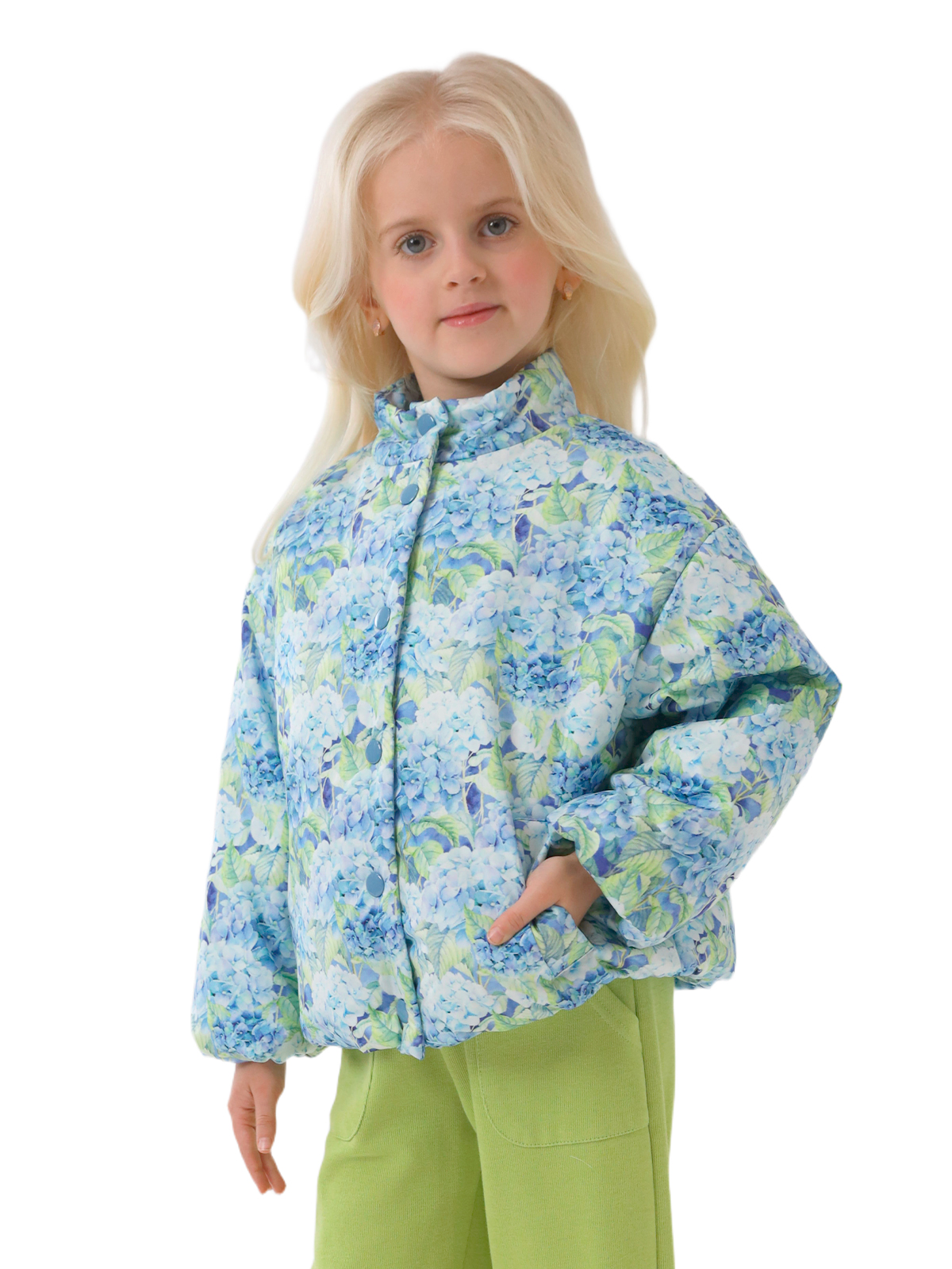 Куртка выполнена из непромокаемой плащевой ткани с дизайнерским рисунком, наполнитель холлофайбер 100 г/кв. м. Изделие рекомендуем носить от + 10°С до + 5°С., куртка имеет воротник стойку, застежка на кнопки, на полочках карманы с листочкой, длинные рукава со сборкой, по низу изделия эластичная лента, что создает эффект баллона, изделие на подкладке.Подкладка 100% хлопок.