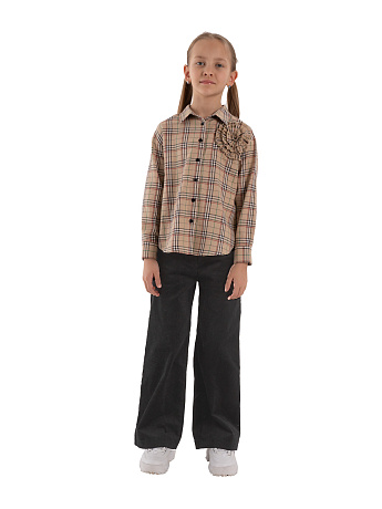 Куртка из плотного вельвета с крупным рубчиком с рисунком, застежка на джинсовые пуговицы, длинные рукава со сборкой с притачными манжетами на застежке, отложной воротник с цельнокроенной стойкой, на правой полочке накладной карман с клапаном, на спинке кокетка и средний шов.