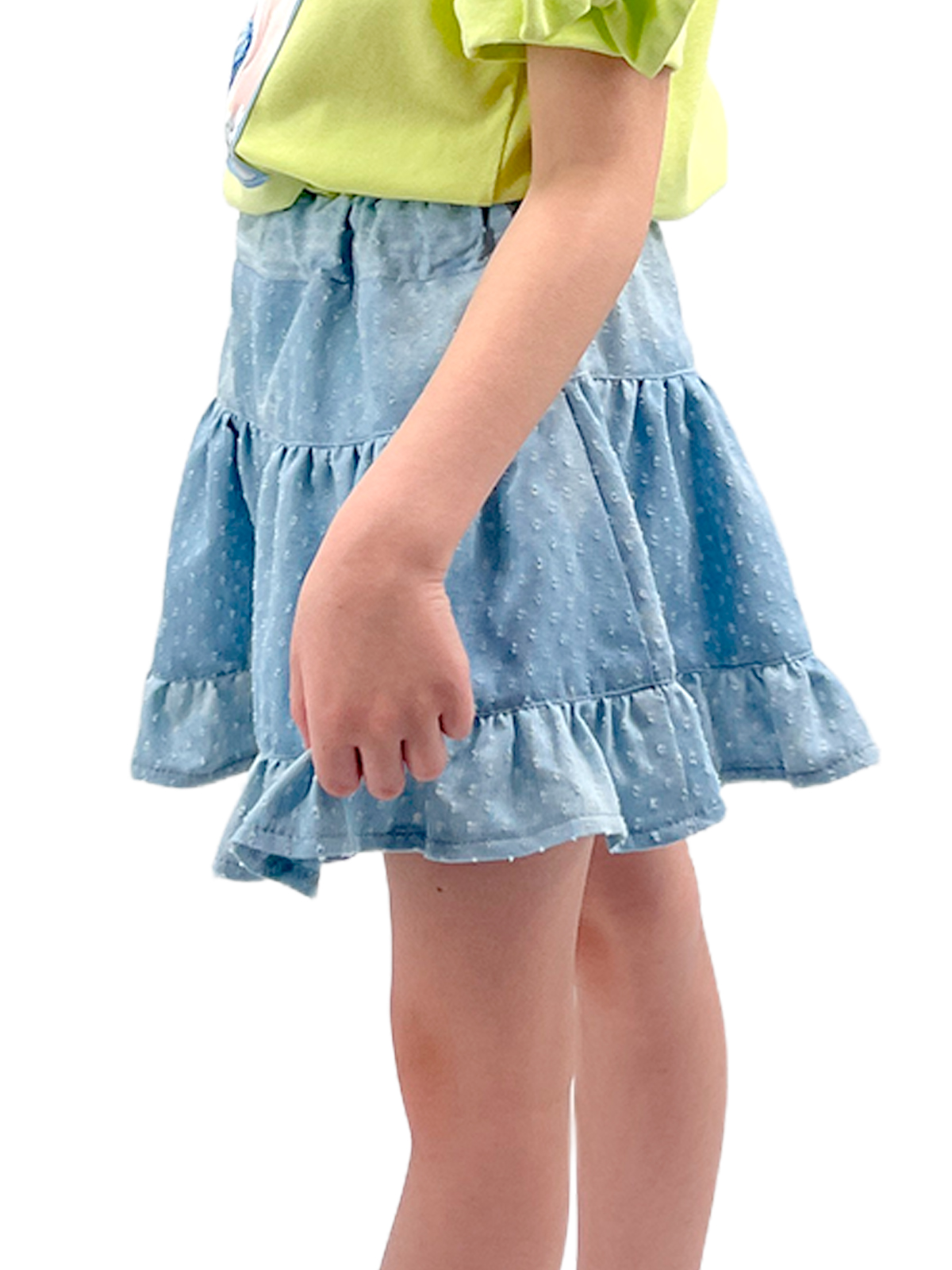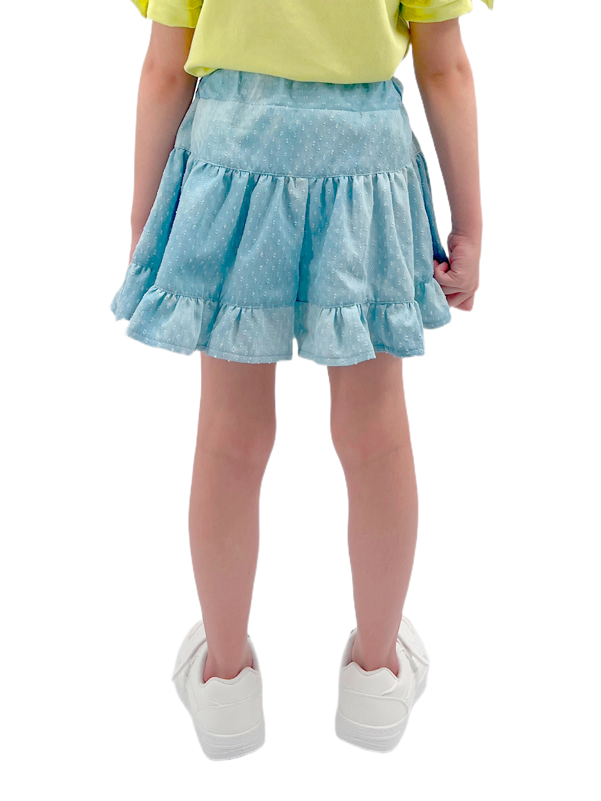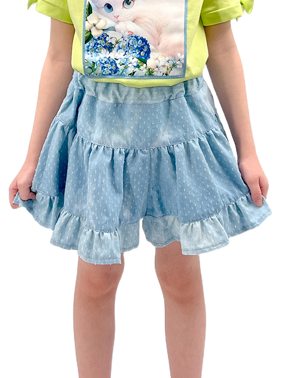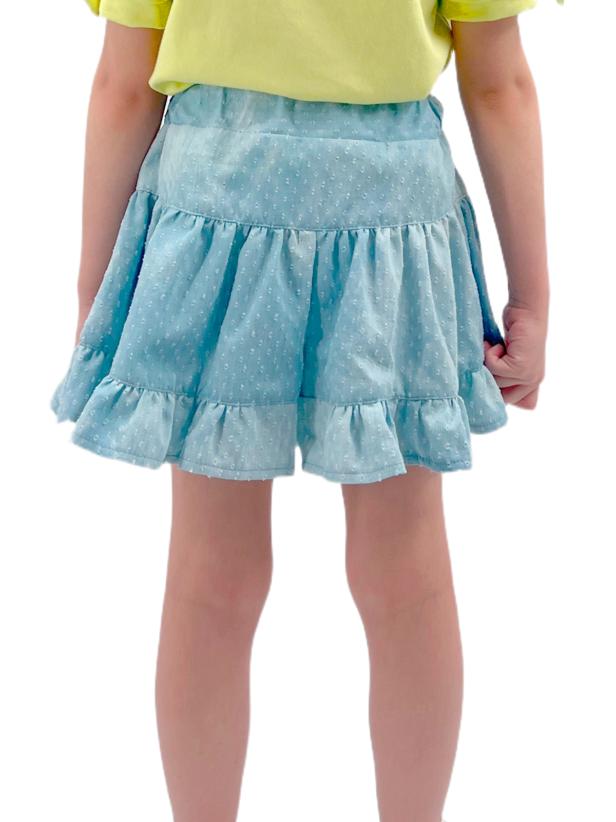 Юбка-шорты из легкой ткани, притачной пояс с эластичной лентой, по низу притачивается широкая оборка.